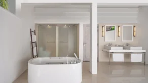 На 1-м этаже: спальня с кроватью king-size, ванная комната с душевой кабиной и джакузи частично на открытом воздухе, душ на открытом воздухе, терраса с бассейном.