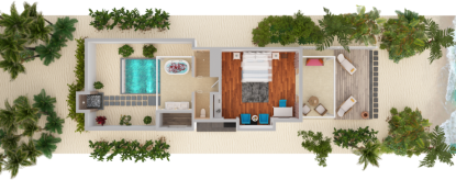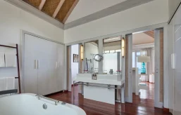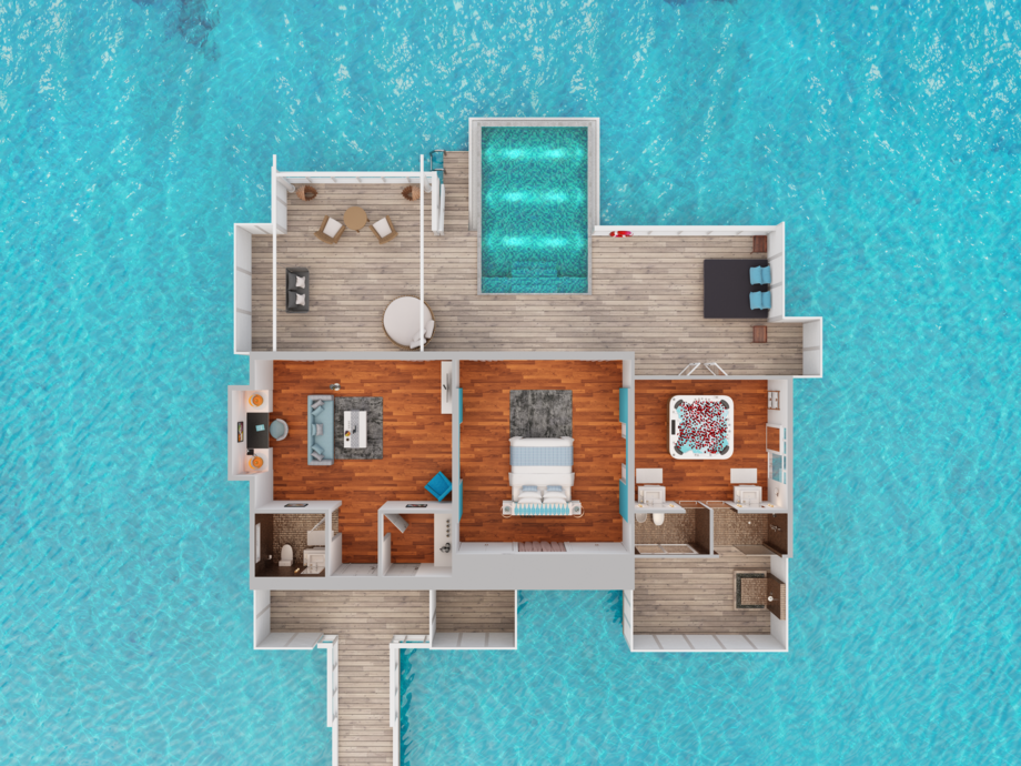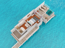 Вилла на воде. Спальня с кроватью king-size, гостиная, ванная комната с душевой кабиной и джакузи, гостевой туалет, душ на открытом воздухе, терраса с бассейном и прямым спуском к воде. Гостиная и спальня разделены дверью.