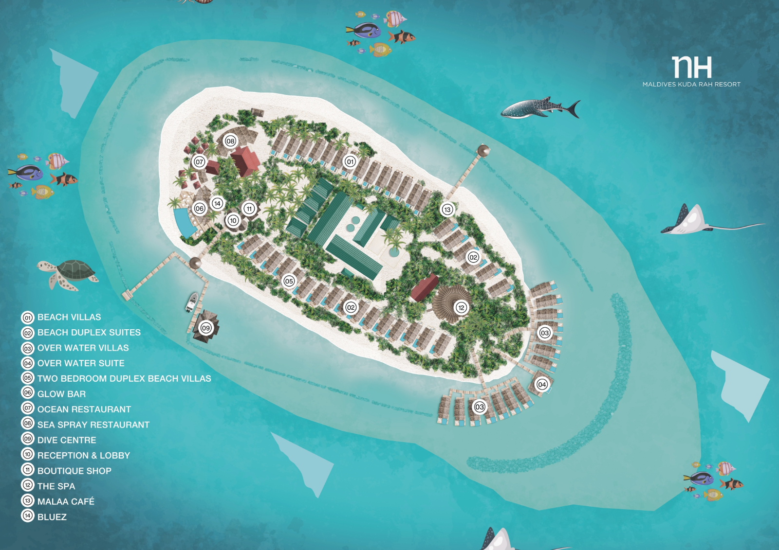 NH Maldives Kuda Rah Resort (ранее – Amaya Resort Kuda Rah Maldives) состоит из одноэтажных и двухэтажных вилл, размещённых на пляже и на воде; каждая оборудована собственным бассейном. Интерьеры выполнены в традиционной островной эстетике: светлая палитра, натуральные материалы, крыши, покрытые пальмовым листом.