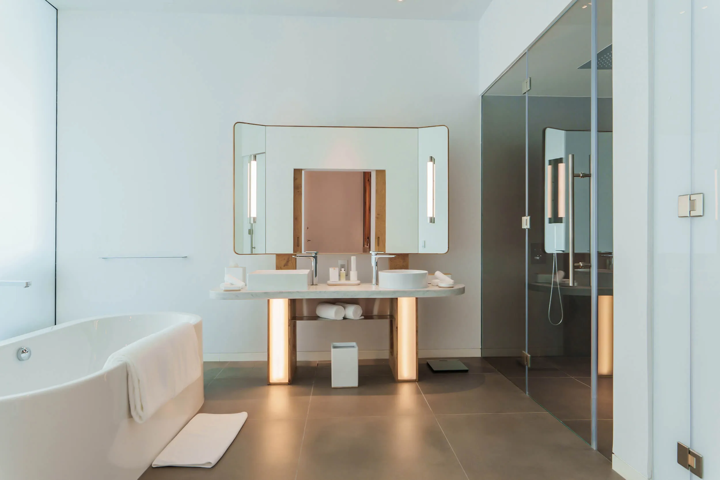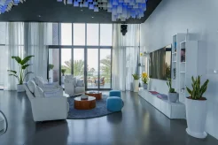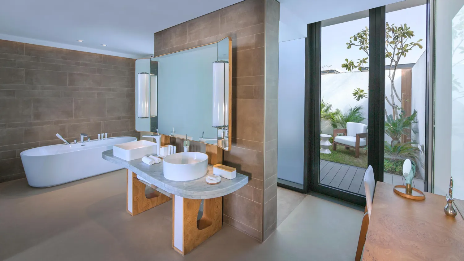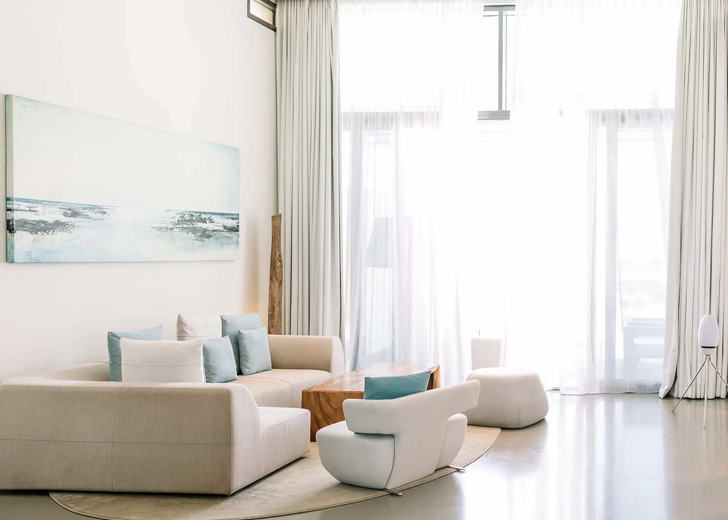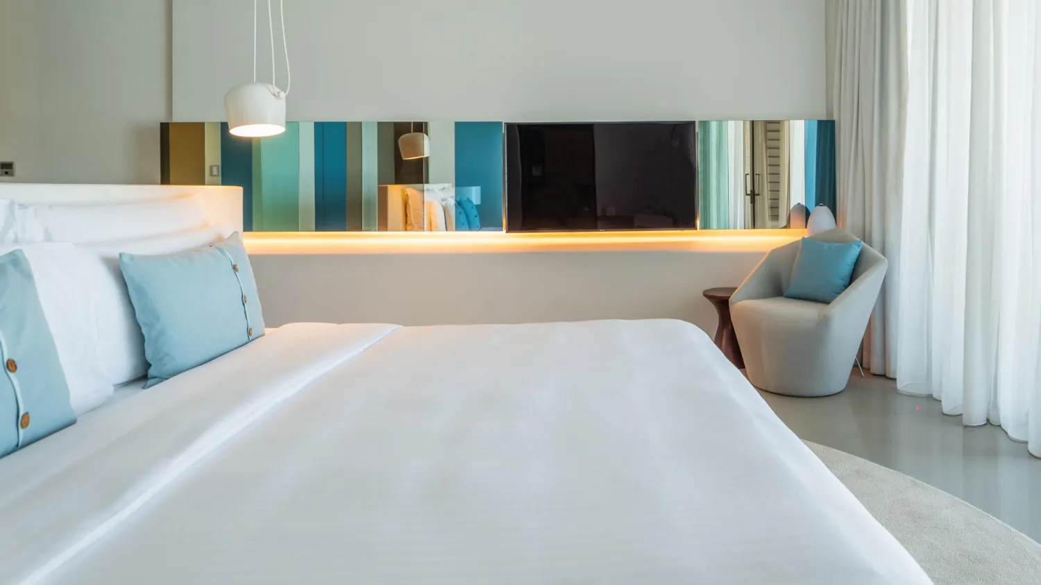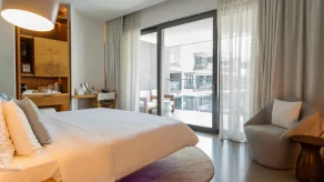На территории разместились 117 номеров в основном здании, 15 вилл с частными бассейнами и 63 апартамента. Минималистичные интерьеры от студии Gatserelia Design выдержаны в свежей бело-бирюзовой цветовой гамме, где тёплое дерево контрастирует с прохладной фактурой полированного бетона. Во всех номерах представлена косметика нью-йоркского бренда Malin+Goetz, а гостям номеров высших категорий и вилл доступны услуги персонального батлера.