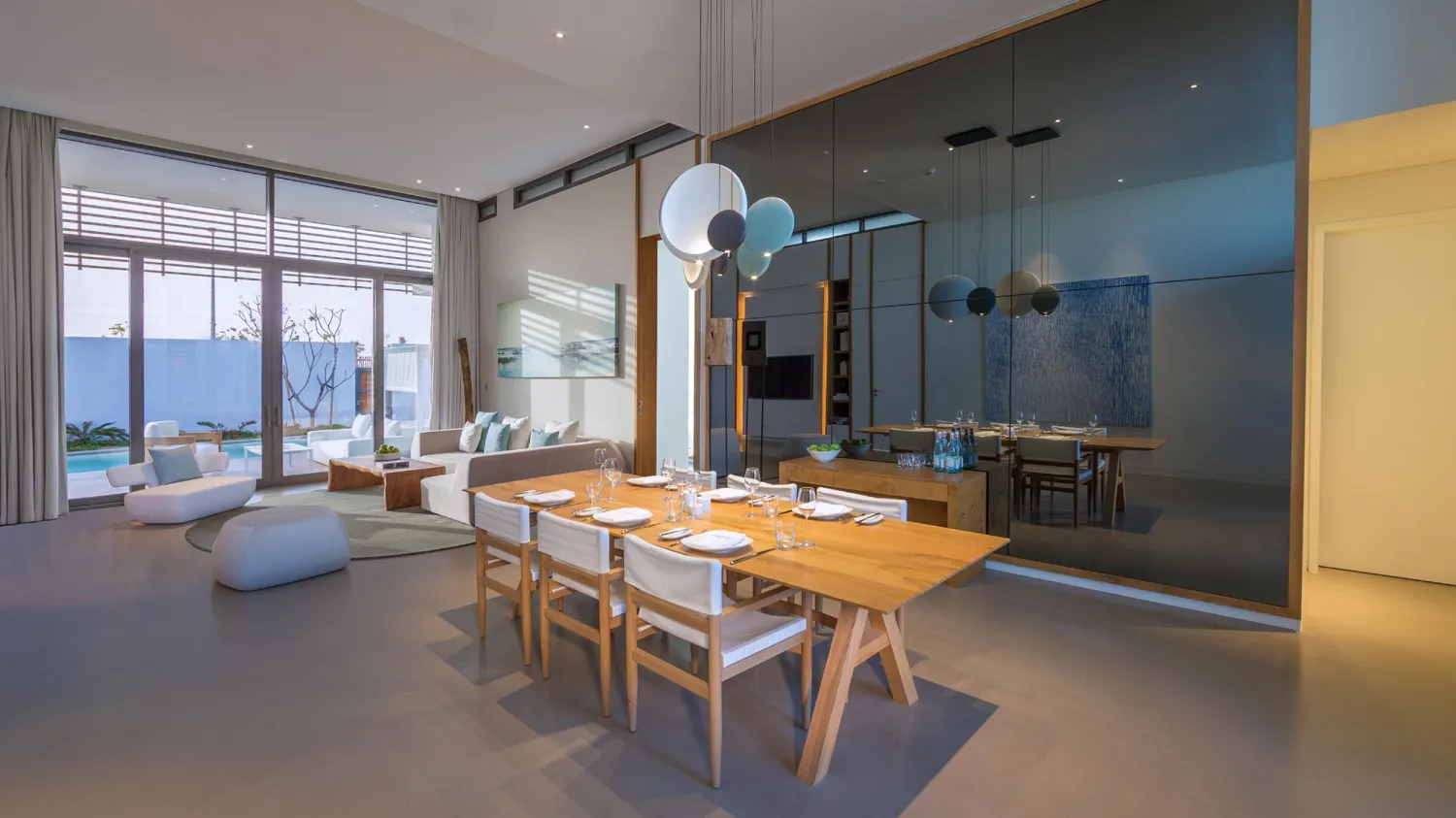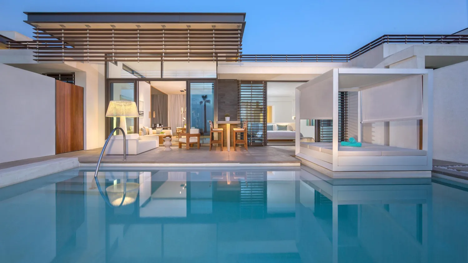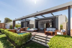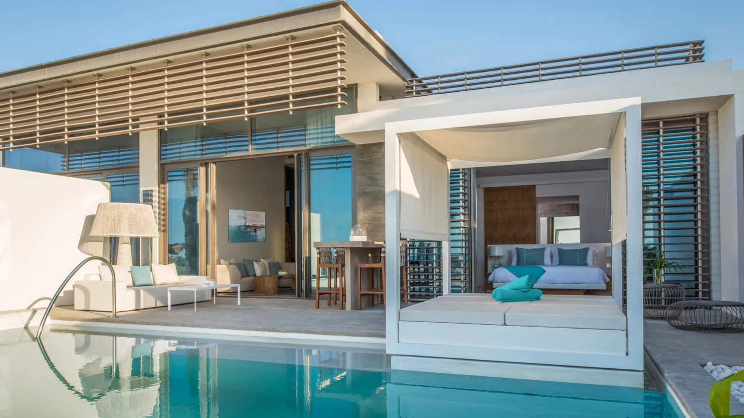 Спальня с кроватью king-size, гостиная с обеденной зоной, ванная комната с ванной и душевой кабиной, терраса с прямым доступом к бассейну. Гостиная и спальня разделены дверью.