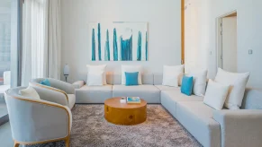 2 спальни (одна – с кроватью king-size, другая – с кроватями twin), гостиная с обеденной зоной, 2 ванные комнаты (каждая с ванной и душевой кабиной), терраса с зоной отдыха. Гостиная и спальни разделены дверями.