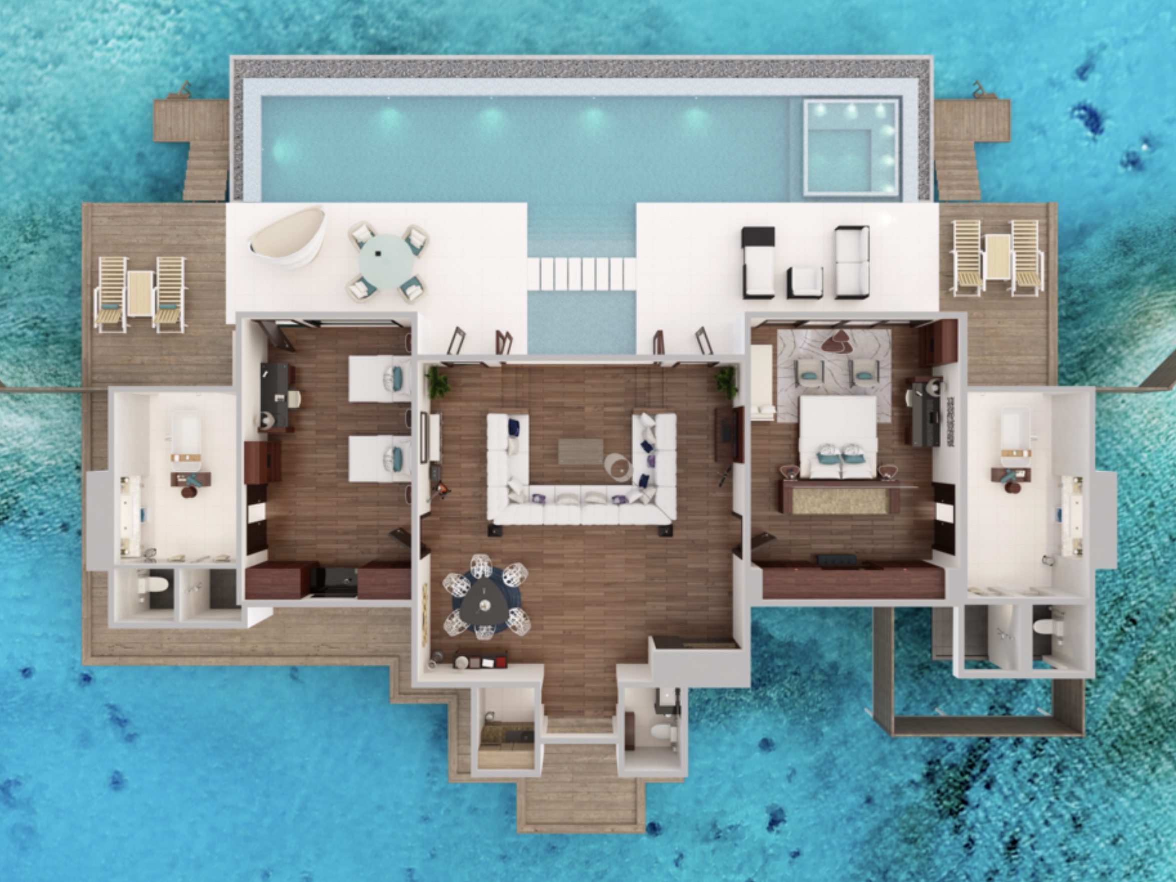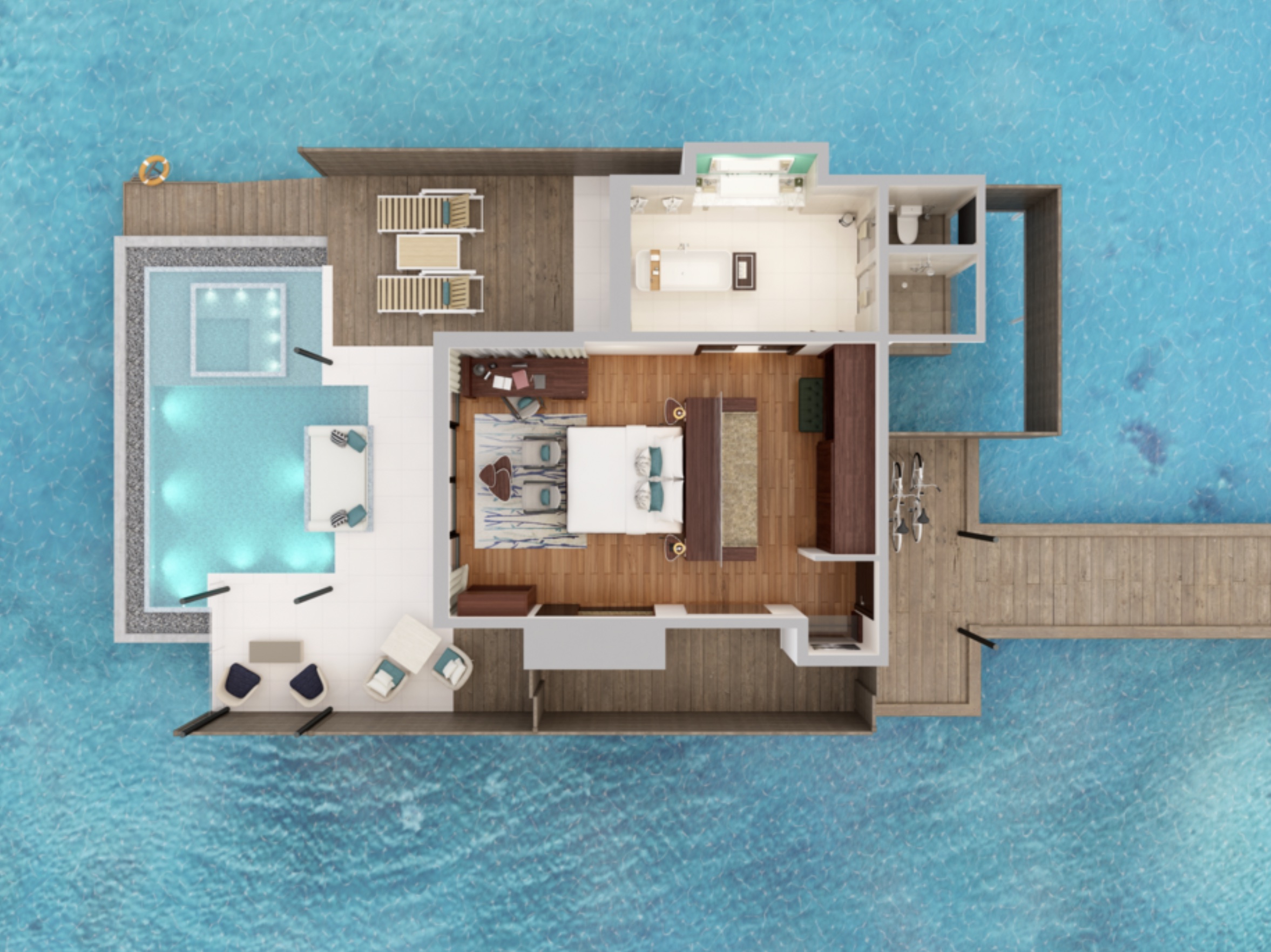 5 объединённых вилл на воде: 2 виллы Deluxe Over Water Pool Villa, 2 виллы One Bedroom Ocean Pool Pavilion и 1 вилла Two Bedroom Ocean Pool Pavilion.