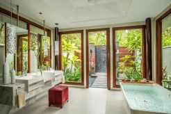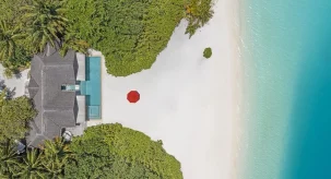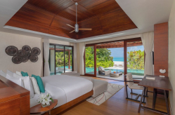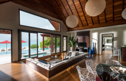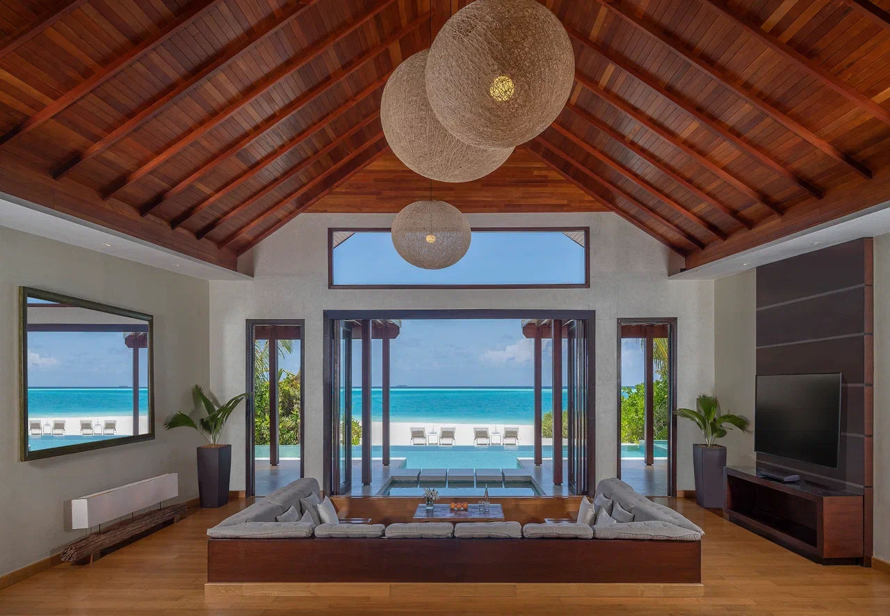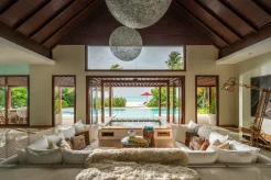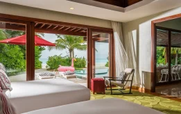 Вилла на берегу. 3 спальни (две – с кроватью king-size, одна – с кроватями twin), гостиная с обеденной зоной, мини-кухня, бар, 3 ванные комнаты (две – с ванной и душевой кабиной, одна – с душевой кабиной), гостевой туалет, комната для спа-процедур, 2 душа на открытом воздухе, терраса с обеденной зоной на открытом воздухе, 2 частных открытых бассейна, джакузи. Гостиная и спальни разделены дверями.