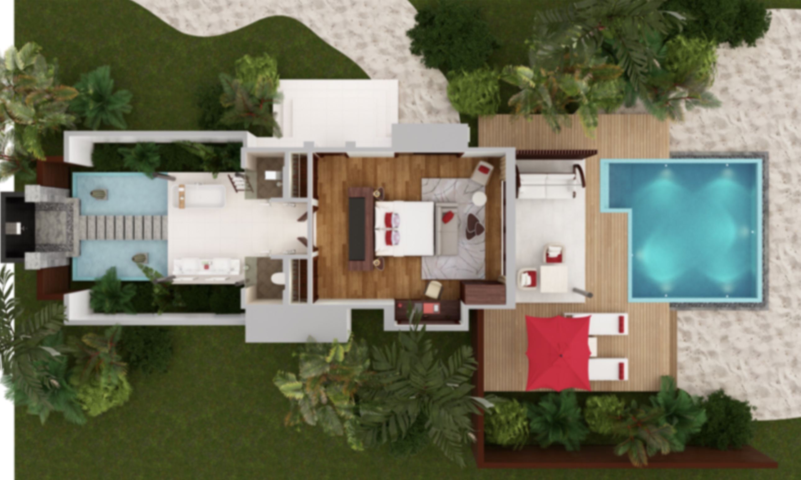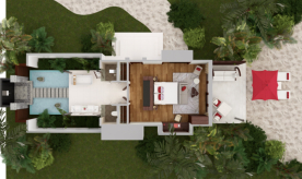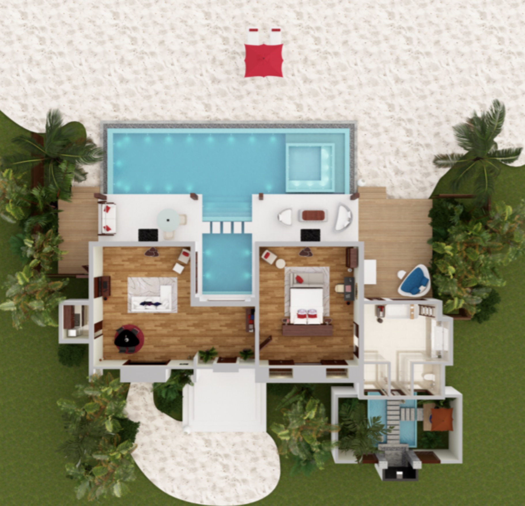 Вилла на берегу. 2 спальни (одна – с кроватью king-size, другая – с кроватями twin), гостиная с обеденной зоной, мини-кухня, бар, 2 ванные комнаты (каждая с ванной и душевой кабиной), гостевой туалет, 2 душа на открытом воздухе, терраса с обеденной зоной на открытом воздухе, бассейном и джакузи. Гостиная и спальни разделены дверями.