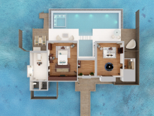 Вилла на воде. 2 спальни (одна – с кроватью king-size, другая – с кроватями twin), гостиная с обеденной зоной, мини-кухня, бар, 2 ванные комнаты (каждая с ванной и душевой кабиной), гостевой туалет, терраса с обеденной зоной на открытом воздухе, бассейном и джакузи, прямой спуск к воде. Гостиная и спальни разделены дверями.