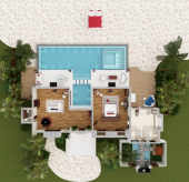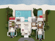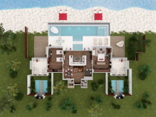 6 спален (пять – с кроватью king-size, одна – с кроватями twin), 3 гостиные с обеденными зонами, 3 мини-кухни, бар, 6 ванных комнат (каждая с ванной и душевой кабиной), гостевой туалет, 5 террас (одна из них – с обеденной зоной на открытом воздухе), 5 частных открытых бассейнов (каждый с джакузи), прямой спуск к воде. Гостиные и спальни разделены дверями.