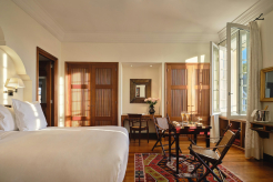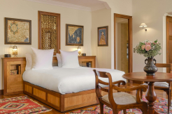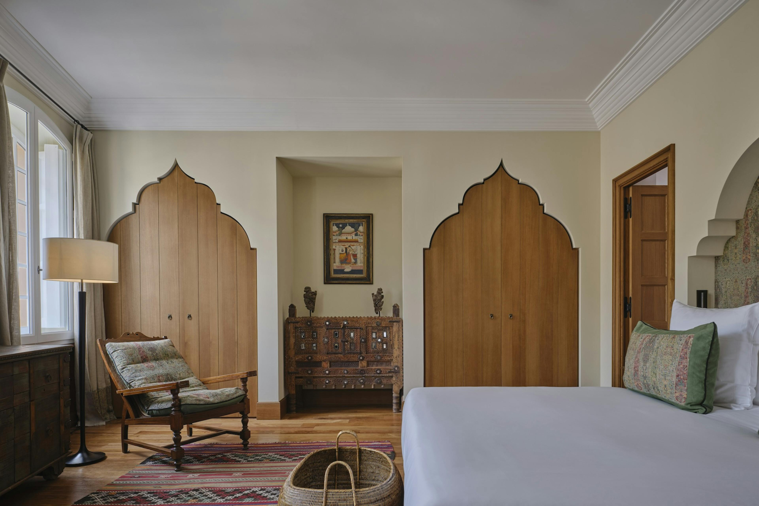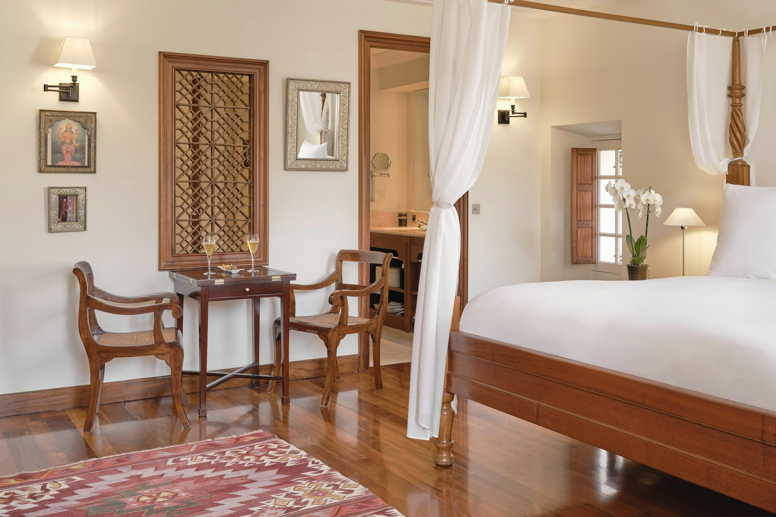 Отель входит в престижную коллекцию Airelles. По легенде, особняк был построен в 1835 году по заказу французского генерала в подарок его жене, индийской принцессе. За фасадом цвета охры скрываются светлые интерьеры в колониальном стиле: мебель из тёмного дерева, резные элементы, пёстрые ковры, экзотические аксессуары и яркие акценты оттенков жжёного апельсина, лайма и малины. Все 12 номеров имеют индивидуальное оформление.