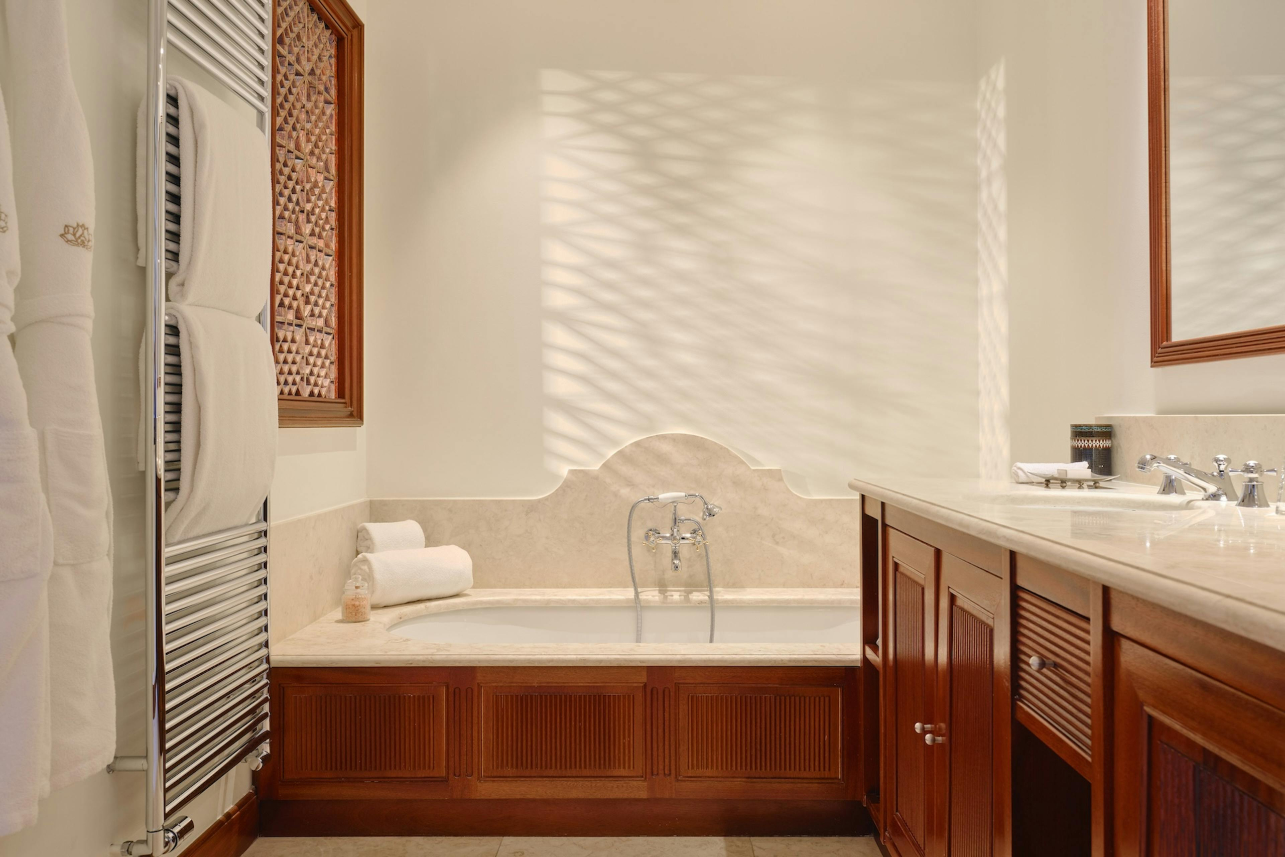 Спальня с кроватью king-size, гостиная зона, ванная комната с ванной и душевой кабиной.