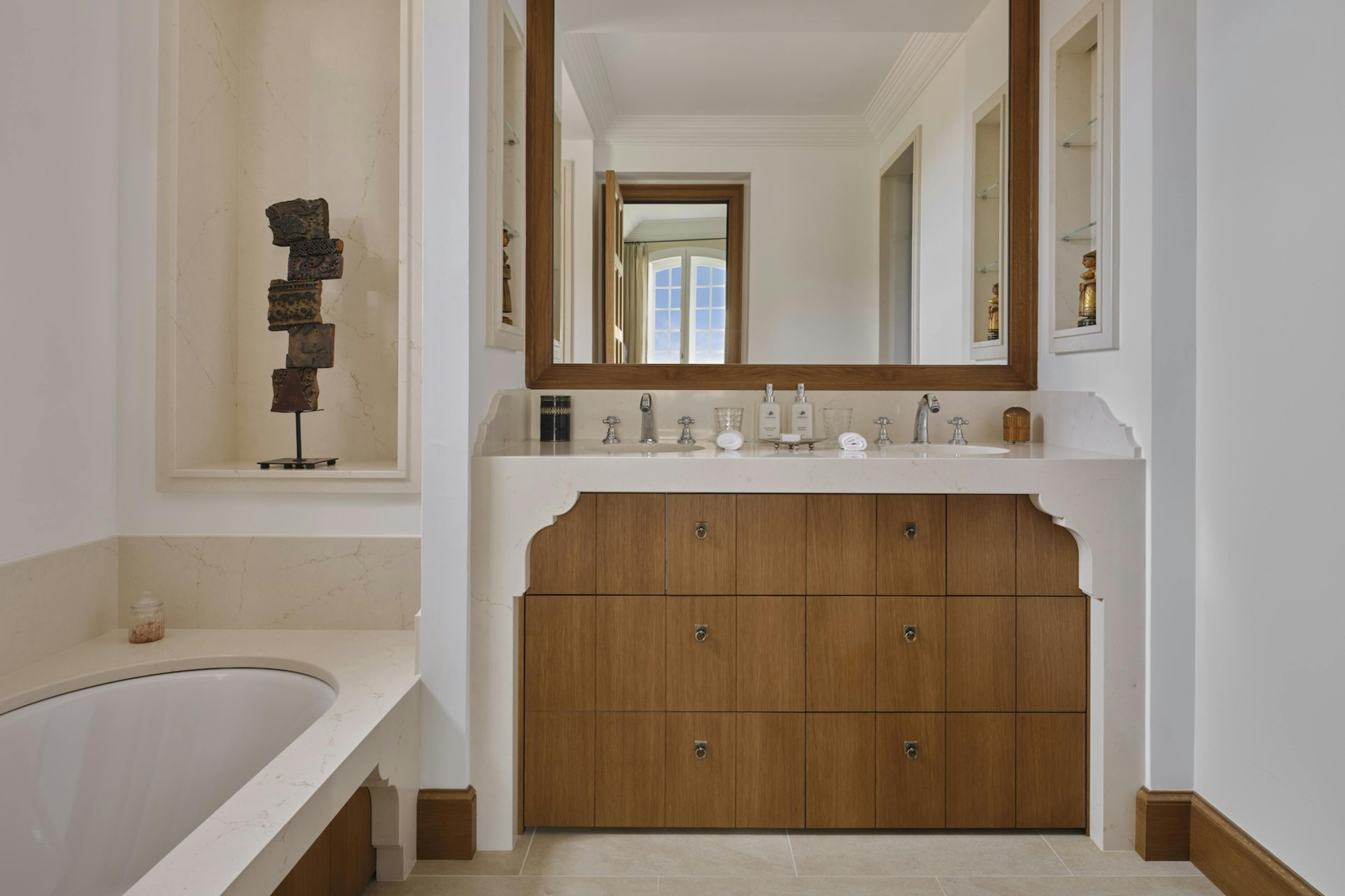 2 спальни с кроватями king-size (одна из них – с гостиной зоной), 2 гардеробные, ванная комната с ванной и душевой кабиной, терраса.