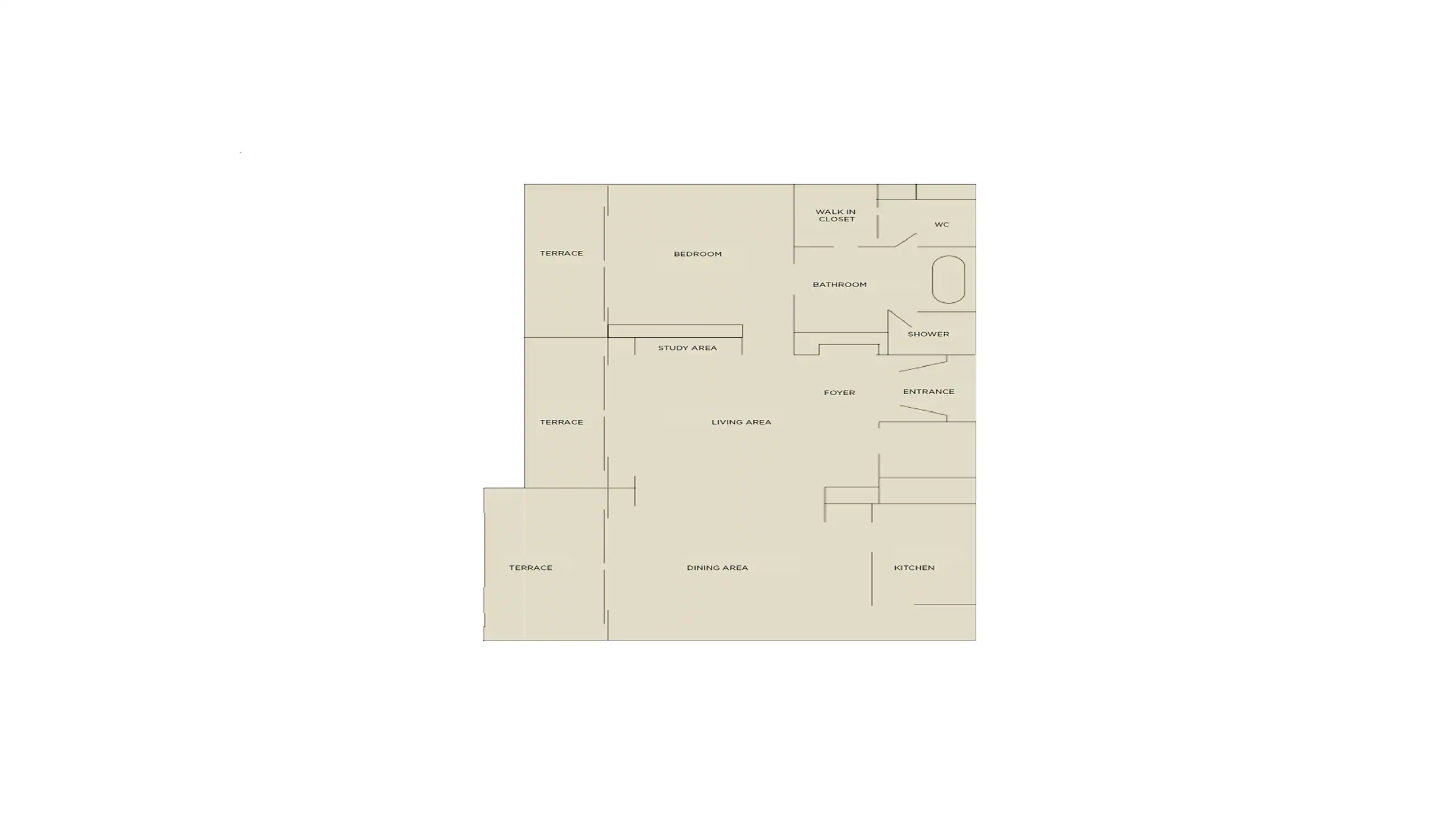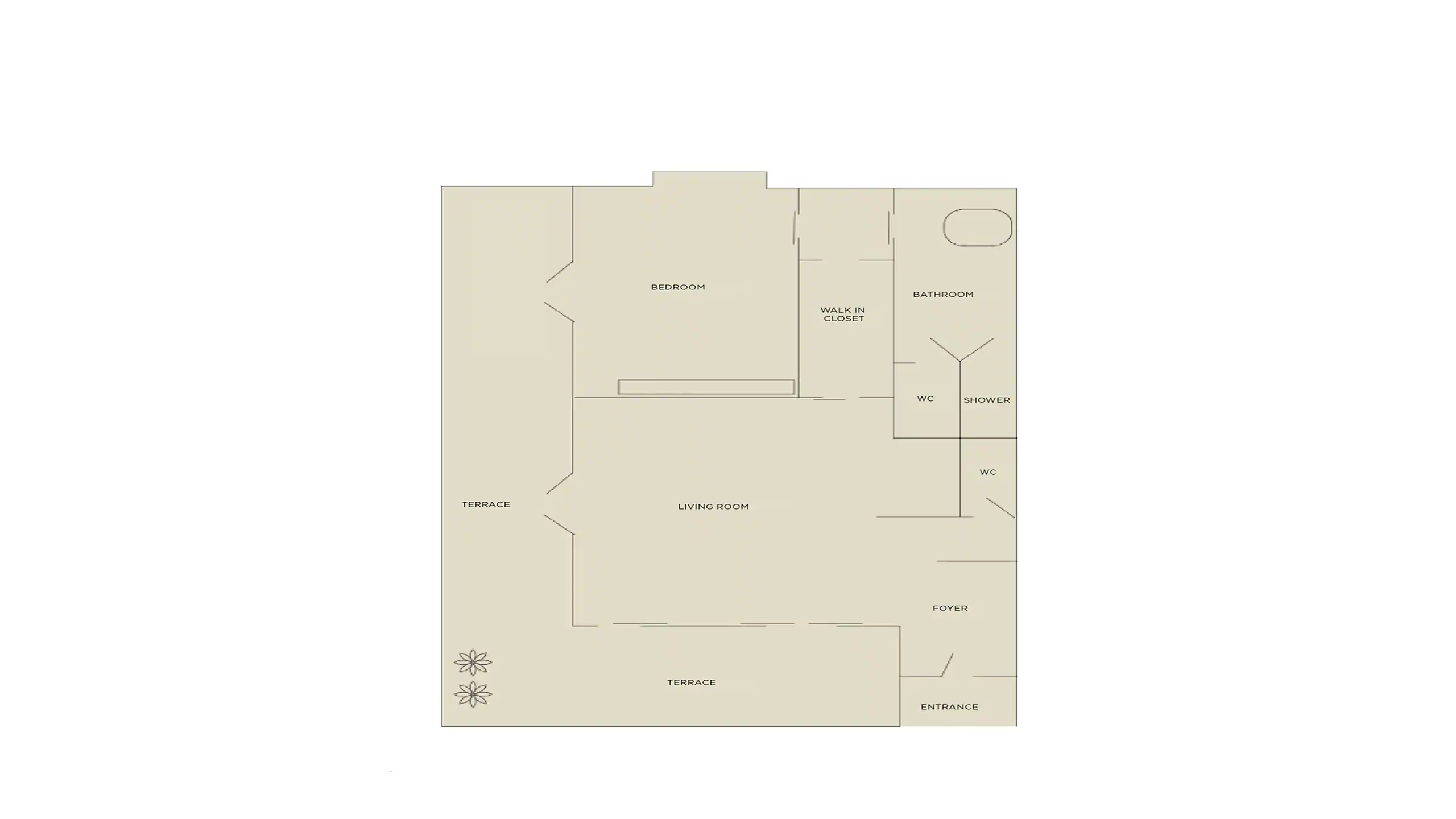 Спальня с кроватью king-size, гостиная с обеденной зоной, кухня, гардеробная, ванная комната с ванной и душевой кабиной, терраса с обеденной зоной на открытом воздухе. Гостиная и спальня разделены дверью.