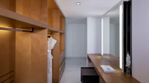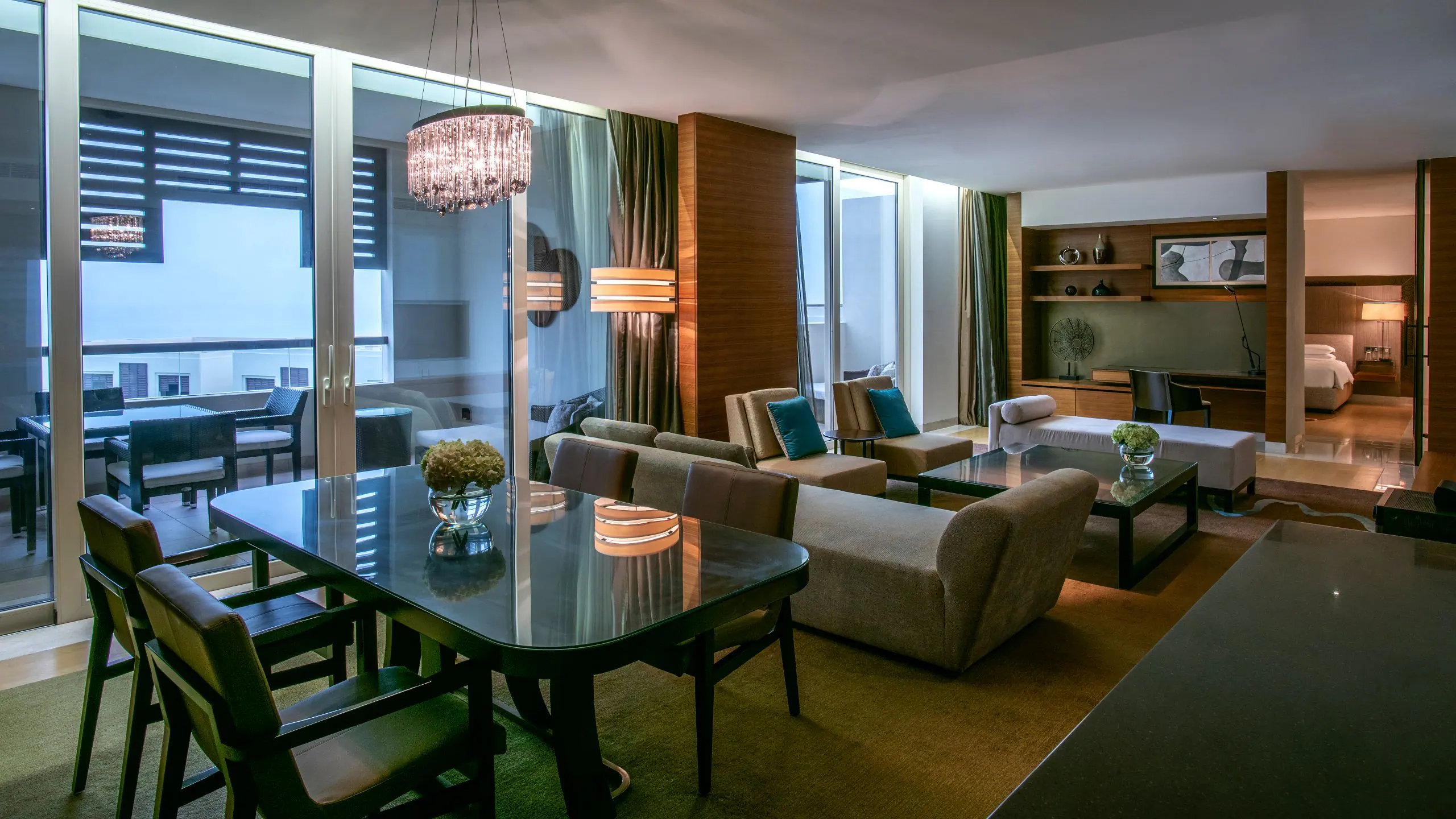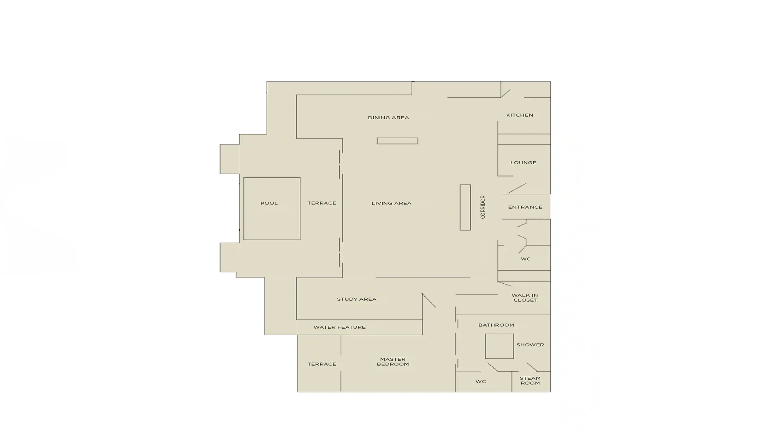 Спальня с кроватью king-size, гостиная с обеденной зоной, кухня, гардеробная, ванная комната с ванной, душевой кабиной и парной, балкон, закрытая терраса с бассейном. Гостиная и спальня разделены дверью.