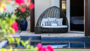 Вилла в саду. 2 спальни с кроватями king-size, гостиная, кухня, 2 ванные комнаты (каждая с ванной и душевой кабиной), терраса с бассейном и душем на открытом воздухе. Гостиная и спальни разделены дверями.