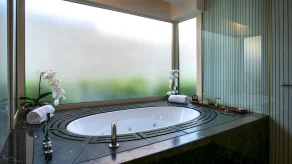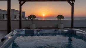 Спальня с кроватью king-size, гостиная с обеденной зоной, гардеробная, ванная комната с ванной и душевой кабиной, терраса с джакузи на открытом воздухе. Гостиная и спальня разделены дверью.