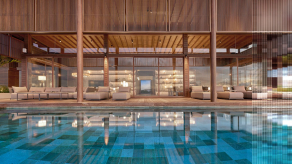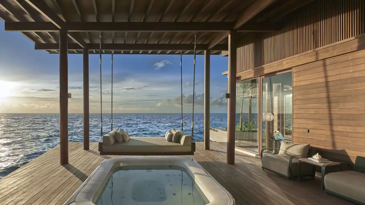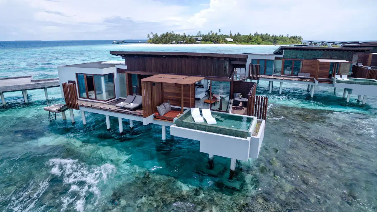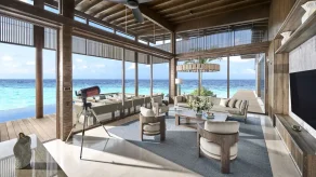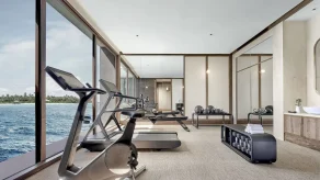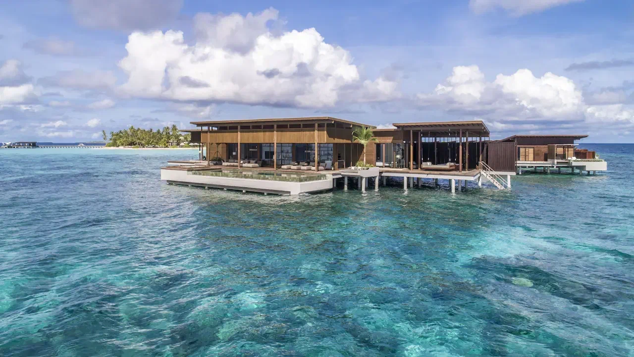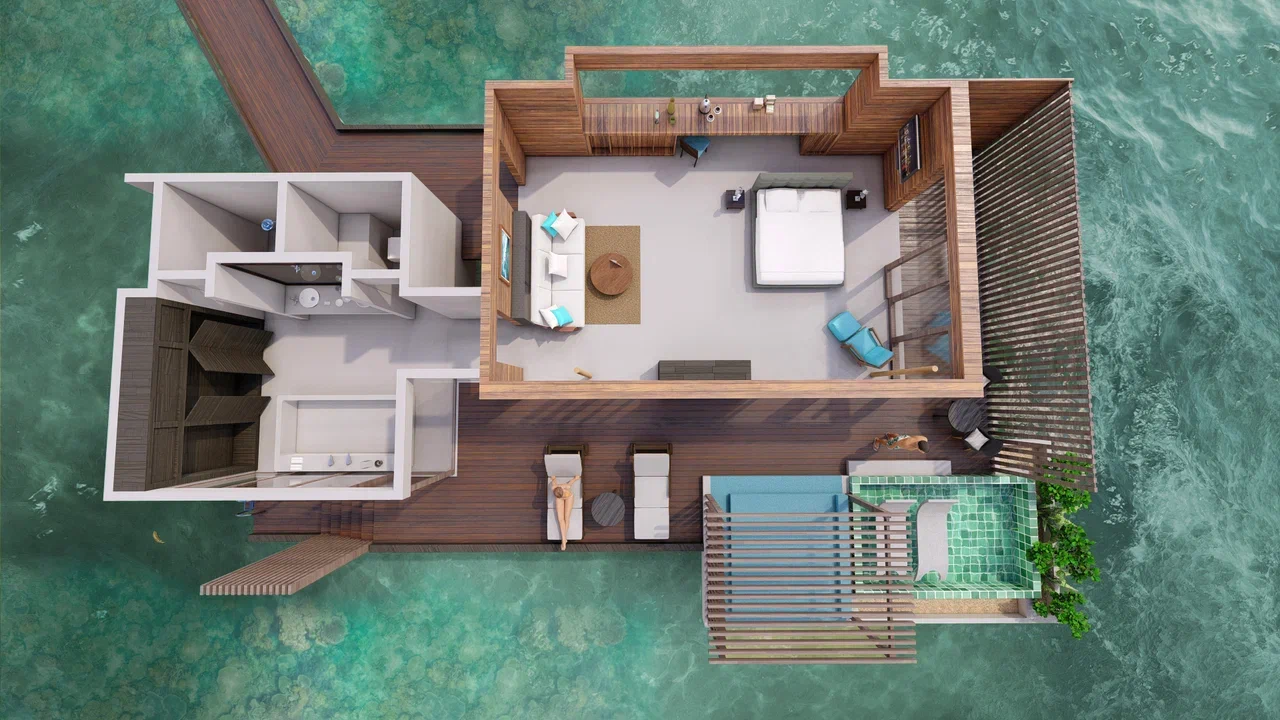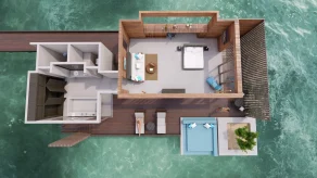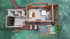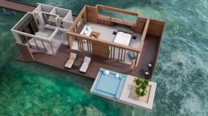 Вилла на воде. 3 спальни с кроватями king-size, гостиная с обеденной зоной, кухня, 3 ванные комнаты (каждая с ванной и душевой кабиной), тренажёрный зал, комната для спа-процедур, терраса с бассейном, джакузи и обеденной зоной на открытом воздухе. Прямой спуск к воде. Гостиная и спальни разделены дверями.