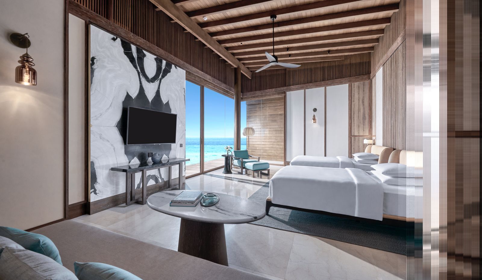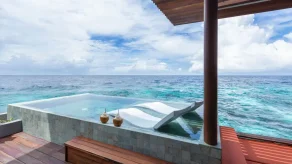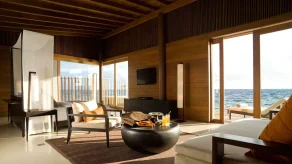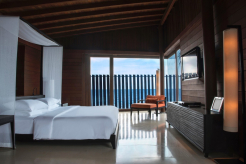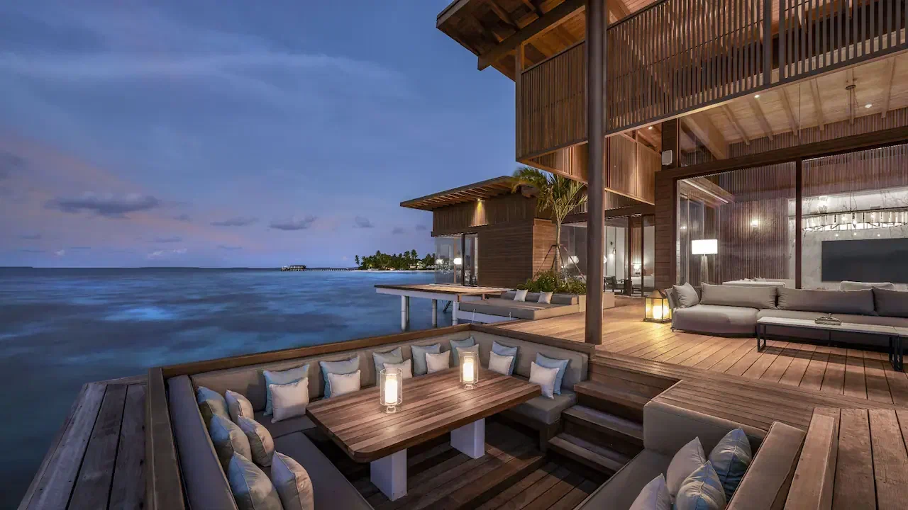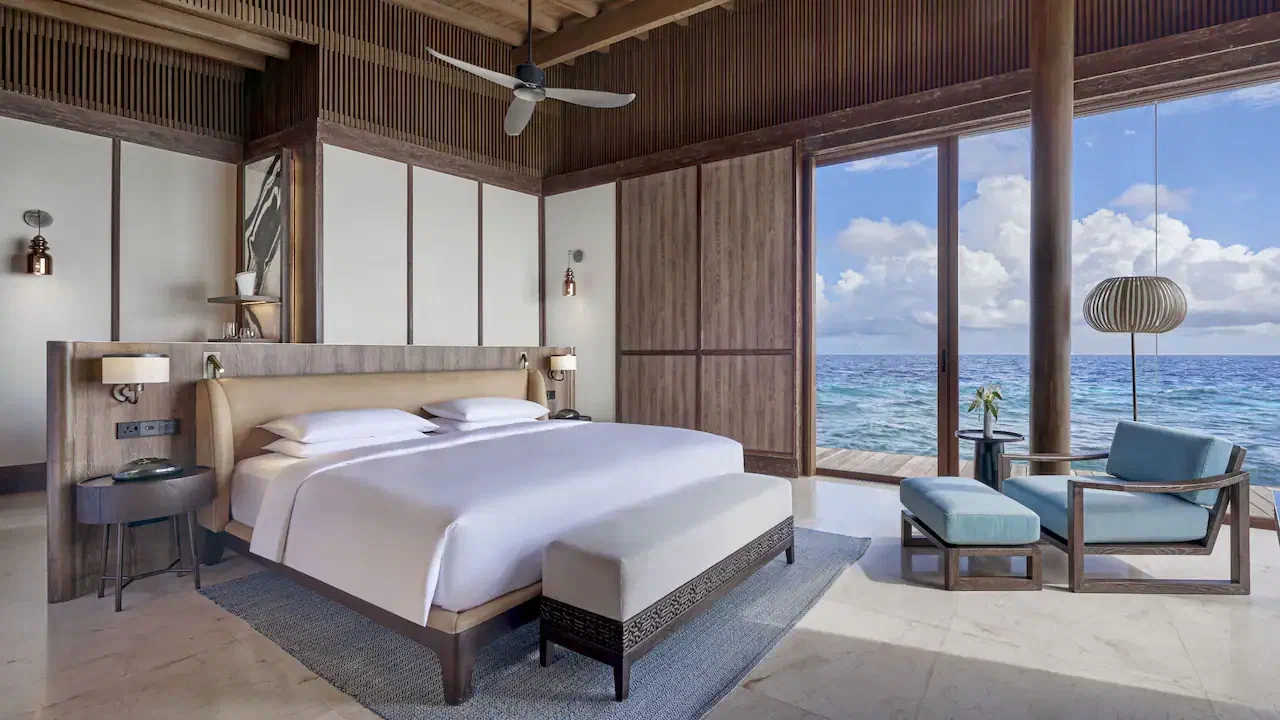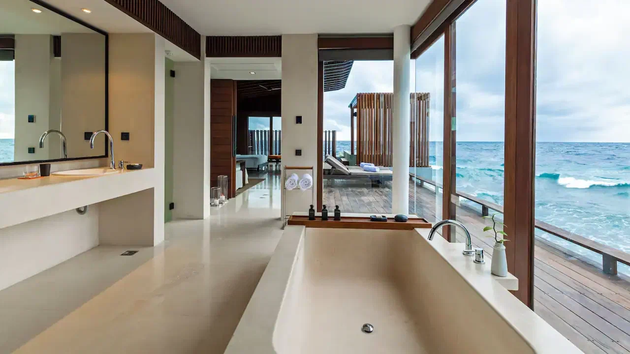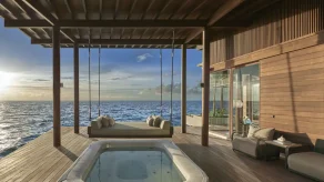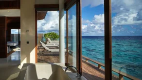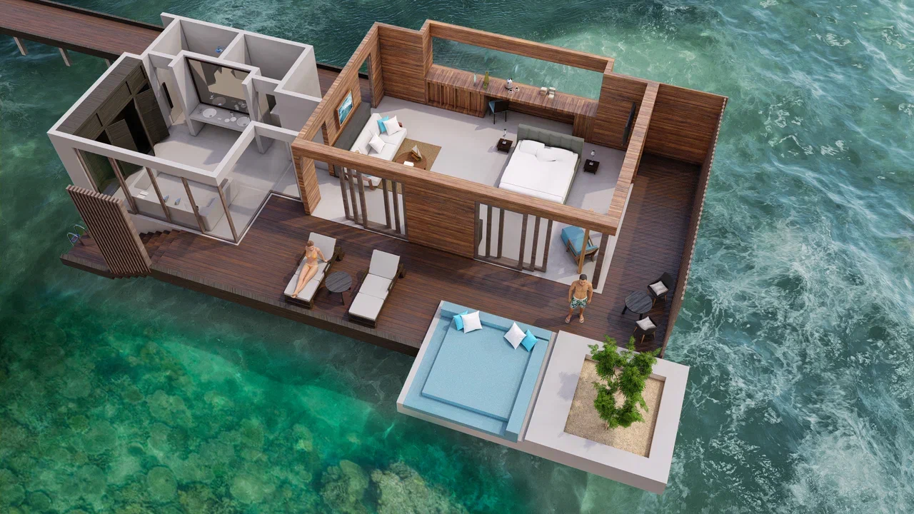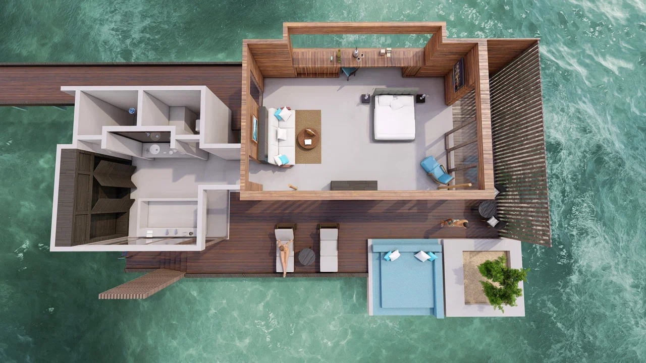 Вилла на воде. Спальня с кроватью king-size и гостиной зоной, ванная комната с ванной и душем, терраса с прямым спуском к воде.