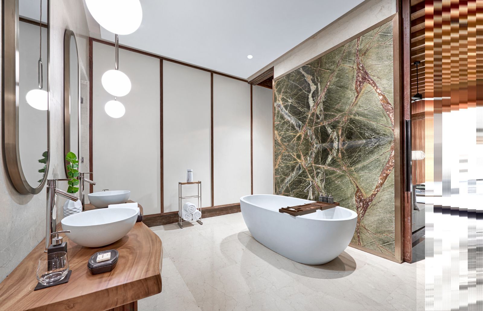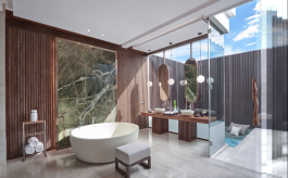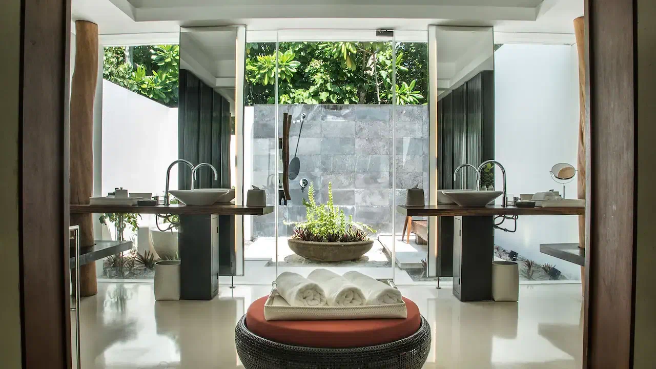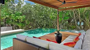 Вилла на берегу. Спальня с кроватью king-size и гостиной зоной, ванная комната с душем, ванна и душ на открытом воздухе, терраса с бассейном.