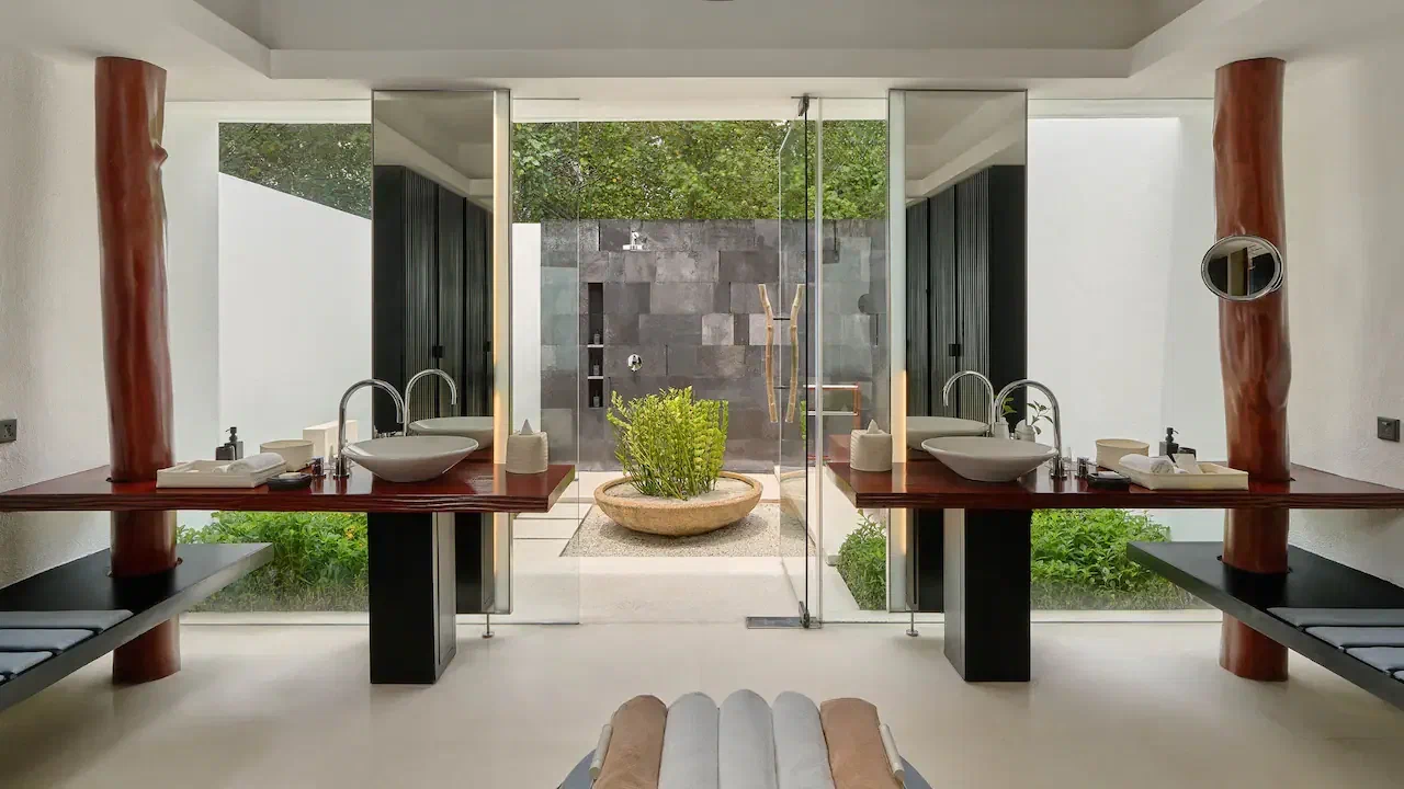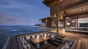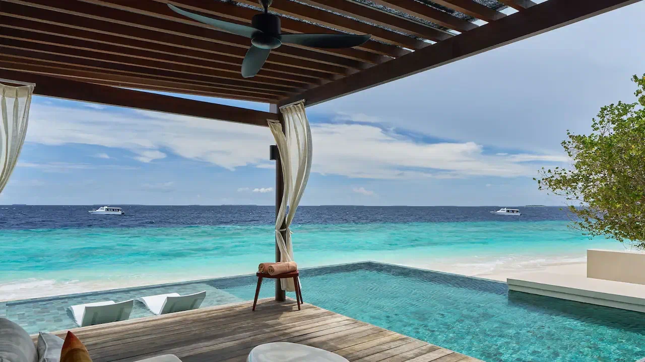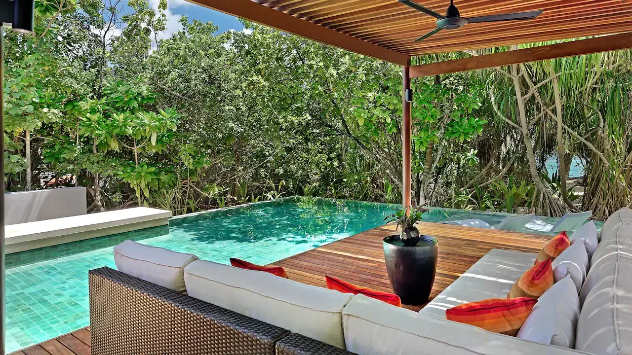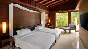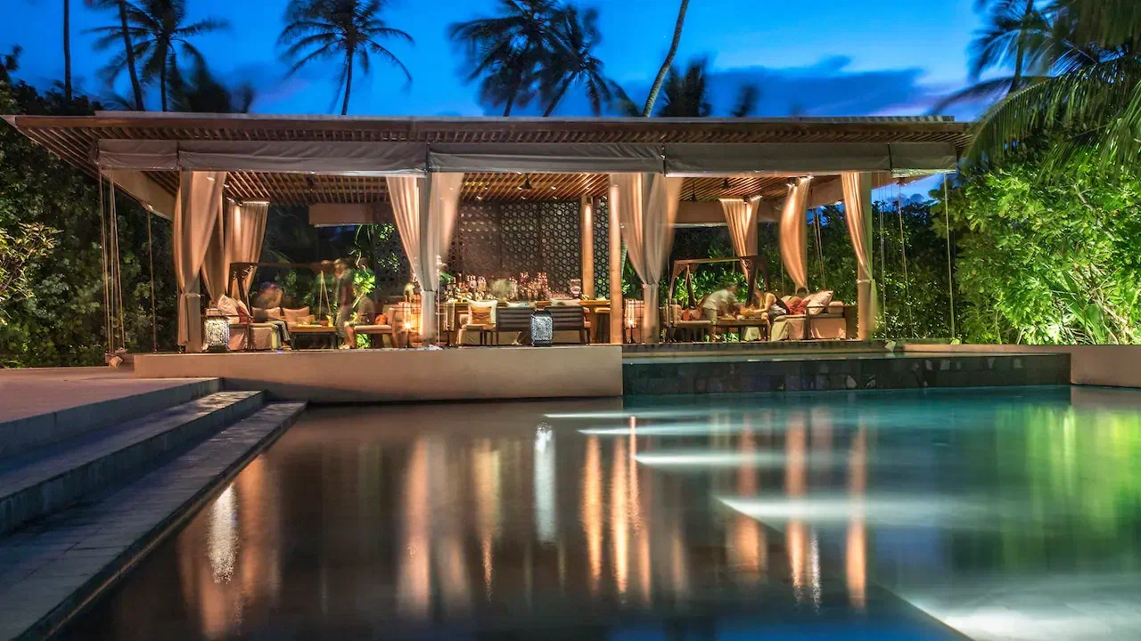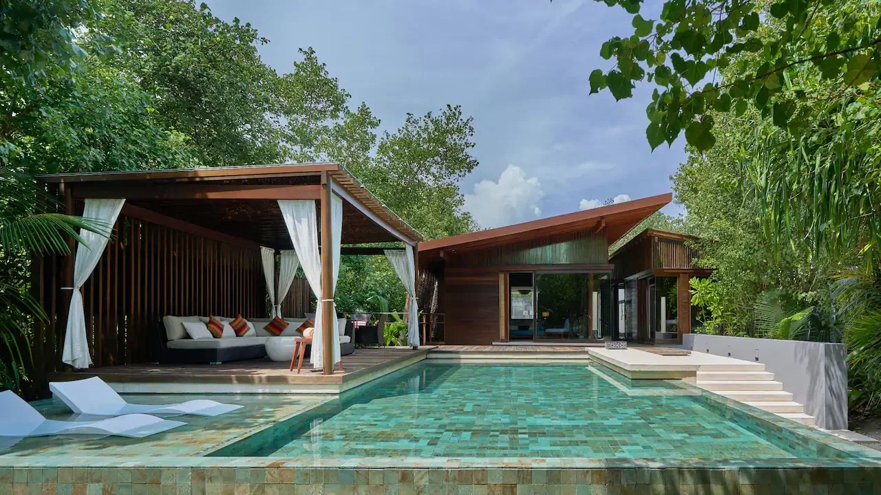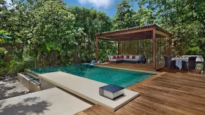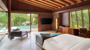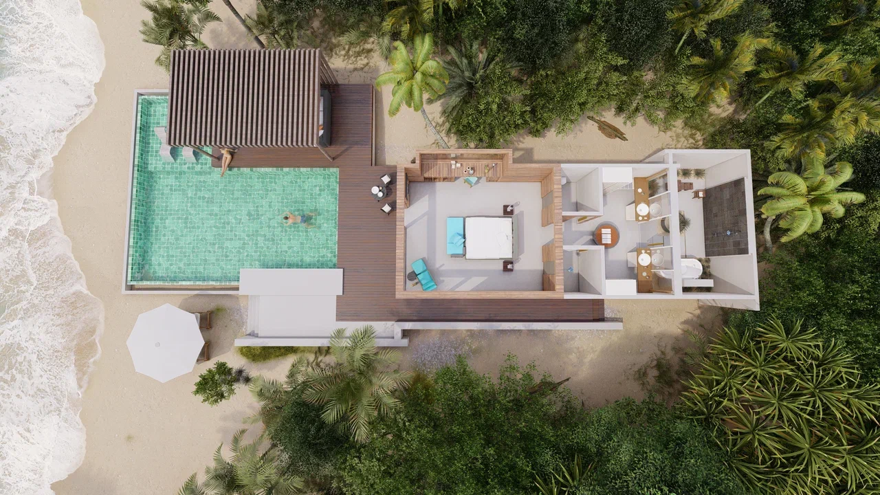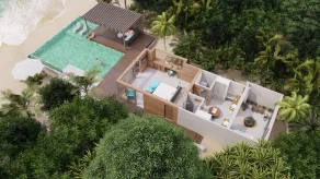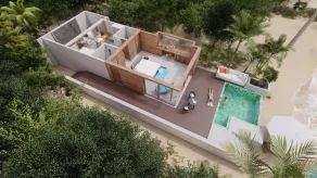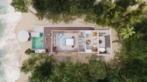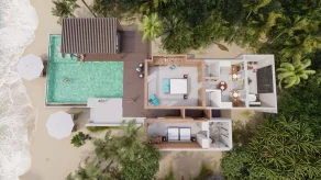 Вилла на берегу. 2 спальни (одна – с кроватью king-size, другая – с кроватями twin), 2 ванные комнаты (каждая с душевой кабиной), ванна и душ на открытом воздухе, терраса с беседкой, обеденной зоной на открытом воздухе и бассейном.