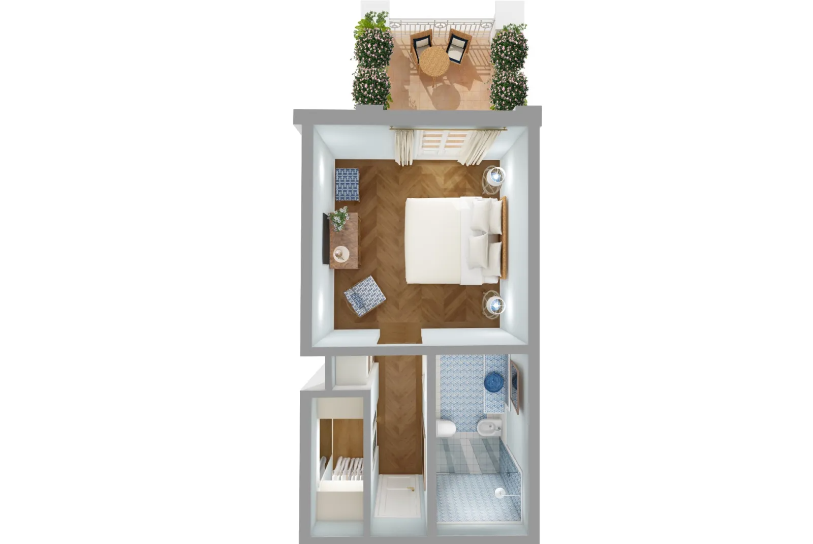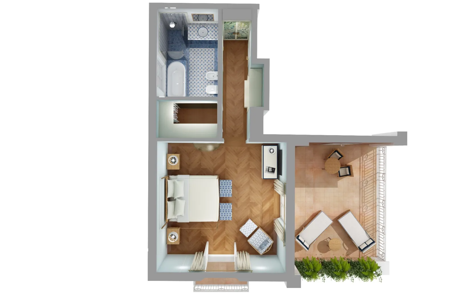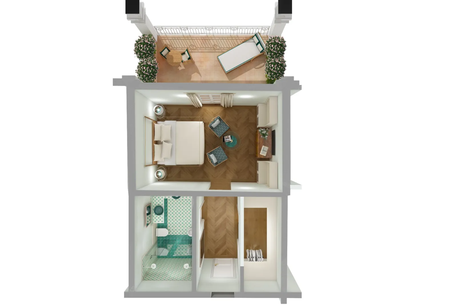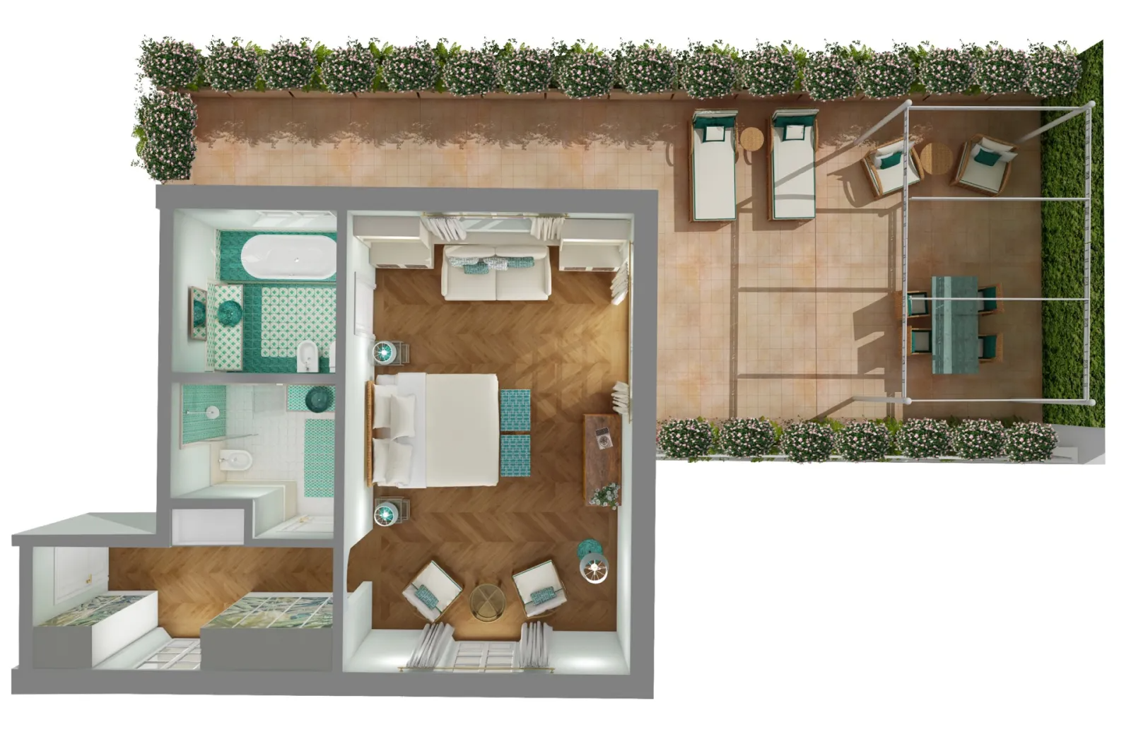 Двухуровневый номер. 2 спальни (одна – с кроватью king-size, другая – с кроватями twin), гостиная с обеденной зоной, 2 ванные комнаты (одна – с душевой кабиной, другая – с ванной и душевой кабиной), терраса с бассейном-джакузи и садом, терраса на крыше.