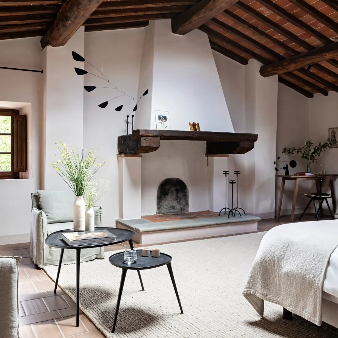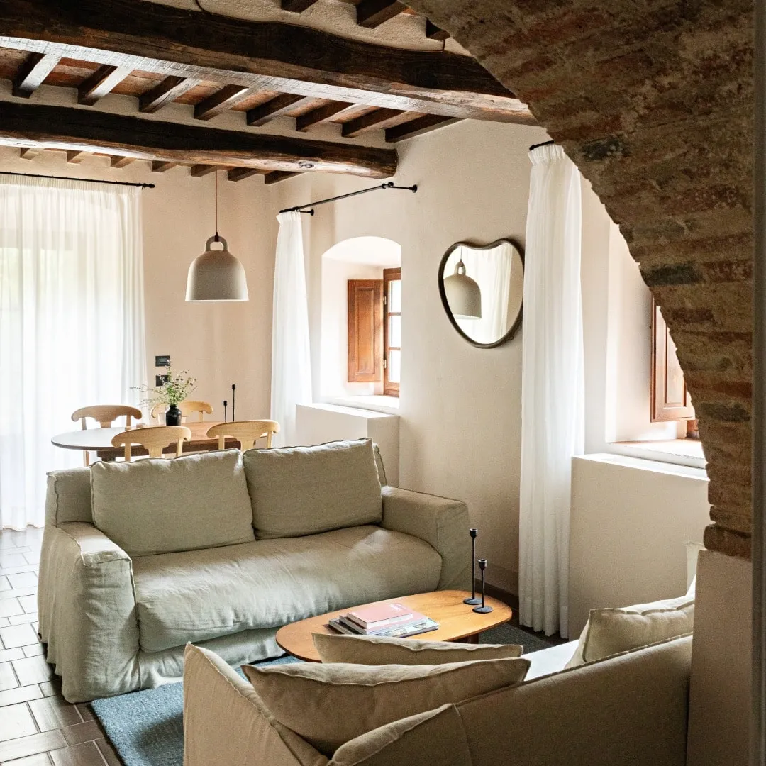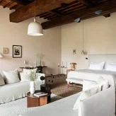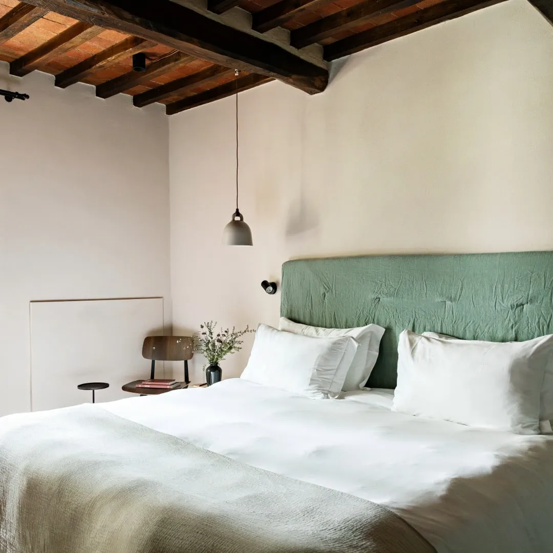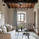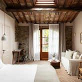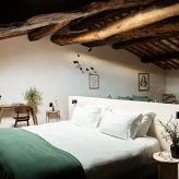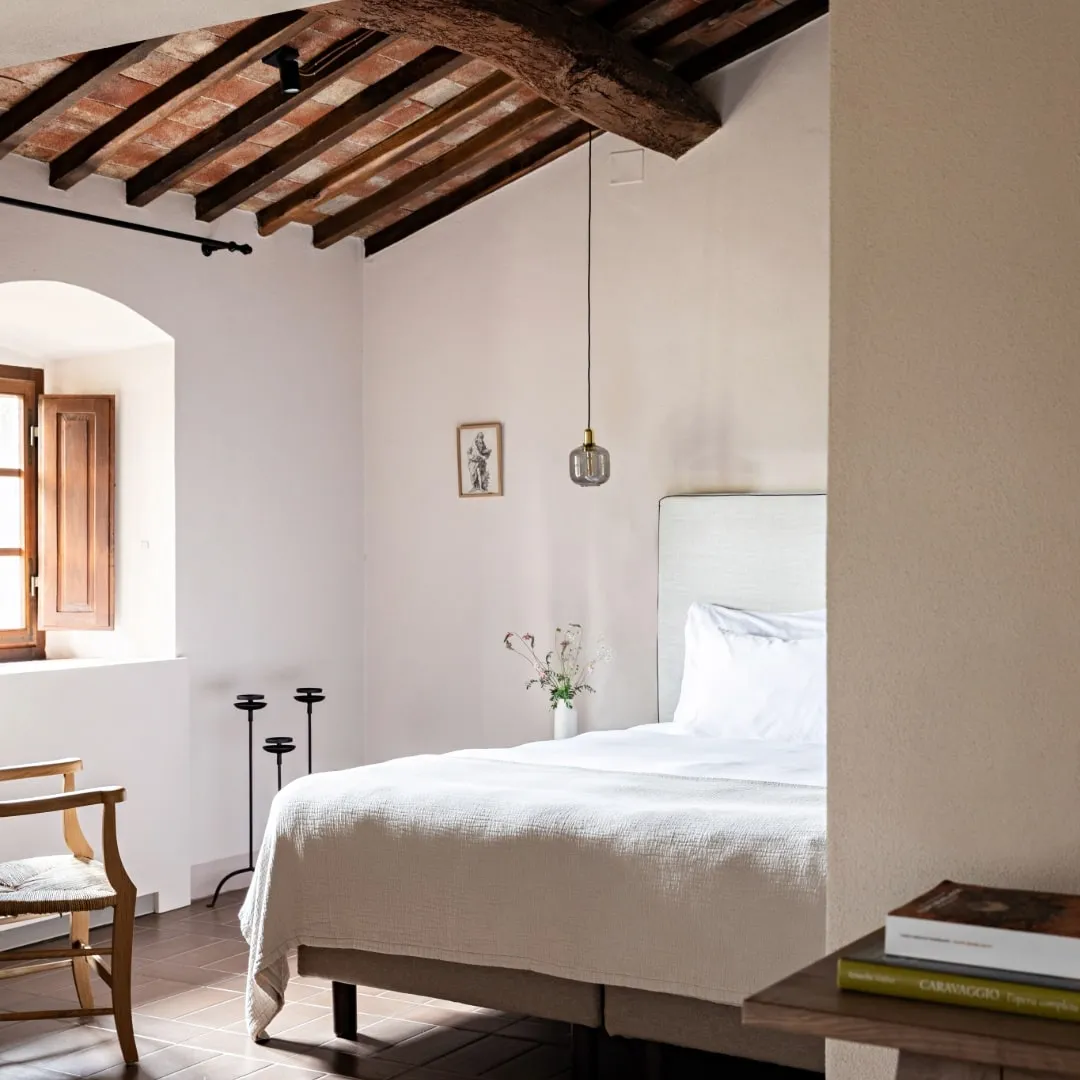 Реставрацией и преображением исторических зданий занималось флорентийское бюро Pierattelli Architetture, дизайнеры которого бережно сохранили оригинальные элементы: каменную кладку, мраморную лестницу, деревянные балки потолка, неоклассические фрески. В отделке и обстановке использованы местные песчаник и древесина, а также керамическая плитка ручной работы фабрики Cotto Manetti и мебель из массива дуба от итальянского бренда с полуторавековой историей Gervasoni 1882. В 22 номерах, среди которых нет двух одинаковых, доминируют обновлённый тосканский стиль и палитра натуральных оттенков: шалфей, терракота, слоновая кость. Отель придерживается концепции восстанавливающего отдыха, поэтому в номерах нет телевизоров, что позволяет гостям полностью переключиться на созерцание и покой. Туалетные принадлежности в ванных комнатах предоставлены австрийским брендом натуральной косметики Susanne Kaufmann и французским Minois Paris.