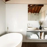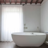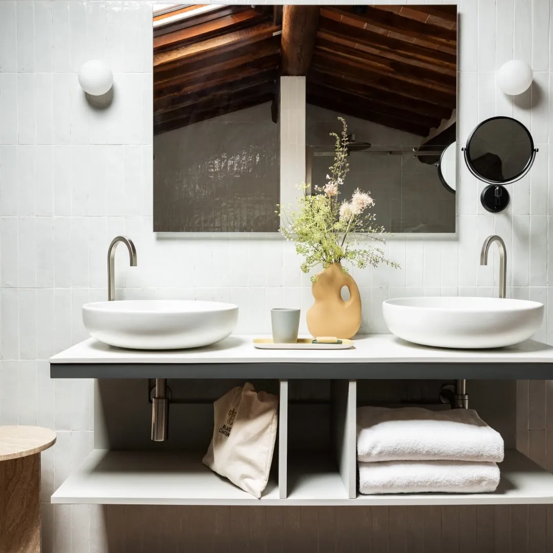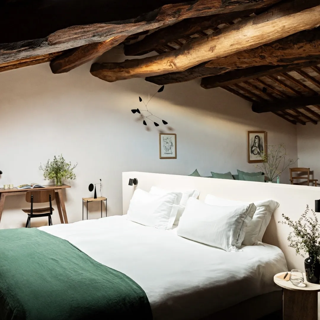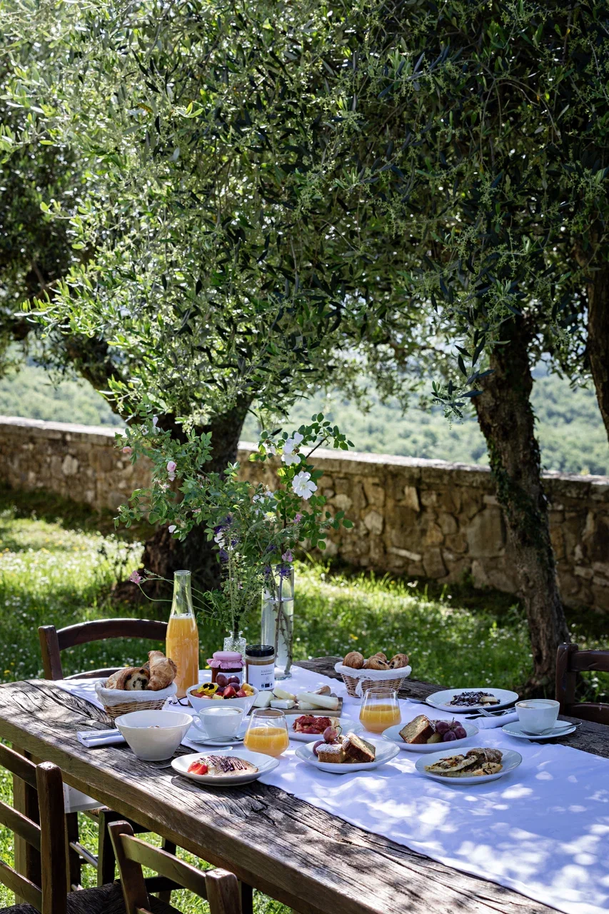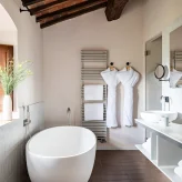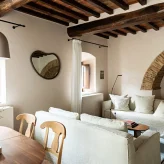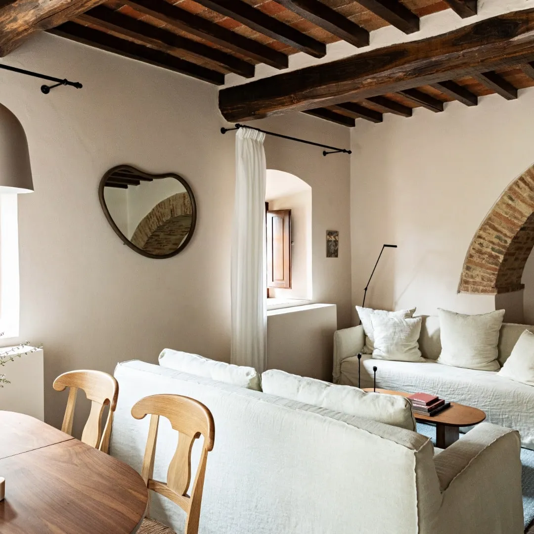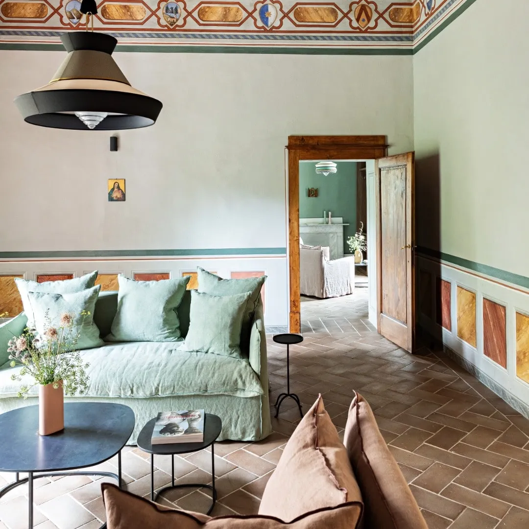 Реставрацией и преображением исторических зданий занималось флорентийское бюро Pierattelli Architetture, дизайнеры которого бережно сохранили оригинальные элементы: каменную кладку, мраморную лестницу, деревянные балки потолка, неоклассические фрески. В отделке и обстановке использованы местные песчаник и древесина, а также керамическая плитка ручной работы фабрики Cotto Manetti и мебель из массива дуба от итальянского бренда с полуторавековой историей Gervasoni 1882. В 22 номерах, среди которых нет двух одинаковых, доминируют обновлённый тосканский стиль и палитра натуральных оттенков: шалфей, терракота, слоновая кость. Отель придерживается концепции восстанавливающего отдыха, поэтому в номерах нет телевизоров, что позволяет гостям полностью переключиться на созерцание и покой. Туалетные принадлежности в ванных комнатах предоставлены австрийским брендом натуральной косметики Susanne Kaufmann и французским Minois Paris.