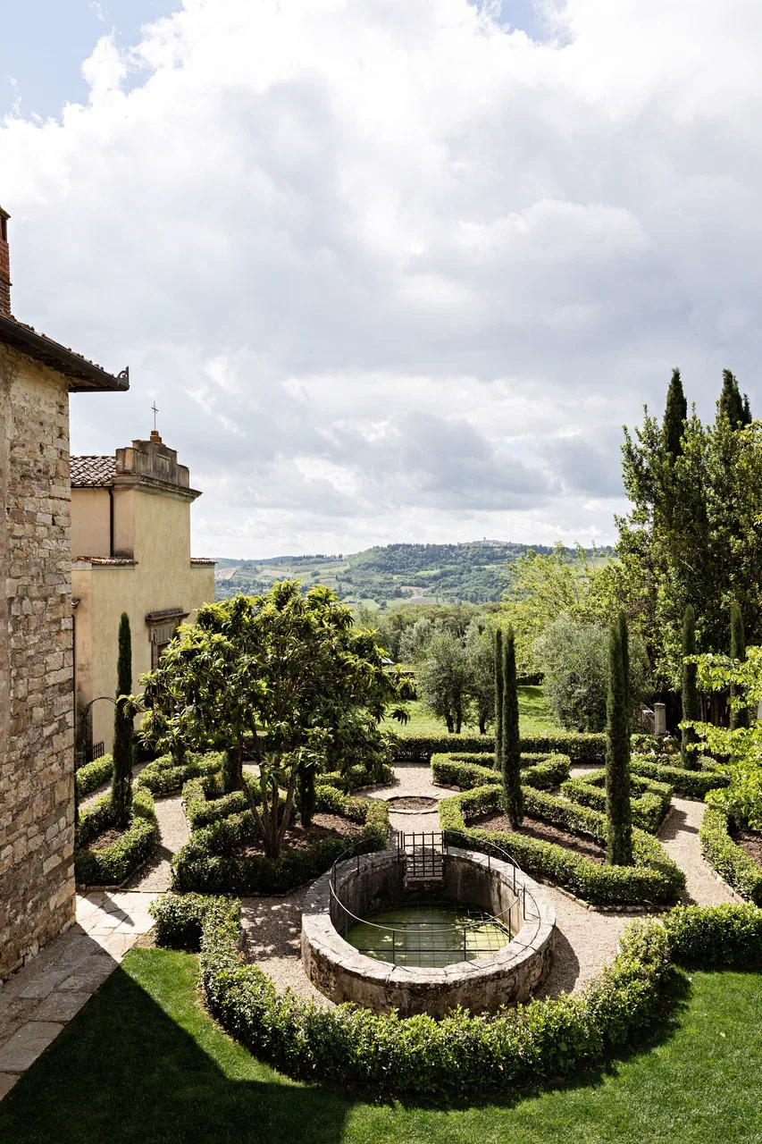 Вид на сады и холмы Кьянти.