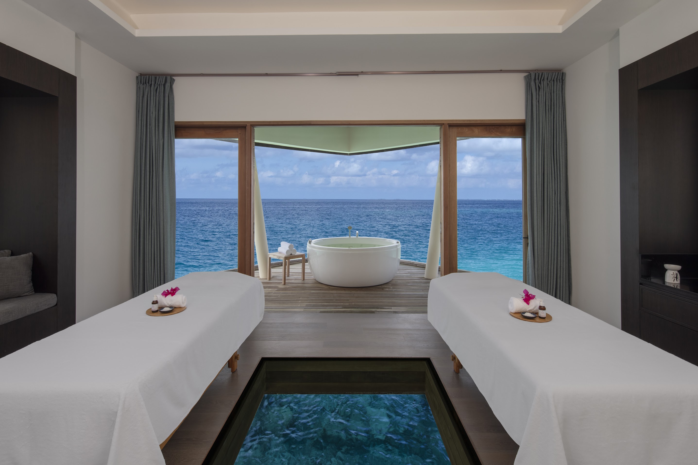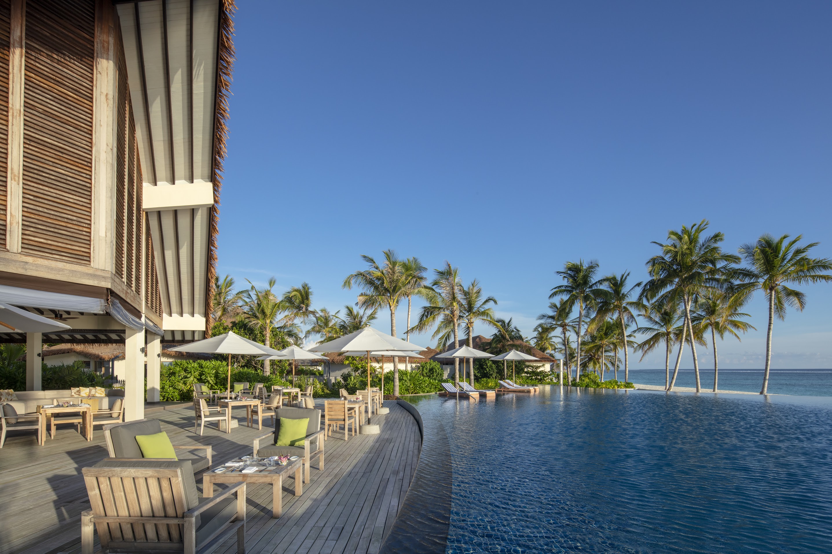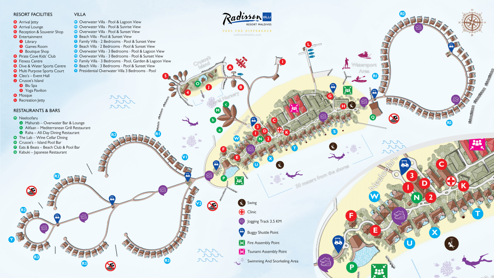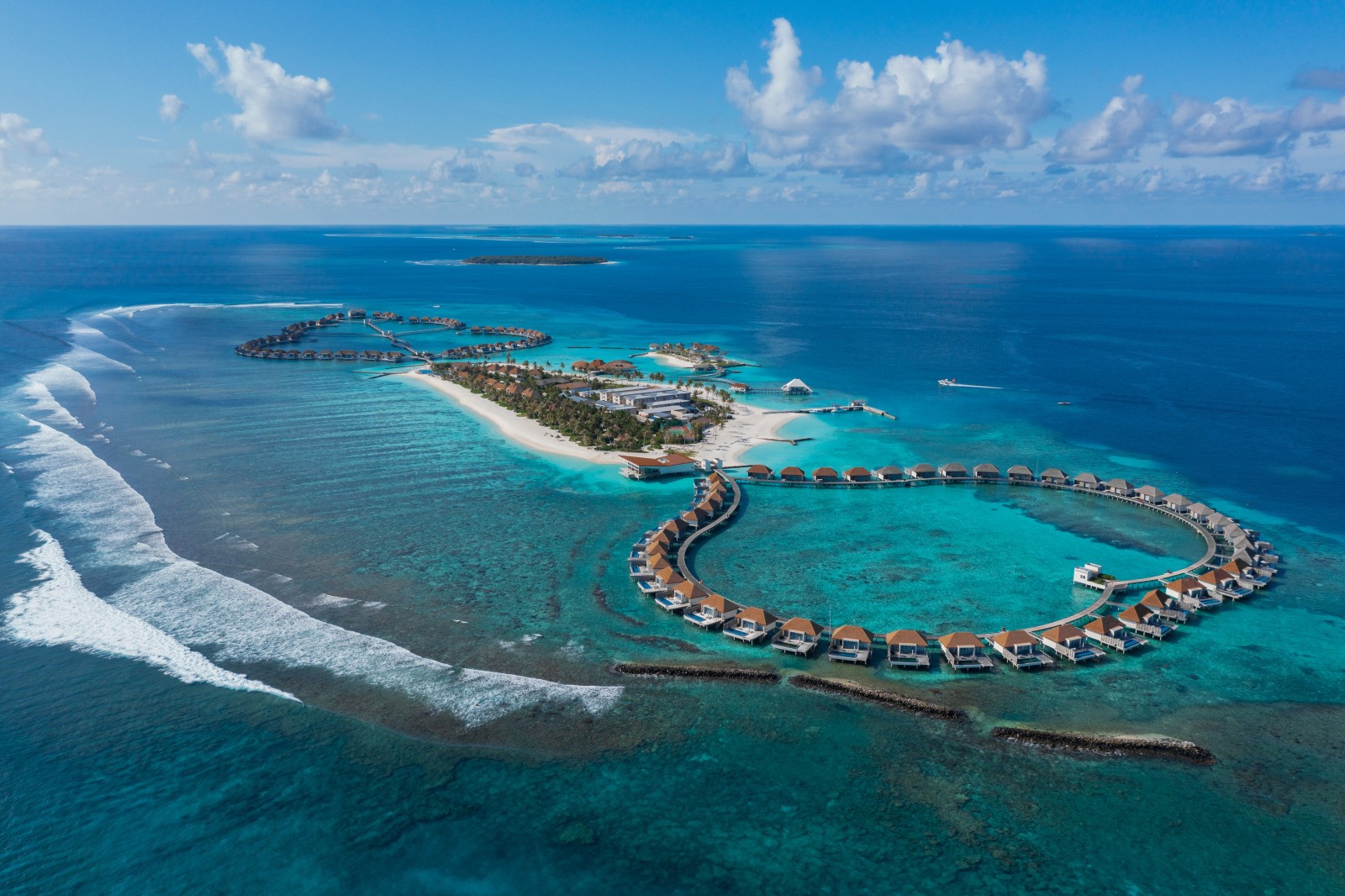 В отеле доступно проживание в том числе по системам all inclusive и premium all inclusive. Среди гастрономических локаций – японский ресторан Kabuki, расположенный на воде и предлагающий блюда в формате омакасе, а также винный погреб The Lab, где хранится более чем 3,5 тыс. бутылок со всего мира. В размещённом на воде спа-центре Blu Spa проводят процедуры на базе косметики Aromatherapy Associates. По вечерам для гостей отеля звучит живая музыка. Дайвинг-центр курорта работает под брендом Ocean Maldives.