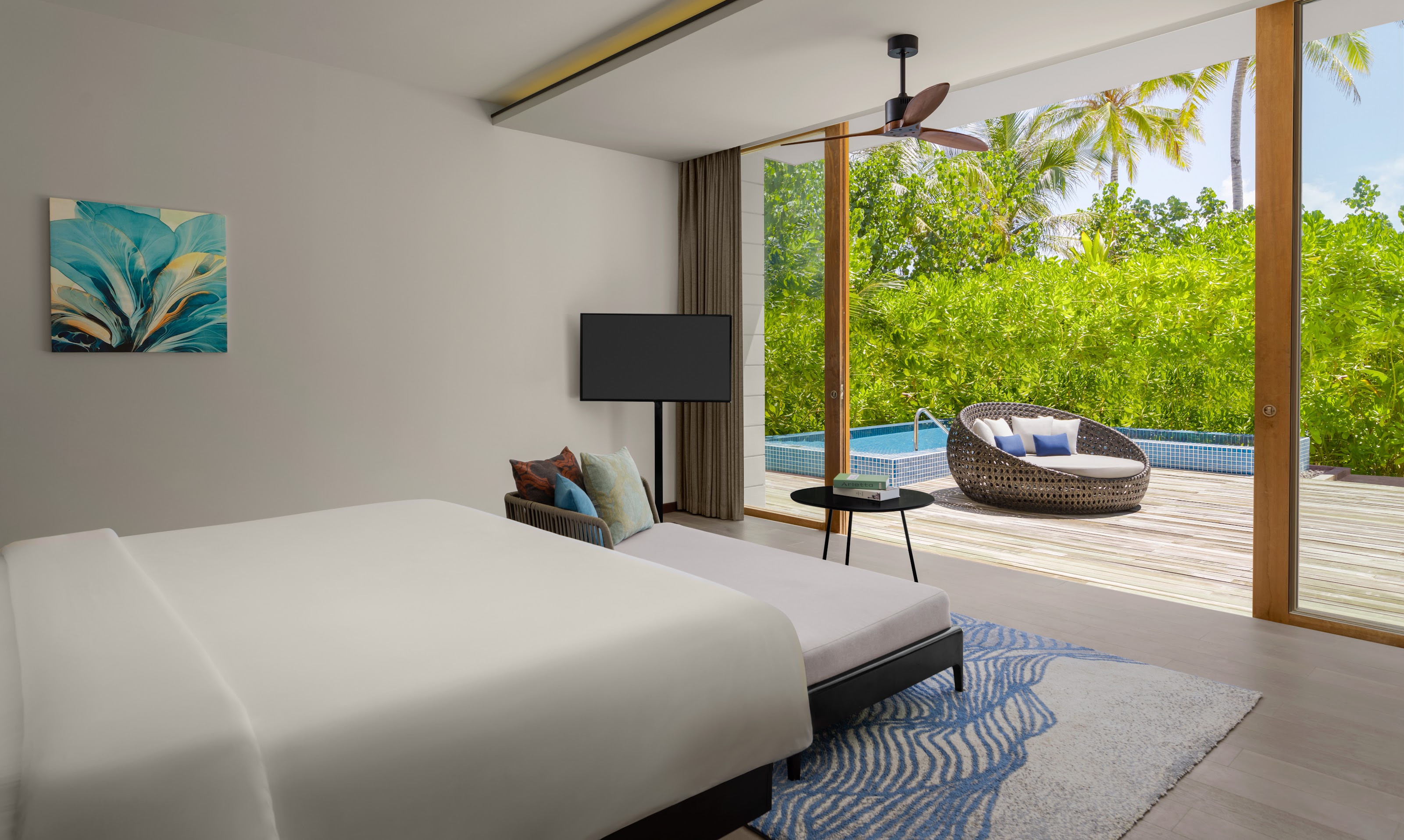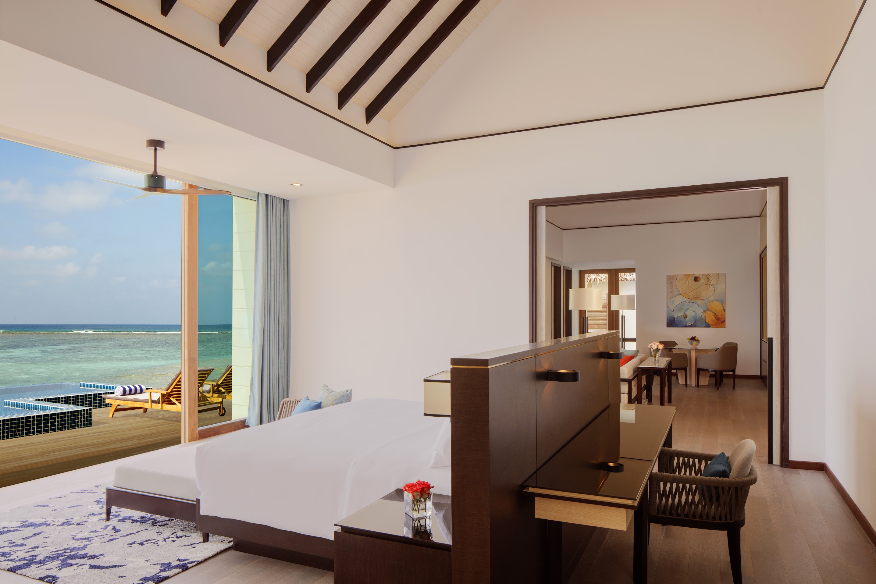Вилла на воде. 3 спальни (две – с кроватями king-size, одна – с кроватями twin), гостиная с обеденной зоной, гардеробная, 2 ванные комнаты (одна – с ванной и душевой кабиной, другая – с душевой кабиной), терраса с бассейном, обеденной зоной на открытом воздухе, гамаком над водой и прямым спуском к воде. Гостиная и спальни разделены дверями.