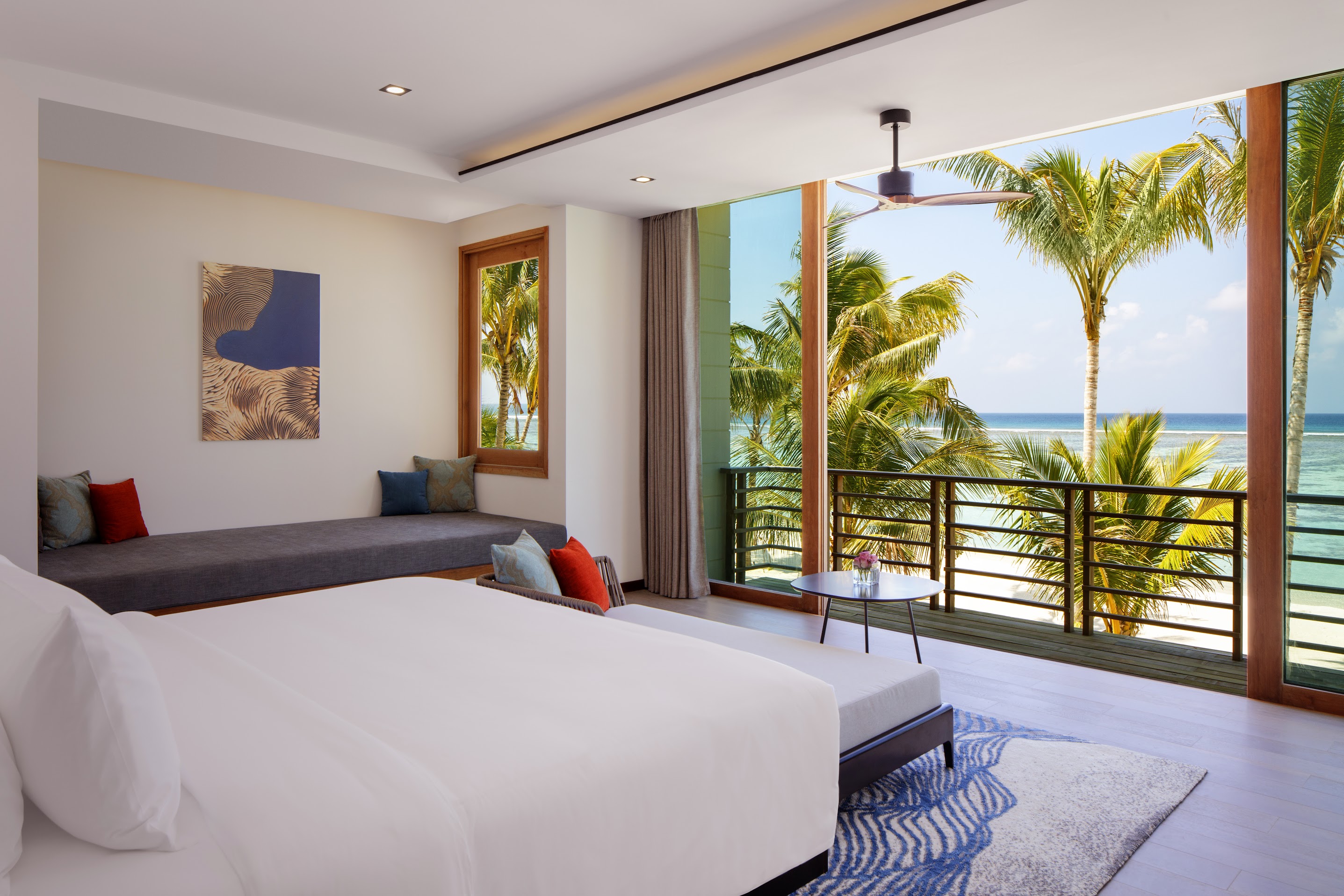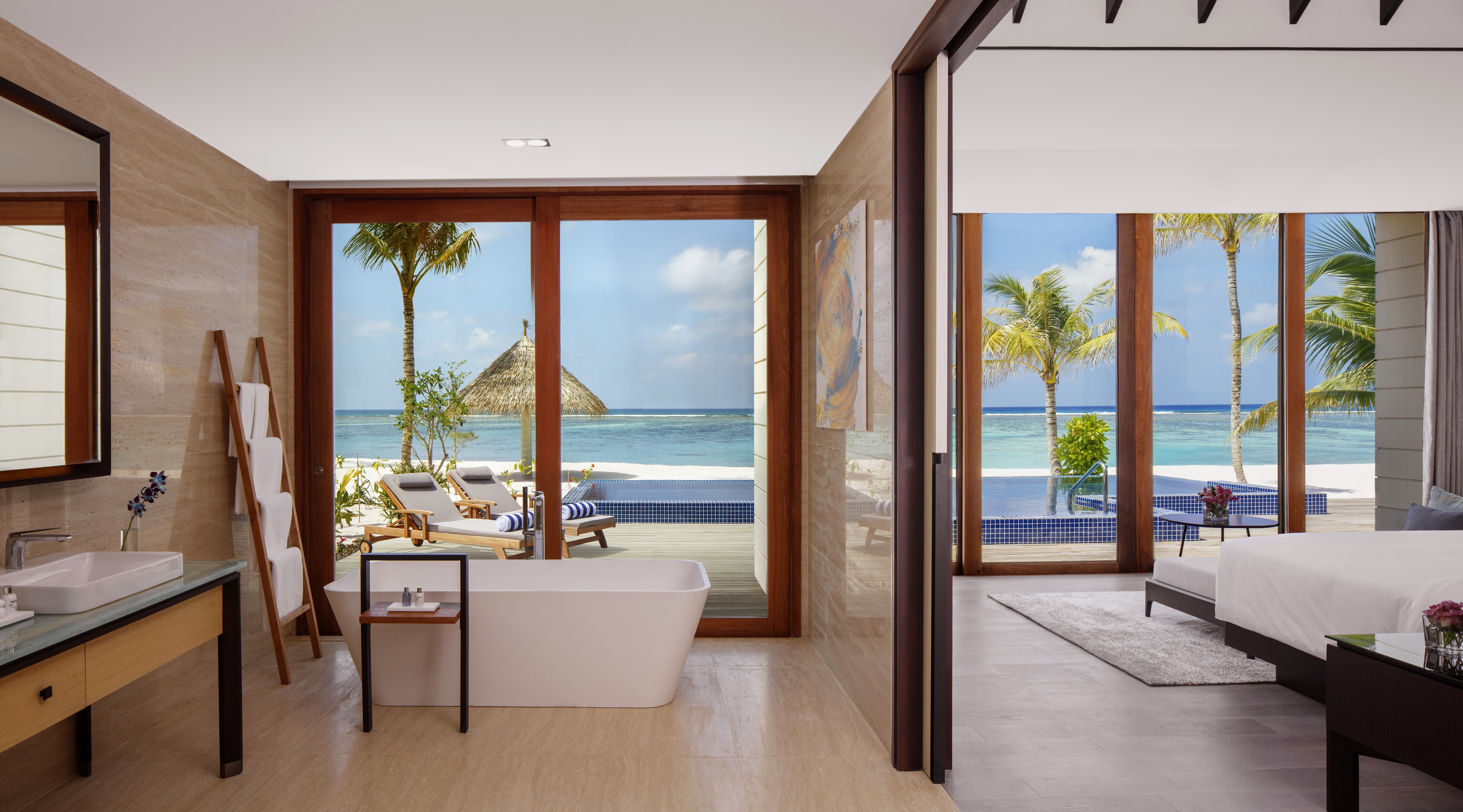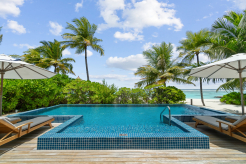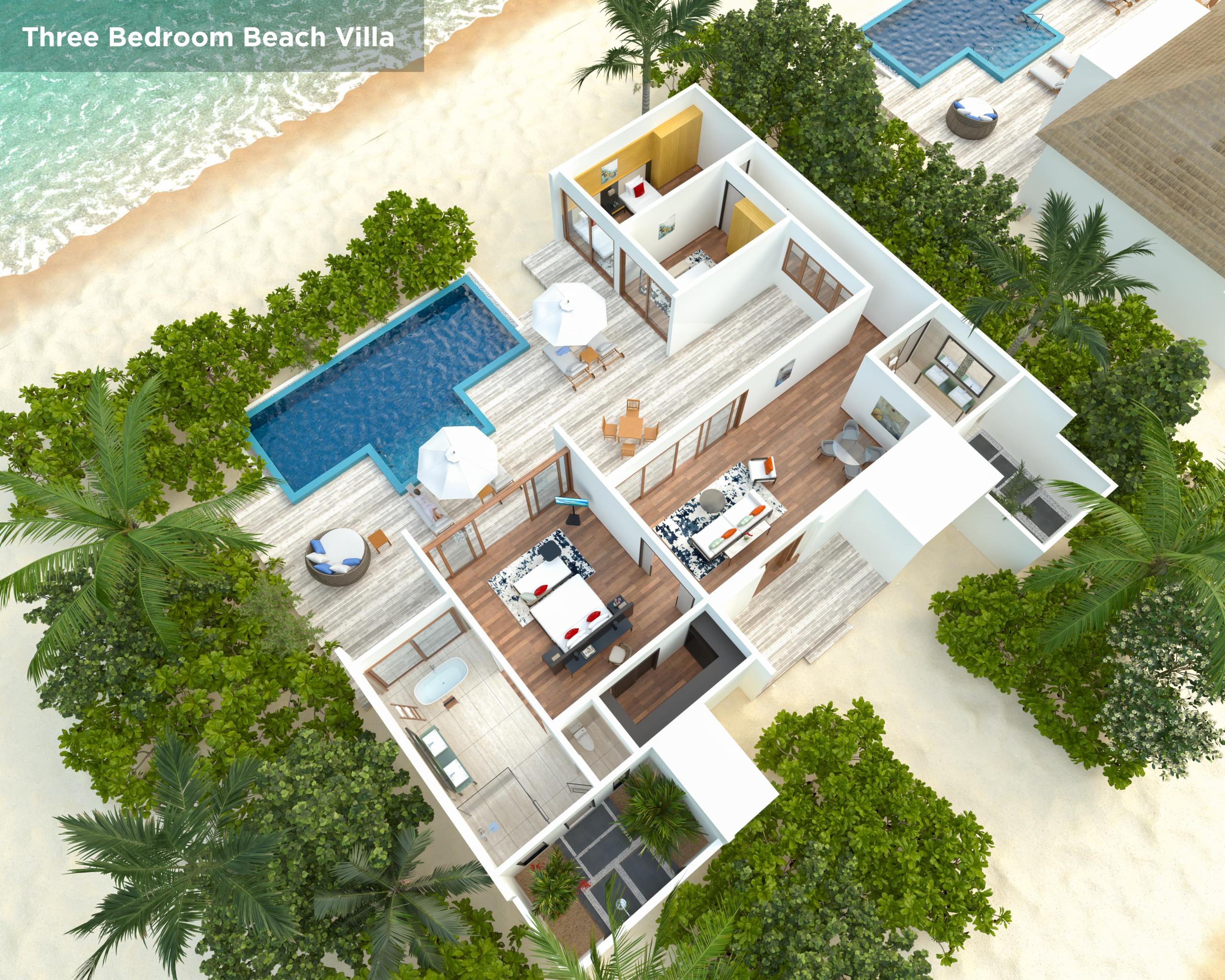 Вилла на берегу. 3 спальни (две – с кроватями king-size, одна – с кроватями twin), гостиная с обеденной зоной, гардеробная, 2 ванные комнаты (одна – с ванной и душевой кабиной, другая – с душевой кабиной), душ на открытом воздухе, терраса с бассейном и обеденной зоной на открытом воздухе. Гостиная и спальни разделены дверями.