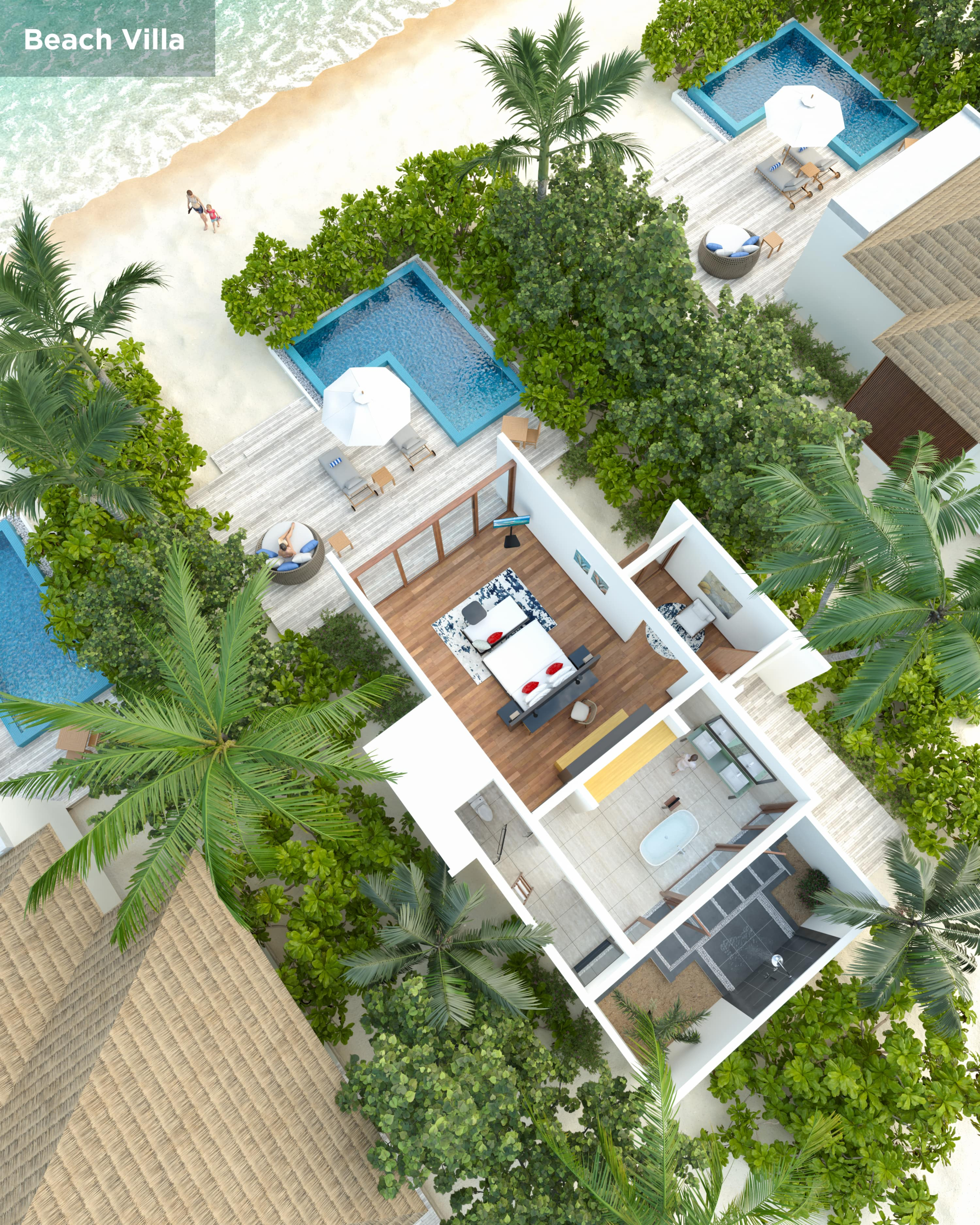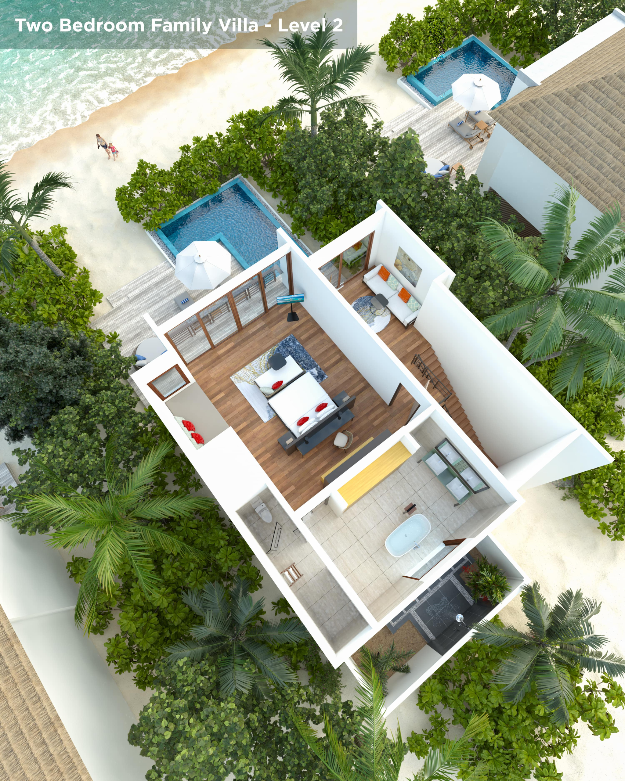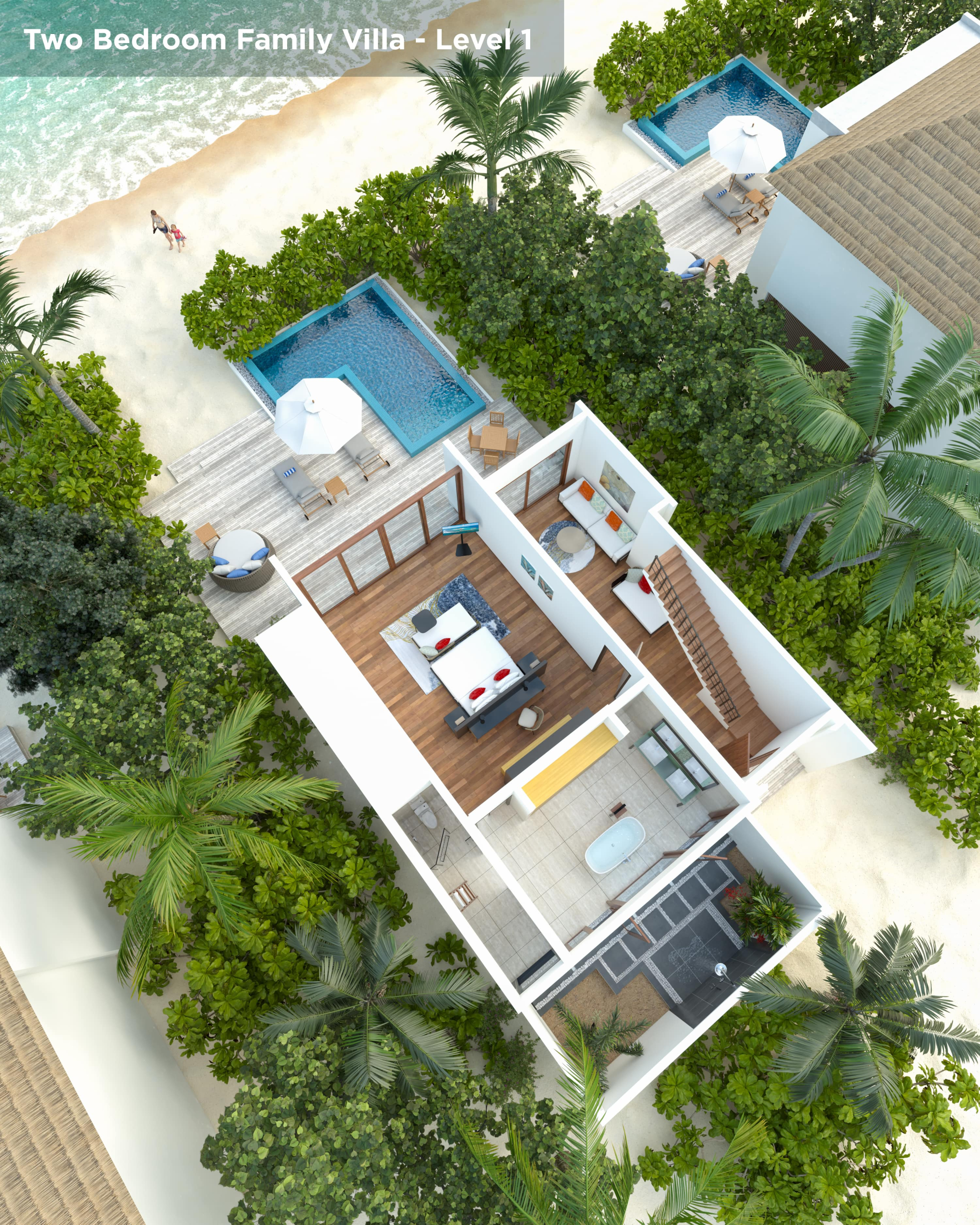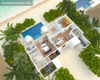 Вилла на берегу. 2 спальни (одна – с кроватью king-size, другая – с кроватями twin), гостиная с обеденной зоной, гардеробная, 2 ванные комнаты (одна – с ванной и душевой кабиной, другая – с душевой кабиной), душ на открытом воздухе, терраса с бассейном и обеденной зоной на открытом воздухе. Гостиная и спальни разделены дверями.