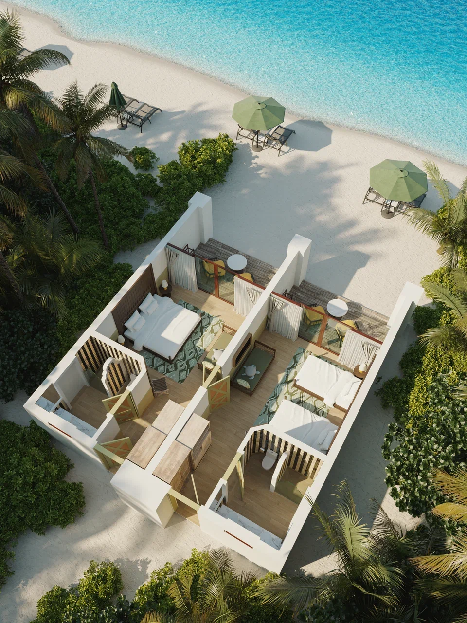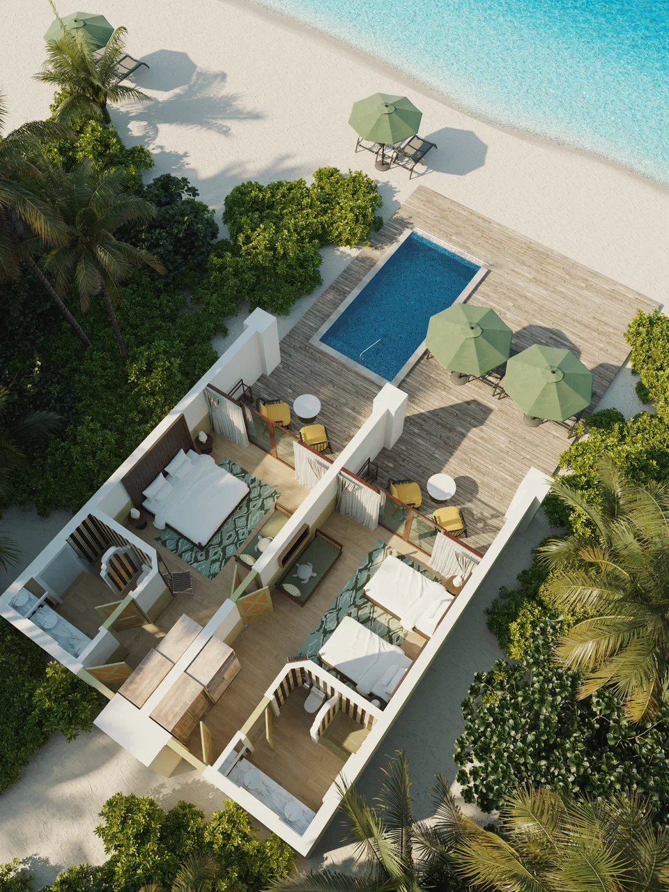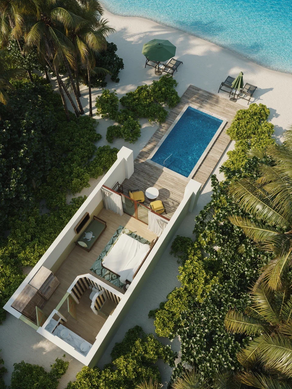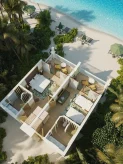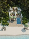 Вилла на берегу. 2 спальни с кроватями king-size (или одна – с кроватью king-size, другая – с кроватями twin), 2 ванные комнаты (каждая с ванной и душем на открытом воздухе), 2 террасы с бассейном.