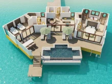Вилла на воде. 2 спальни (одна – с кроватью king-size, другая – с кроватями twin), гостиная с обеденной зоной, 2 ванные комнаты (одна – с душевой кабиной, другая – с ванной и душевой кабиной), терраса с бассейном, гамаком над водой и обеденной зоной на открытом воздухе. Прямой спуск к воде.