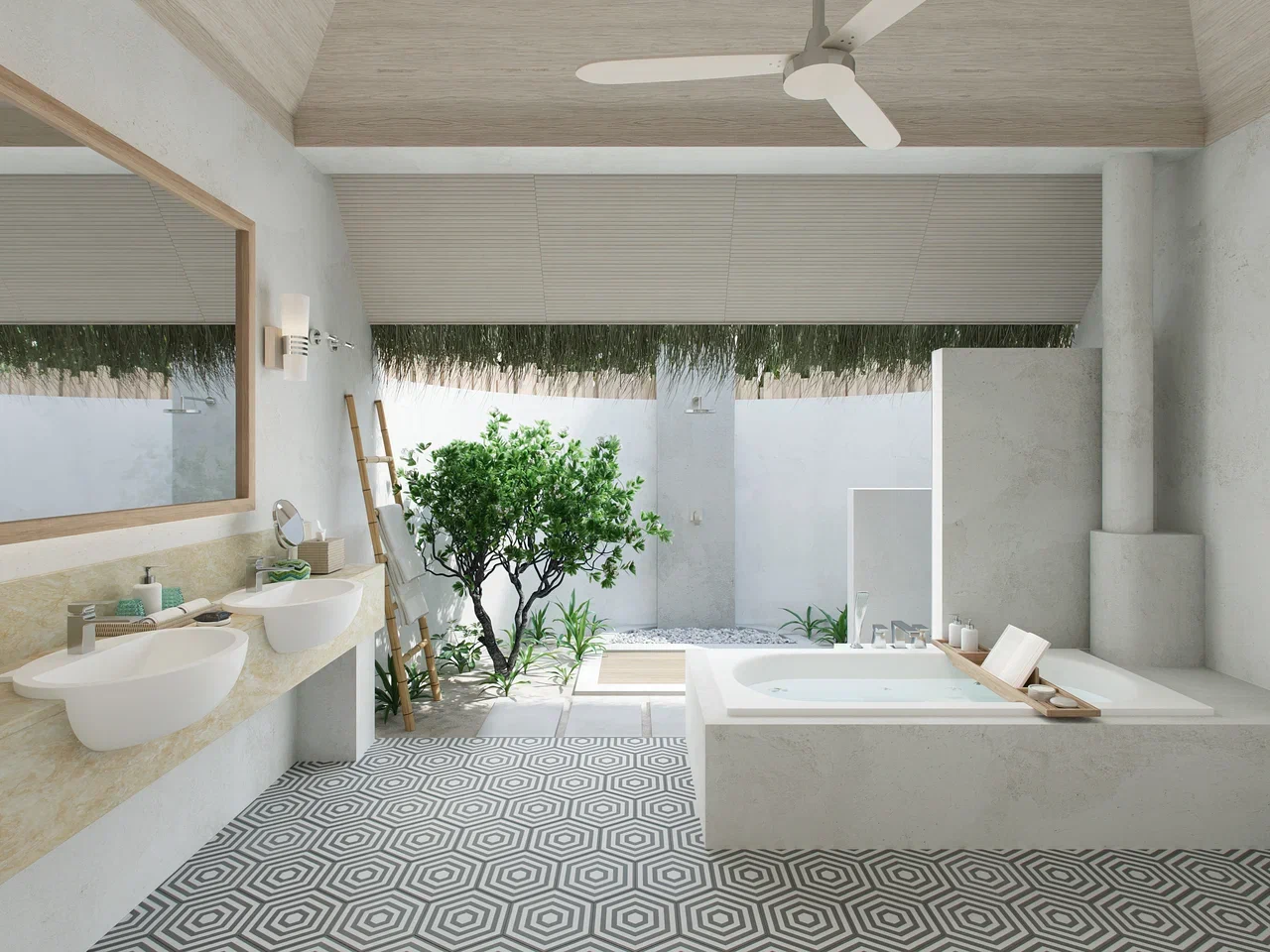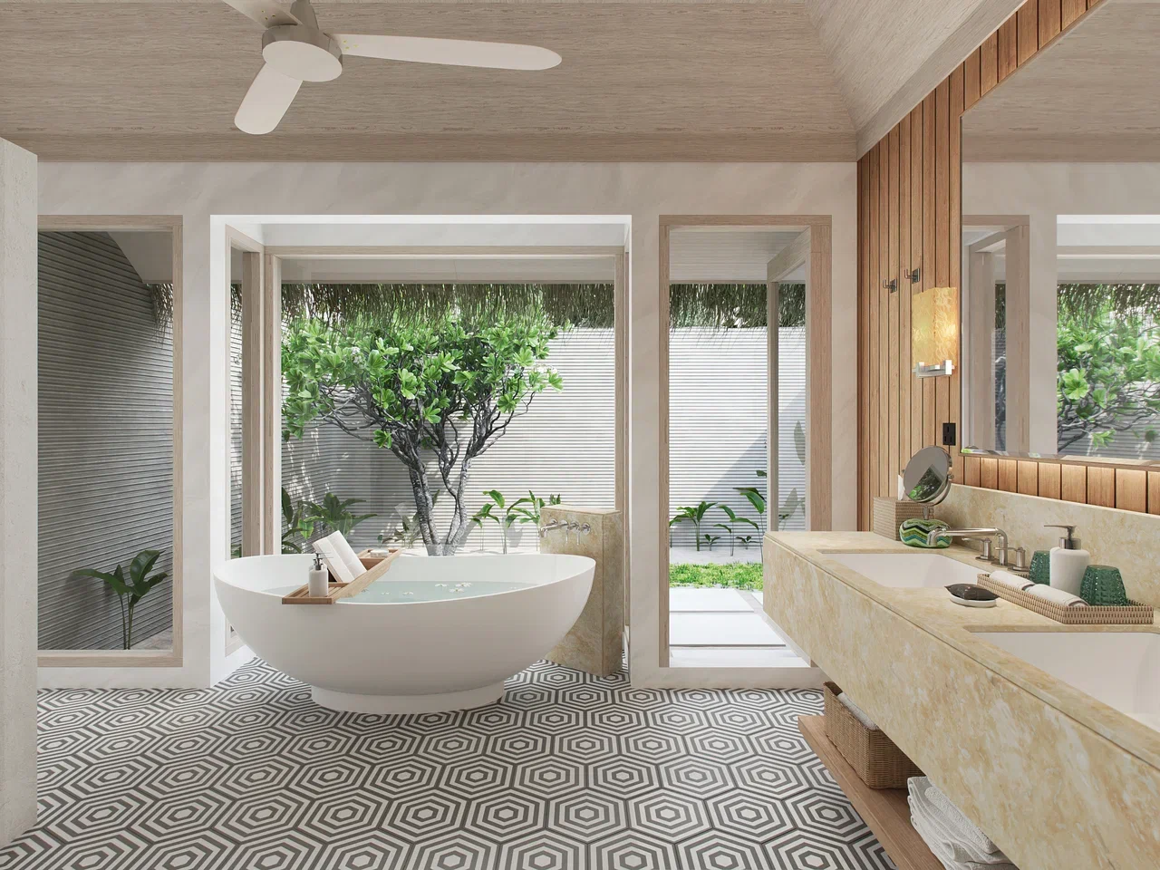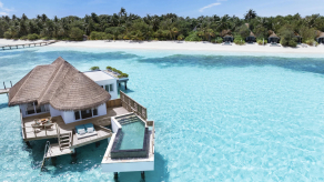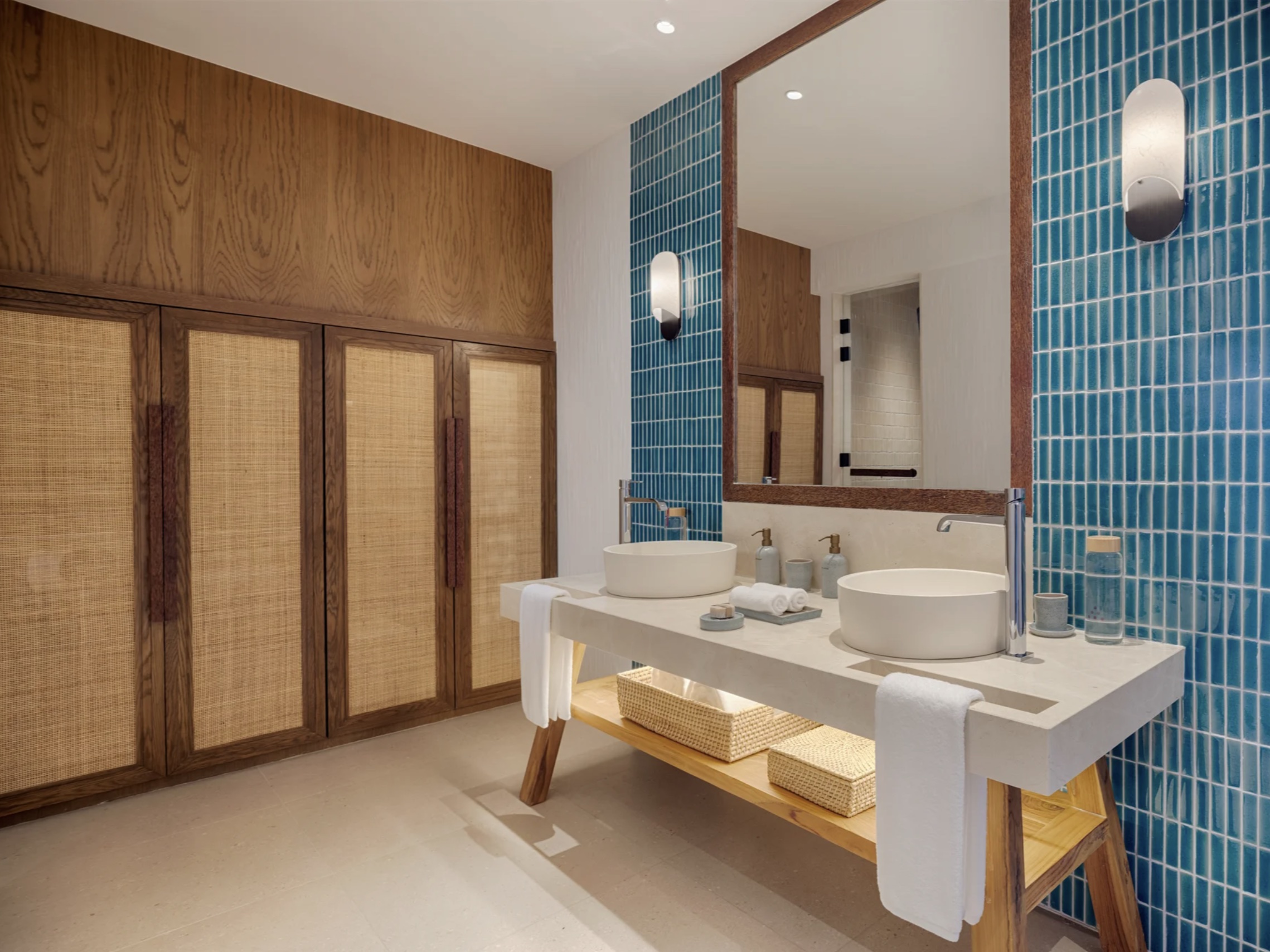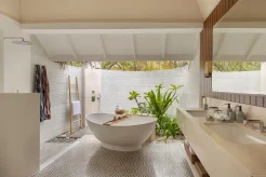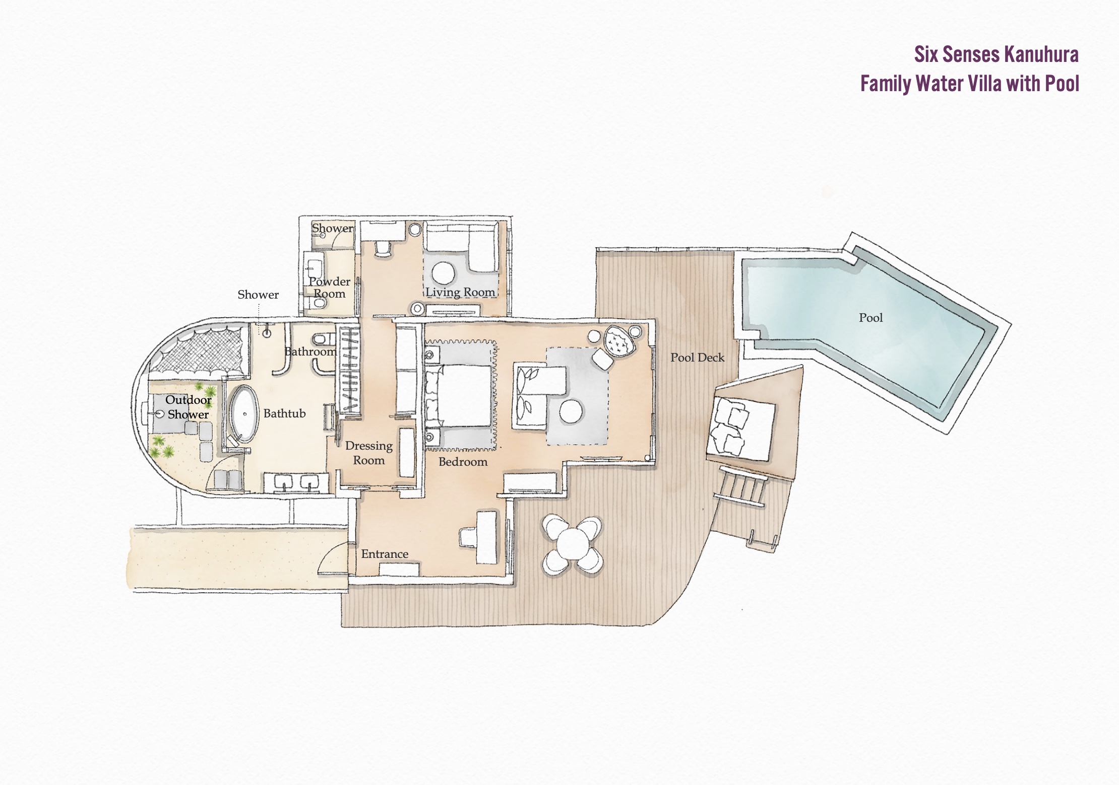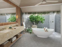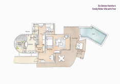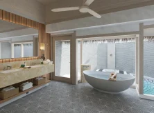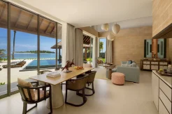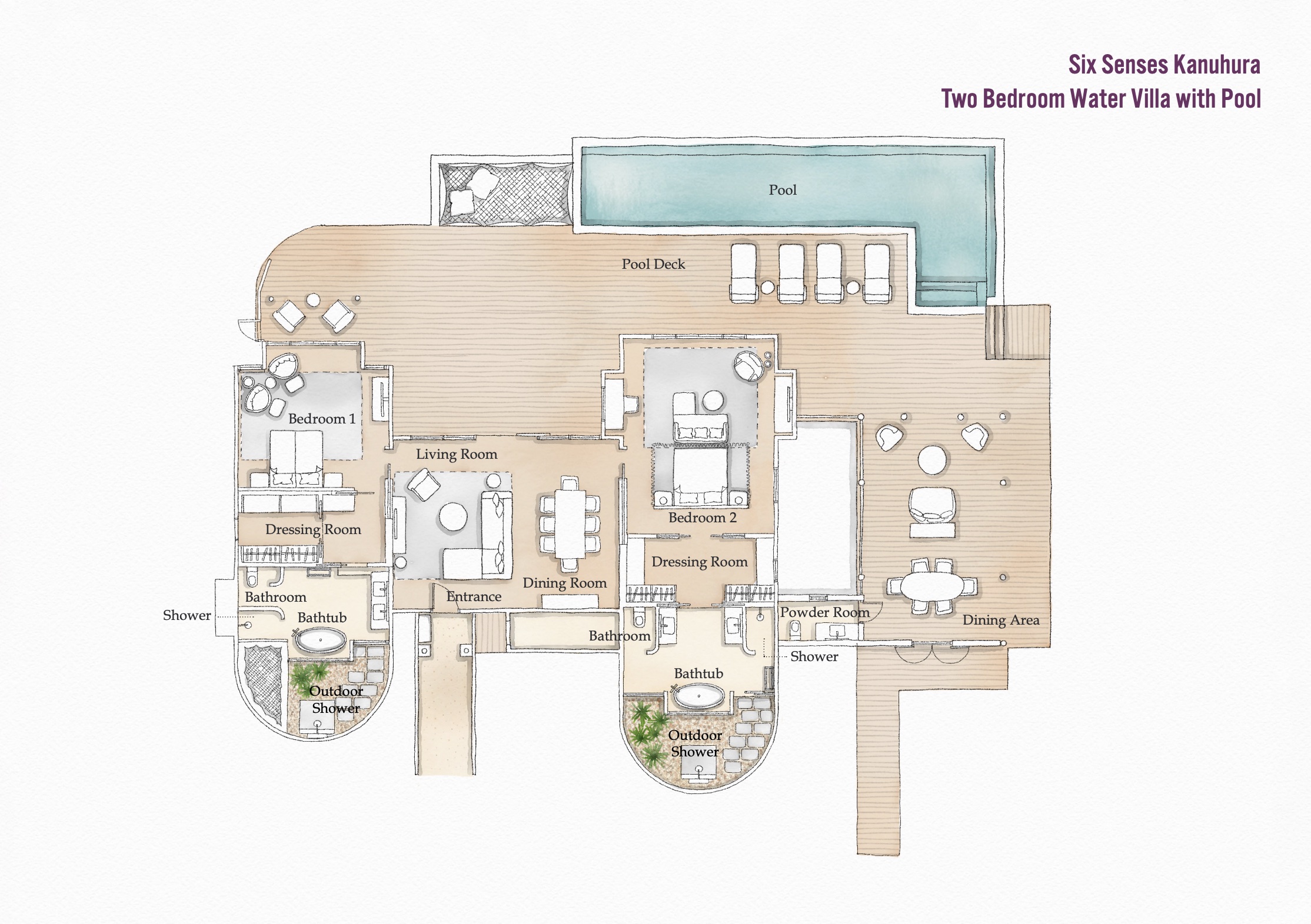 Вилла на воде. 2 спальни с кроватями king-size или twin (одна из них – с гостиной зоной), гостиная с обеденной зоной, 2 гардеробные, 2 ванные комнаты (каждая с ванной и душевой кабиной), гостевой туалет, 2 душа на открытом воздухе, гамак над водой, терраса с бассейном, беседкой с обеденной зоной и прямым спуском к воде. Гостиная и спальни разделены дверями.