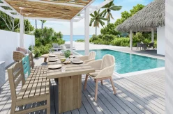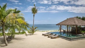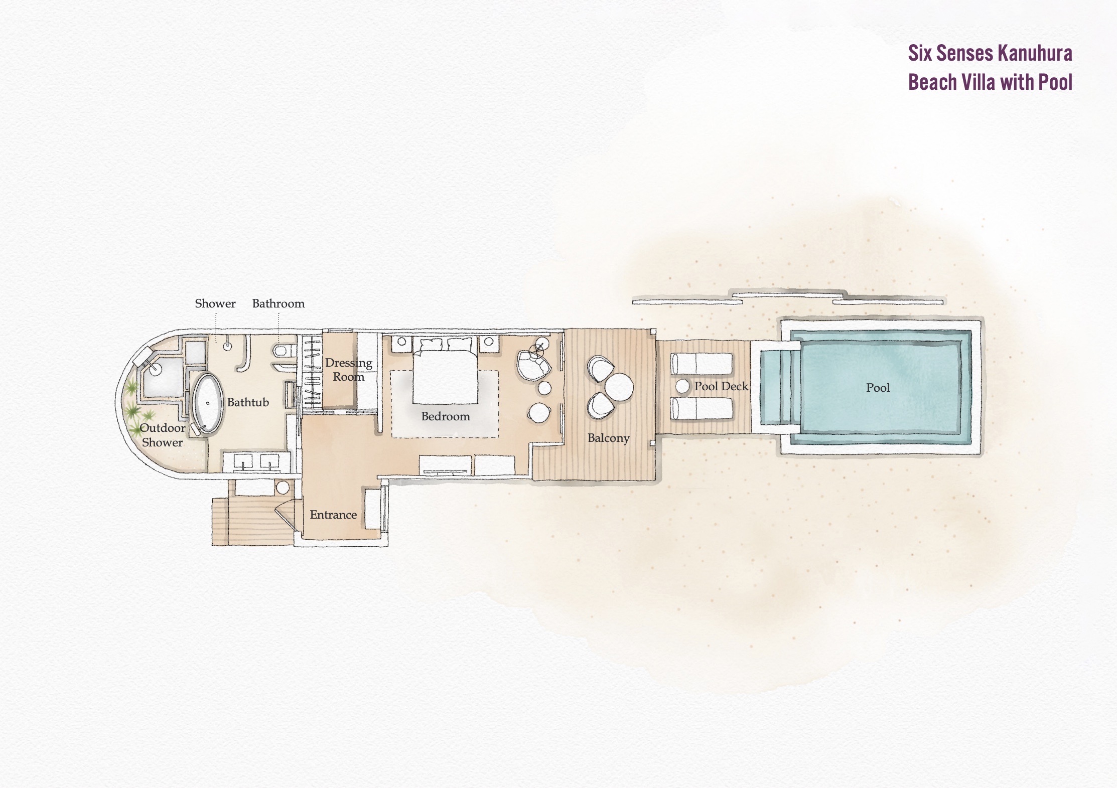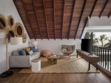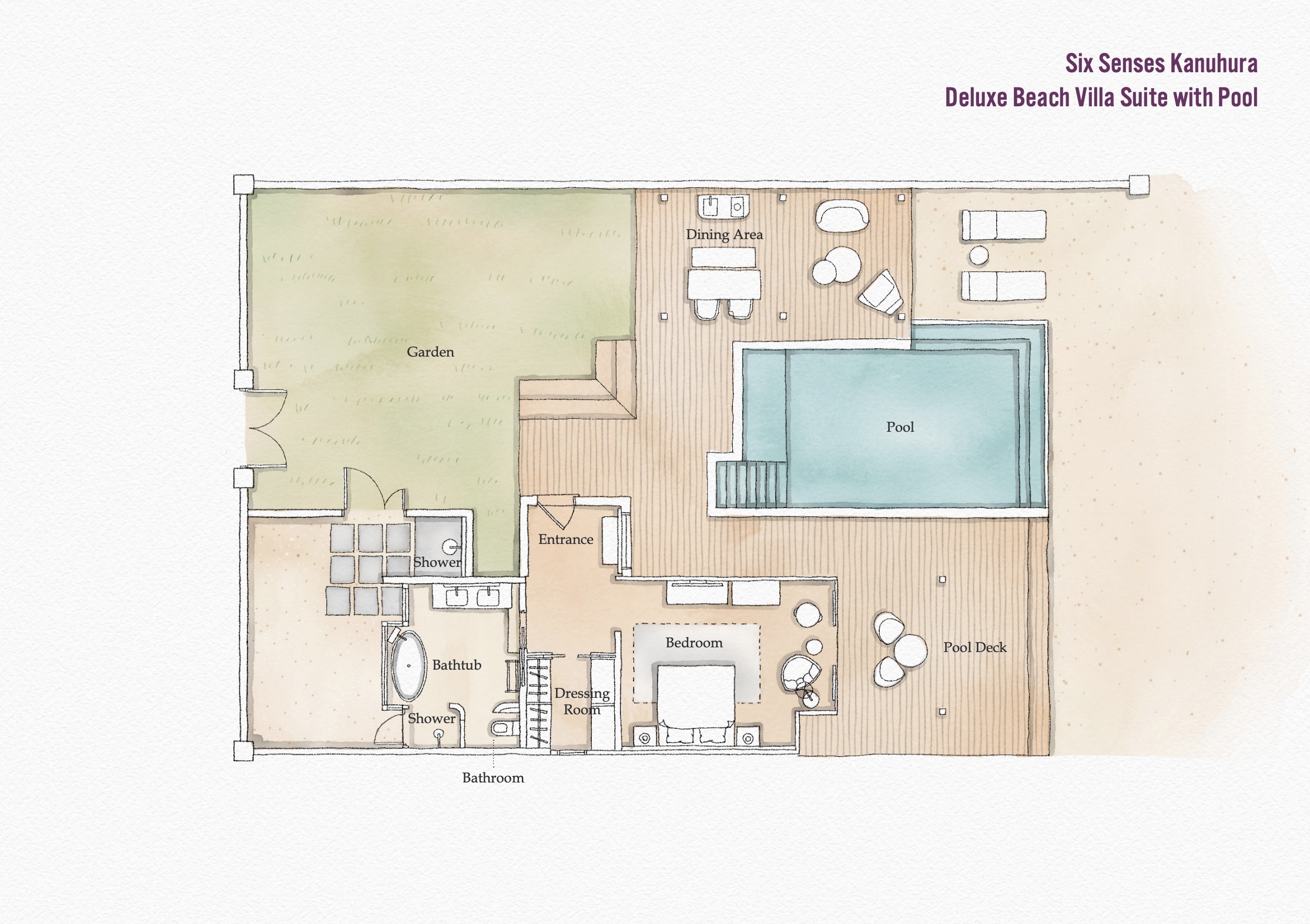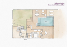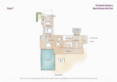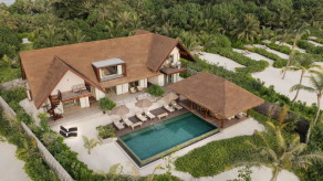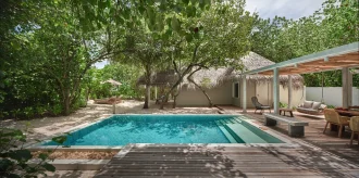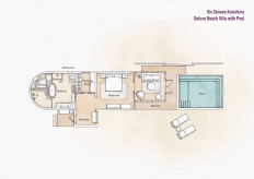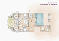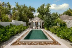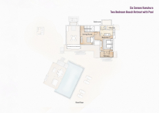 Вилла на берегу. 2 спальни с кроватями king-size или twin, гостиная, 2 гардеробные, 2 ванные комнаты (одна – с ванной и душевой кабиной, другая – с ванной), 2 душа на открытом воздухе, терраса с бассейном и беседкой с обеденной зоной, частный сад. Гостиная и спальни разделены шторами.