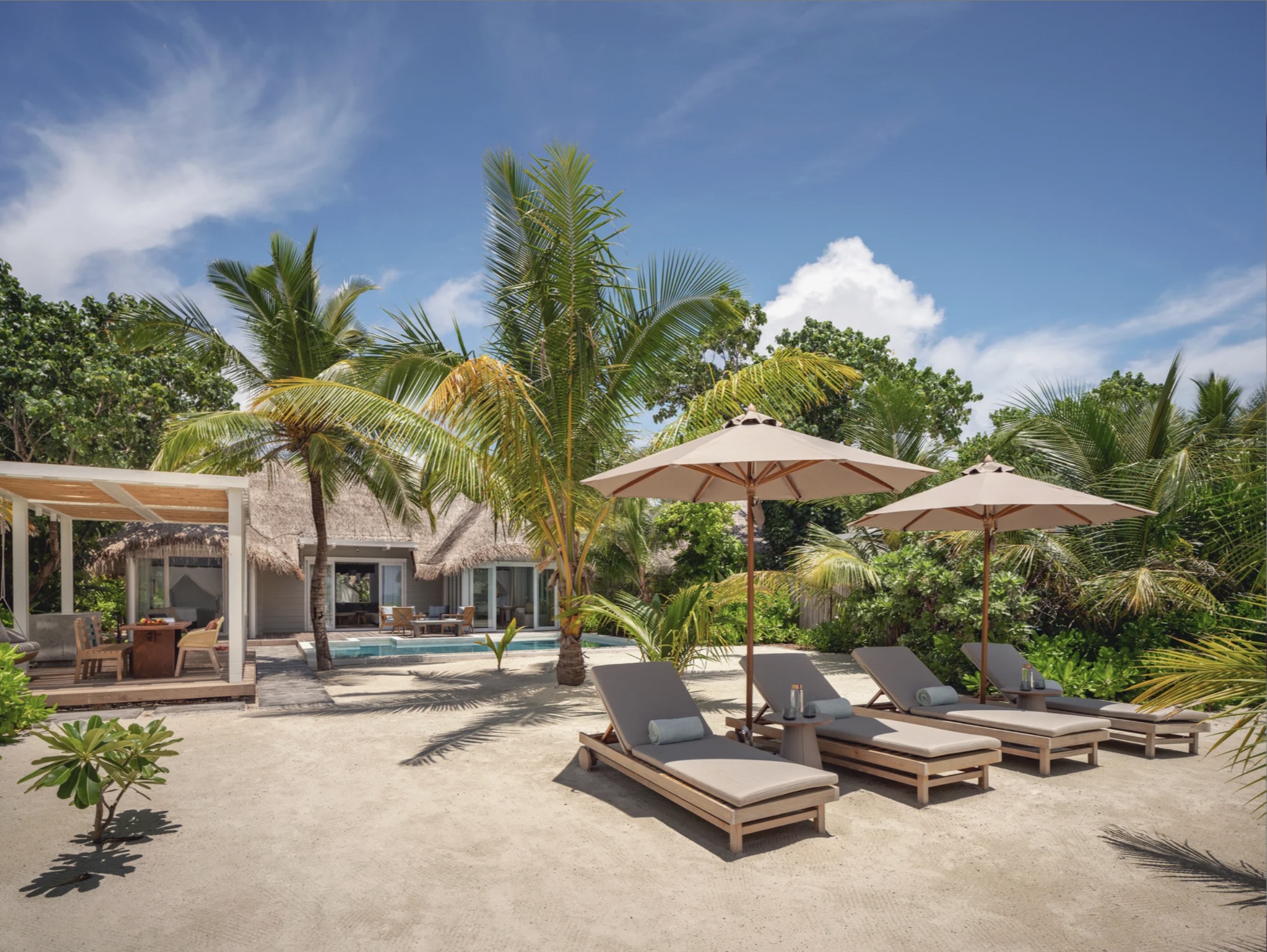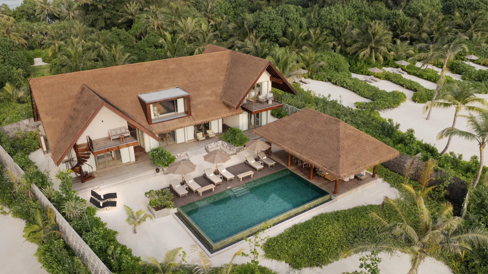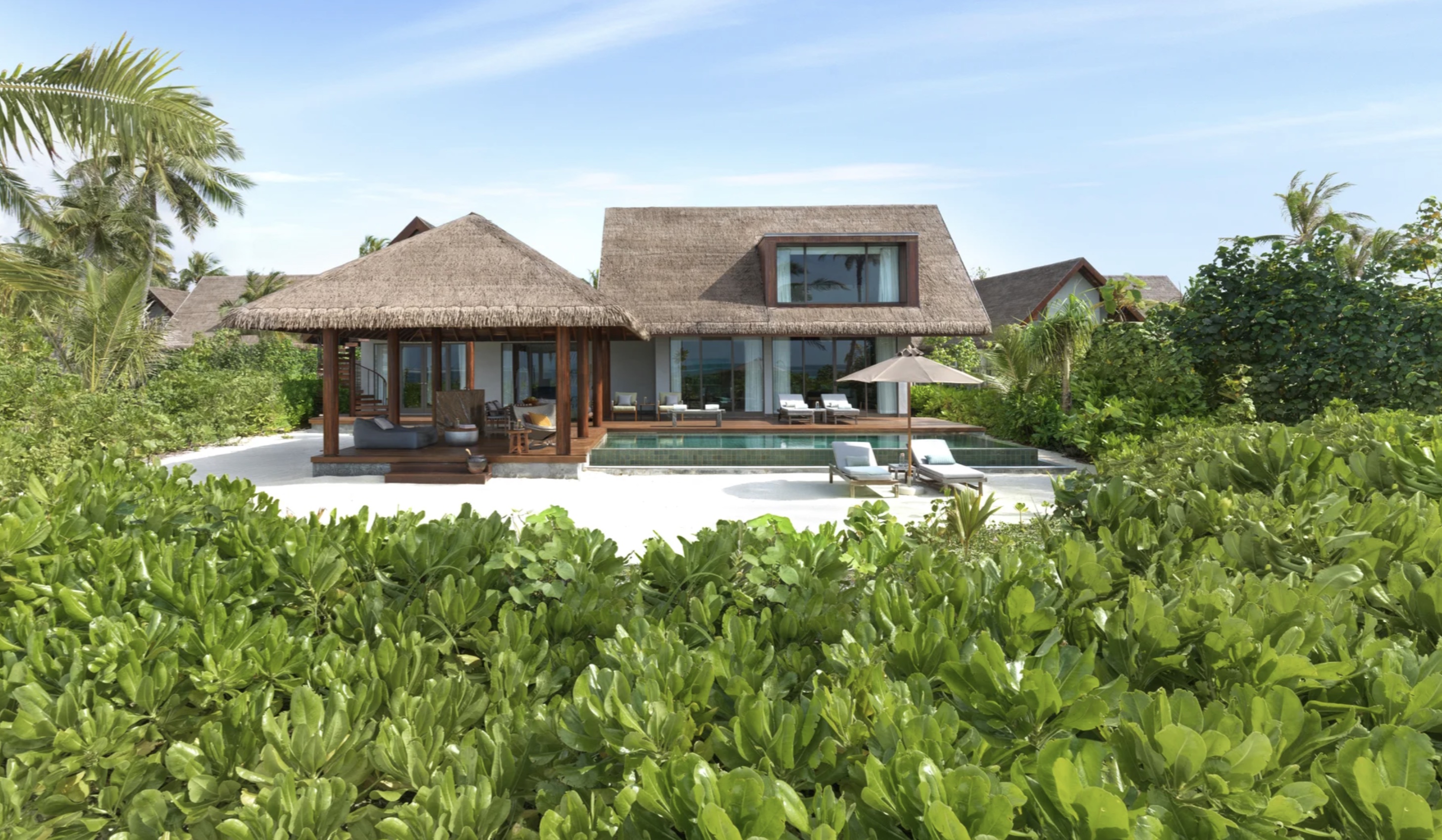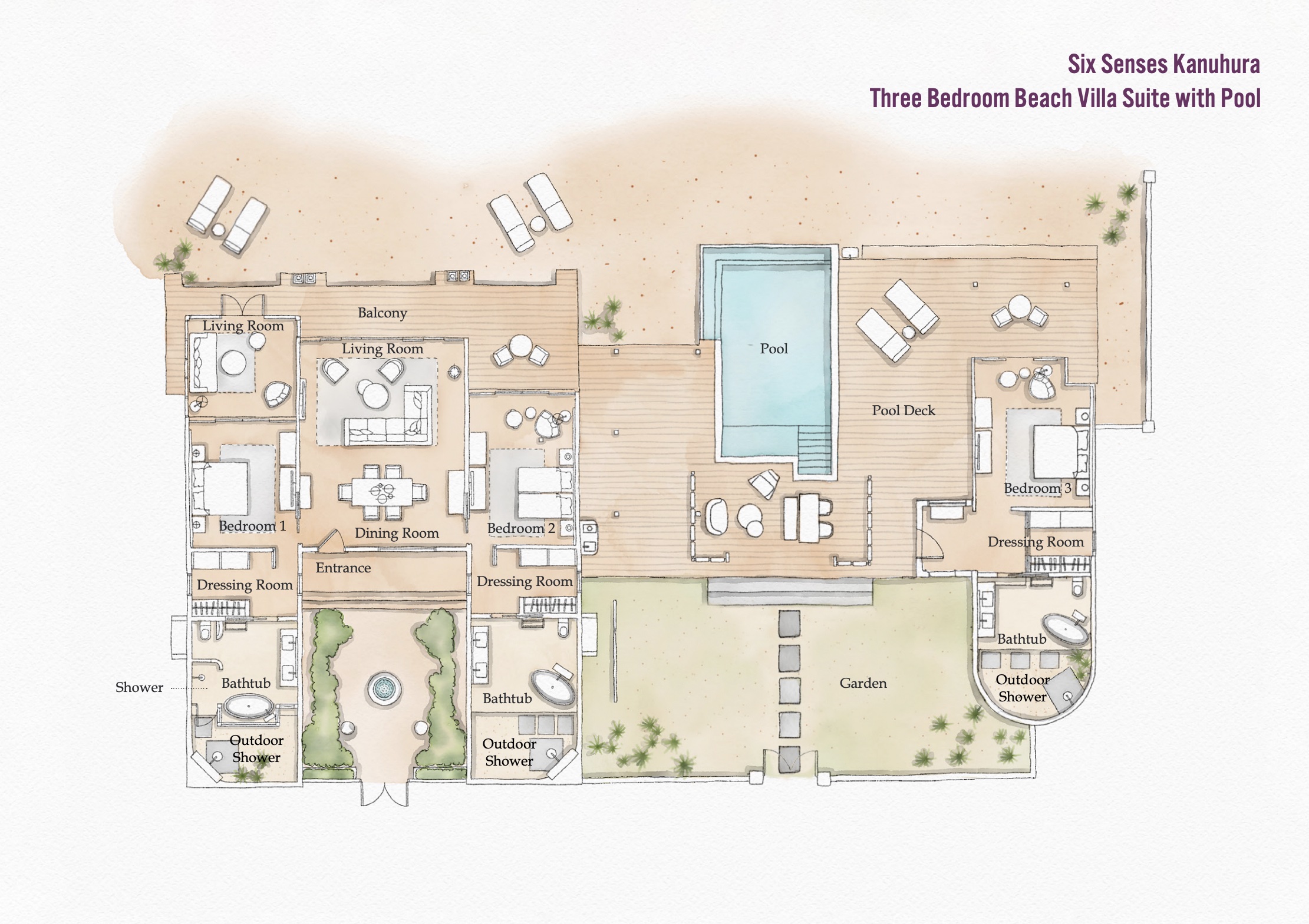 Вилла на берегу. 3 спальни с кроватями king-size или twin, 2 гостиные (одна из них – с обеденной зоной), 3 гардеробные, 3 ванные комнаты (одна – с ванной и душевой кабиной, две – с ванной), 3 душа на открытом воздухе, терраса с бассейном и беседкой с обеденной зоной, частный сад. Одна гостиная отделена от спален дверями, другая – шторами.