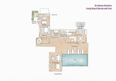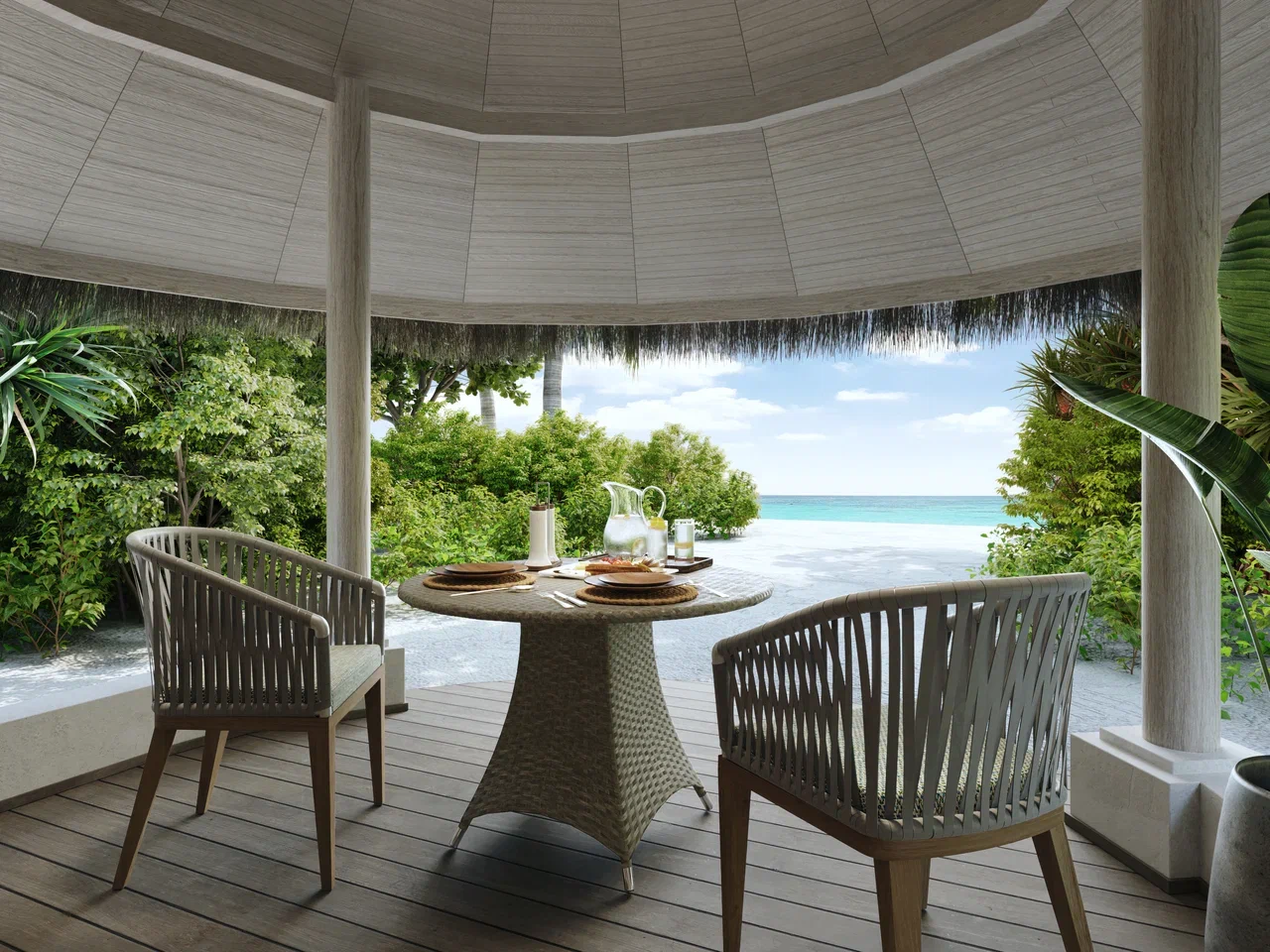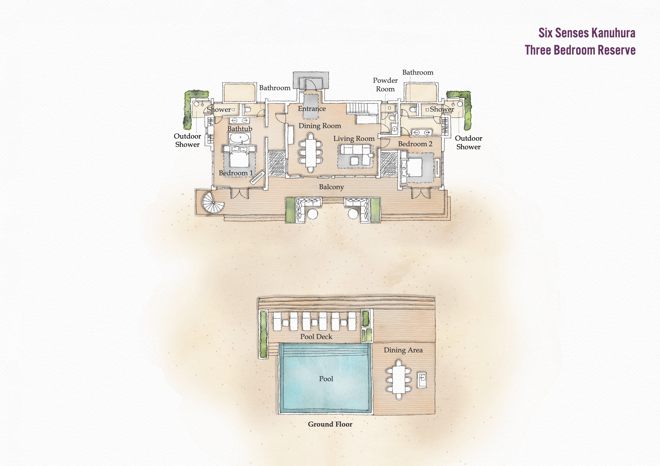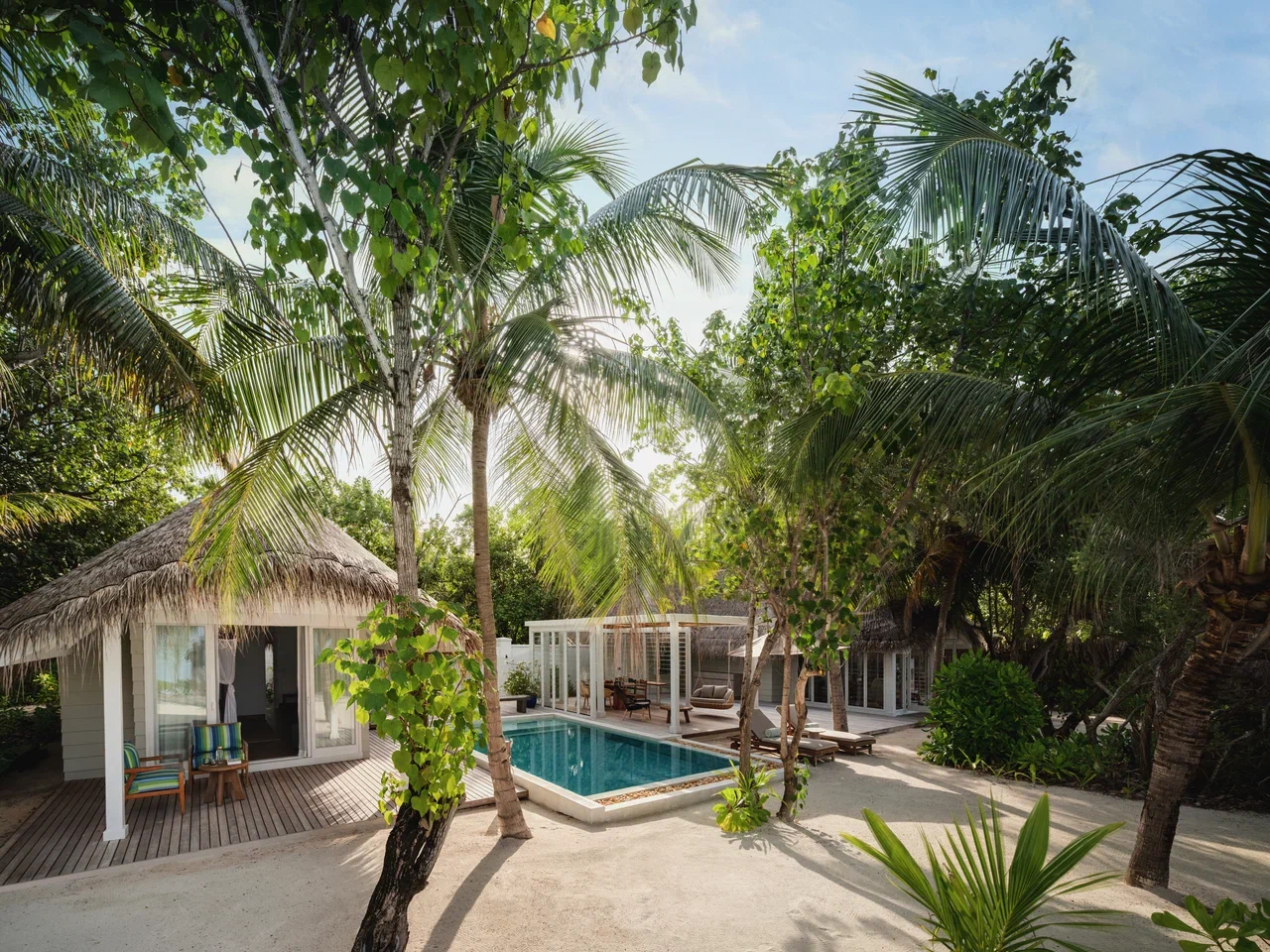 Вилла на берегу. 3 спальни с кроватями king-size или twin, 2 гостиные (одна из них – с обеденной зоной), 3 гардеробные, 3 ванные комнаты (одна – с ванной и душевой кабиной, две – с ванной), 3 душа на открытом воздухе, терраса с бассейном и беседкой с обеденной зоной, частный сад. Одна гостиная отделена от спален дверями, другая – шторами.