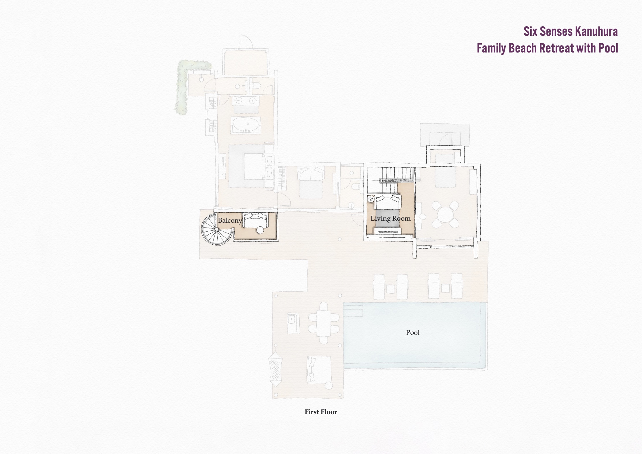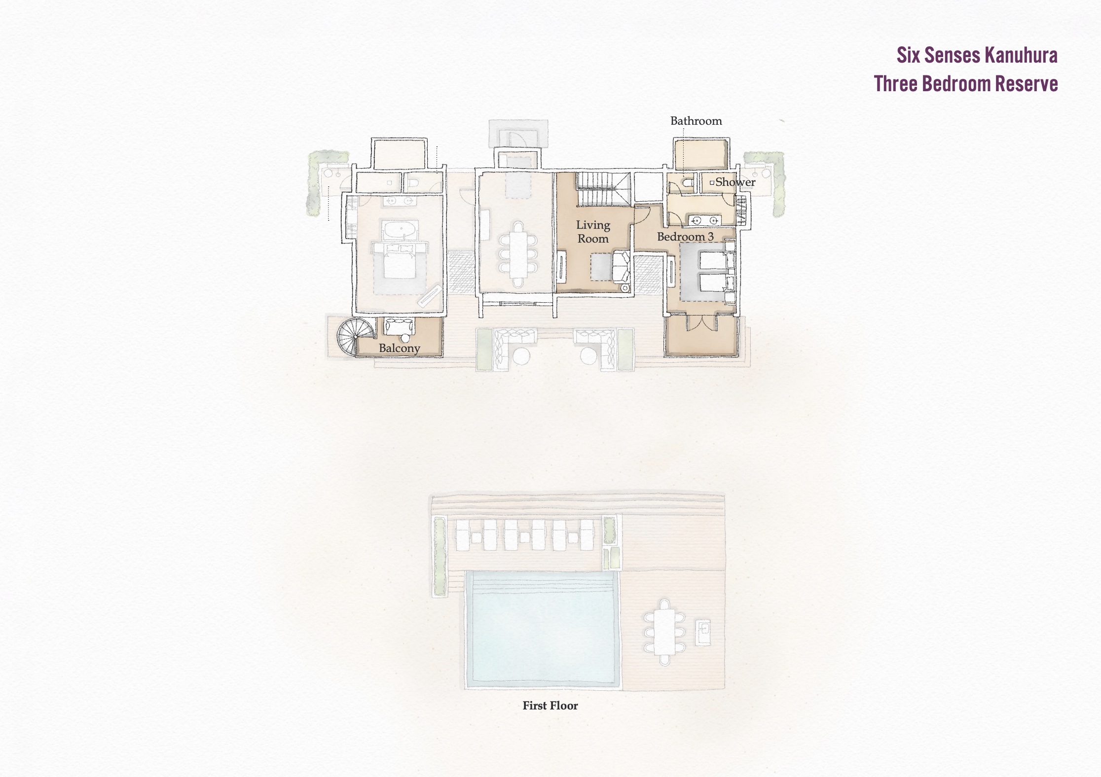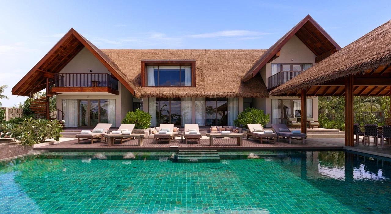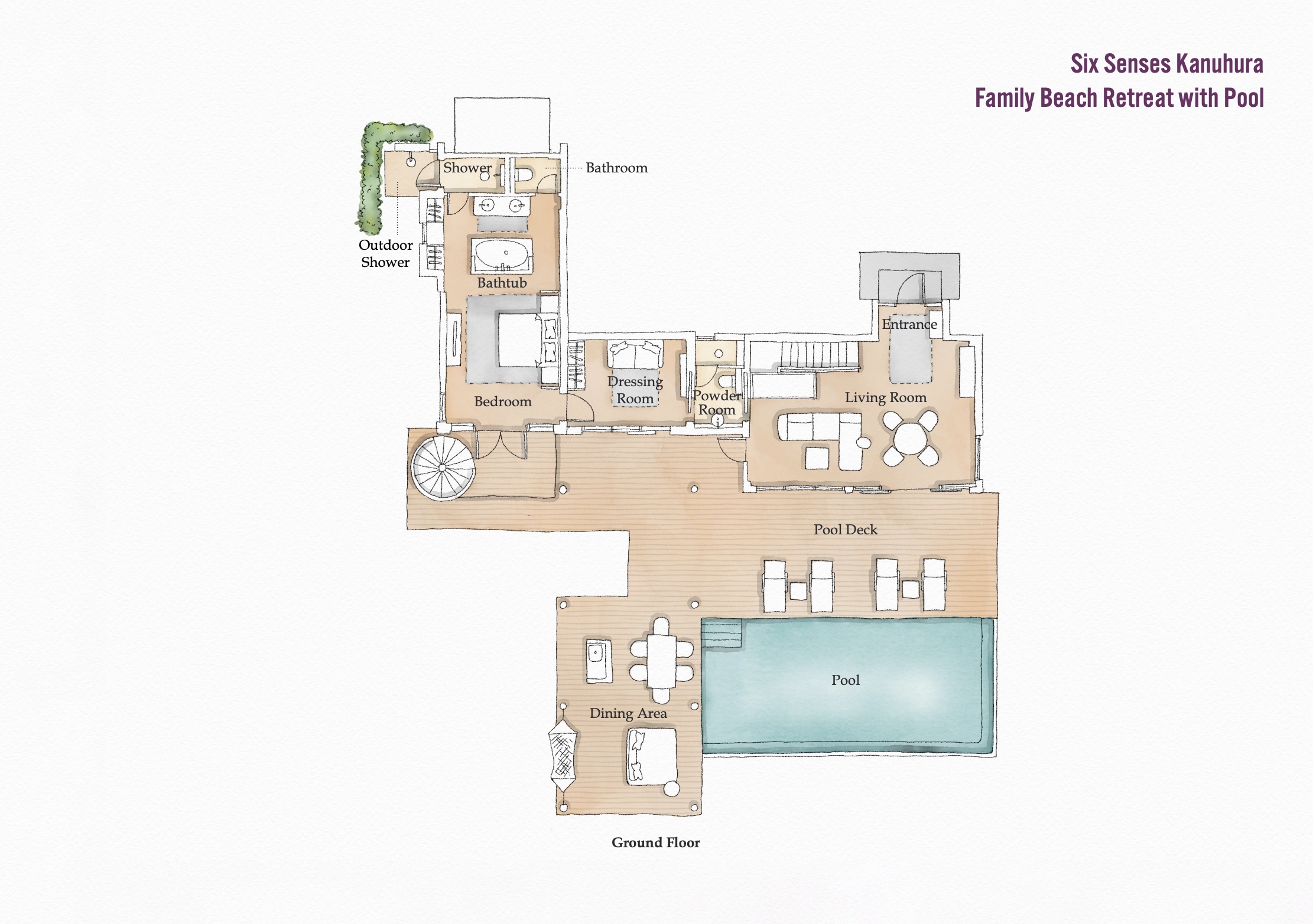 Вилла на берегу. 3 спальни с кроватями king-size или twin, 2 гостиные (одна из них – с обеденной зоной), 3 гардеробные, 3 ванные комнаты (одна – с ванной и душевой кабиной, две – с ванной), 3 душа на открытом воздухе, терраса с бассейном и беседкой с обеденной зоной, частный сад. Одна гостиная отделена от спален дверями, другая – шторами.
