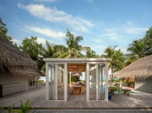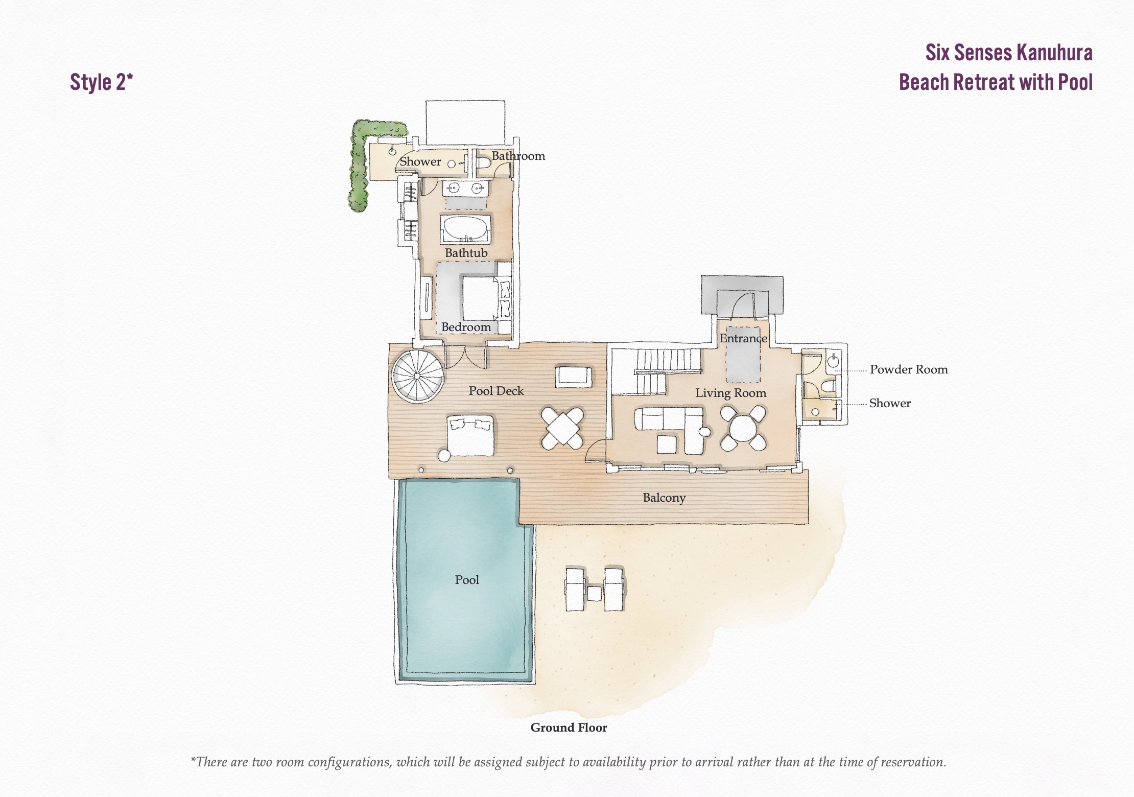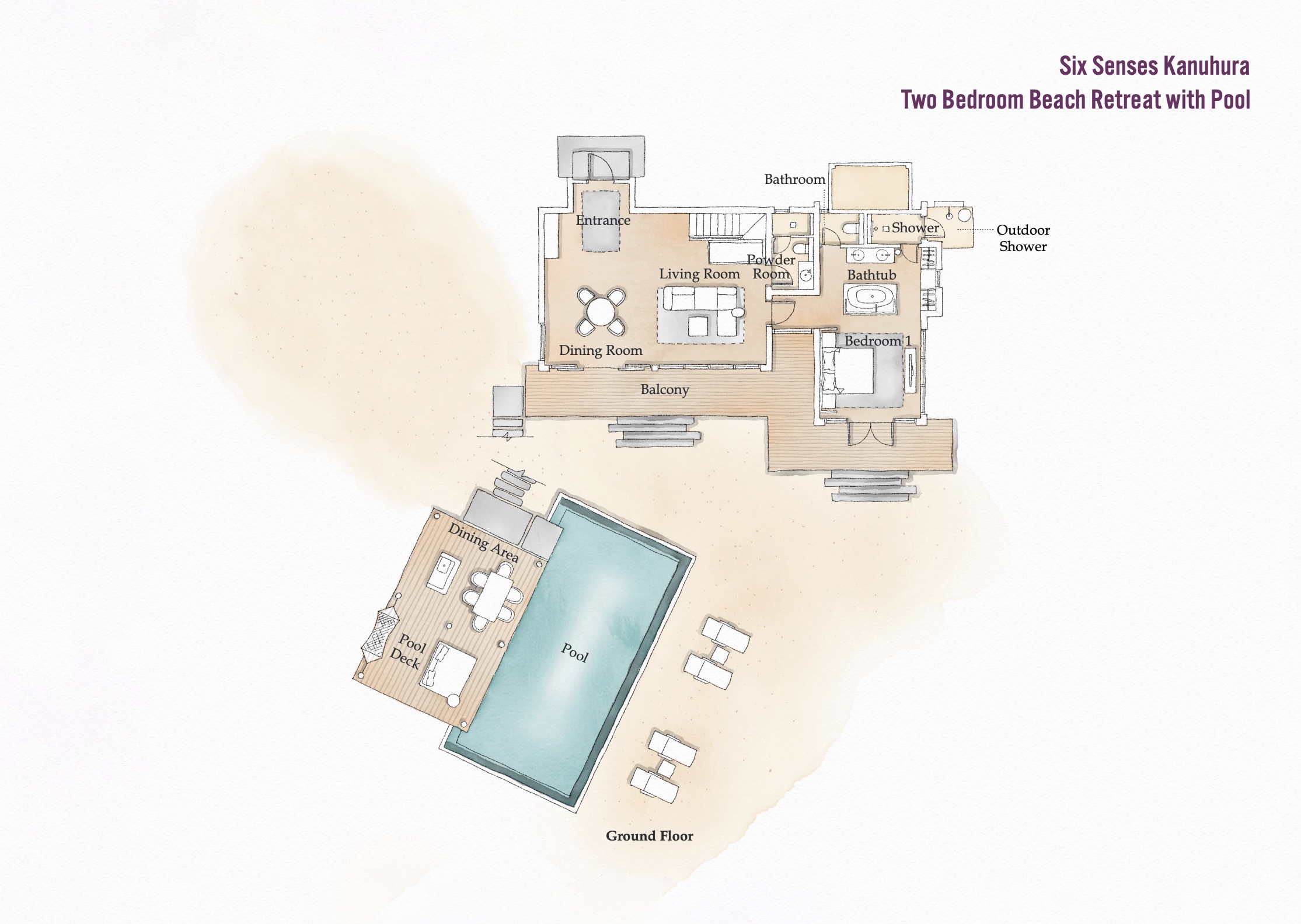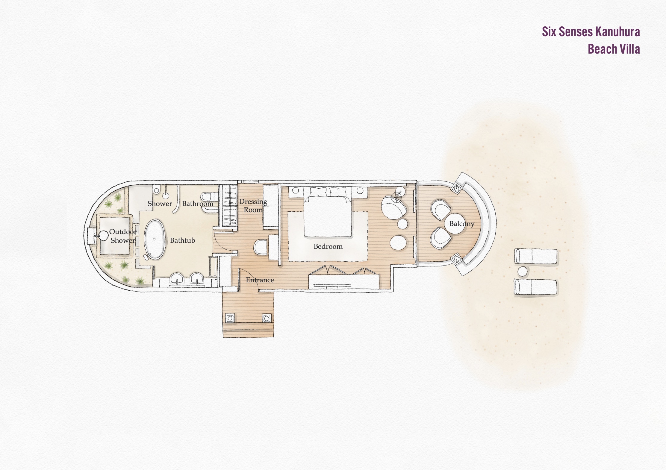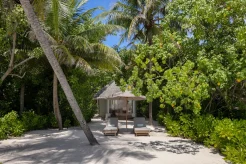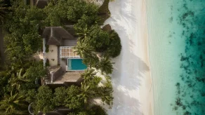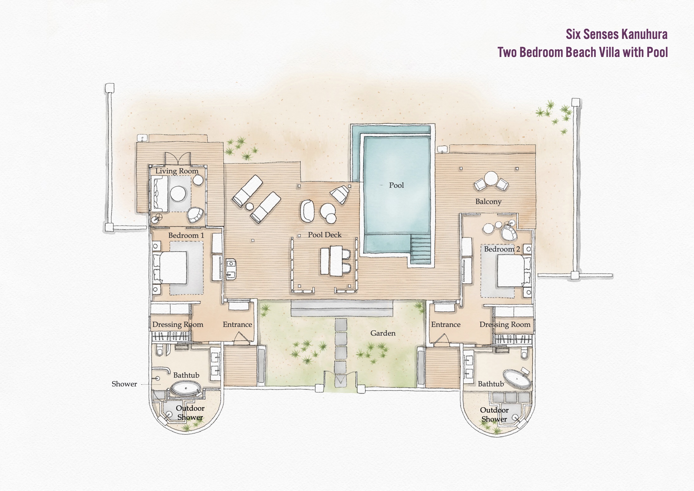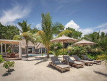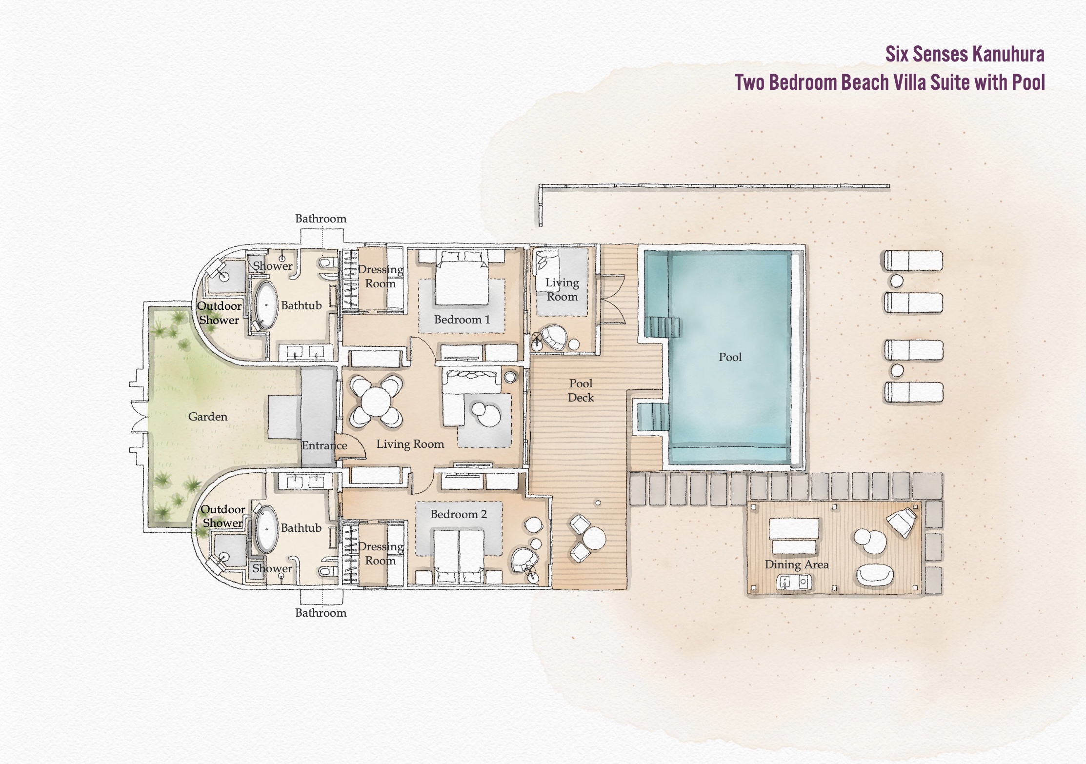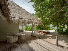Вилла на берегу. 2 спальни с кроватями king-size или twin, 2 гостиные (одна из них – с обеденной зоной), 2 гардеробные, 2 ванные комнаты (каждая с ванной и душевой кабиной), 2 душа на открытом воздухе, терраса с бассейном и беседкой с обеденной зоной, частный сад. Одна гостиная отделена от спален дверями, другая – шторами.