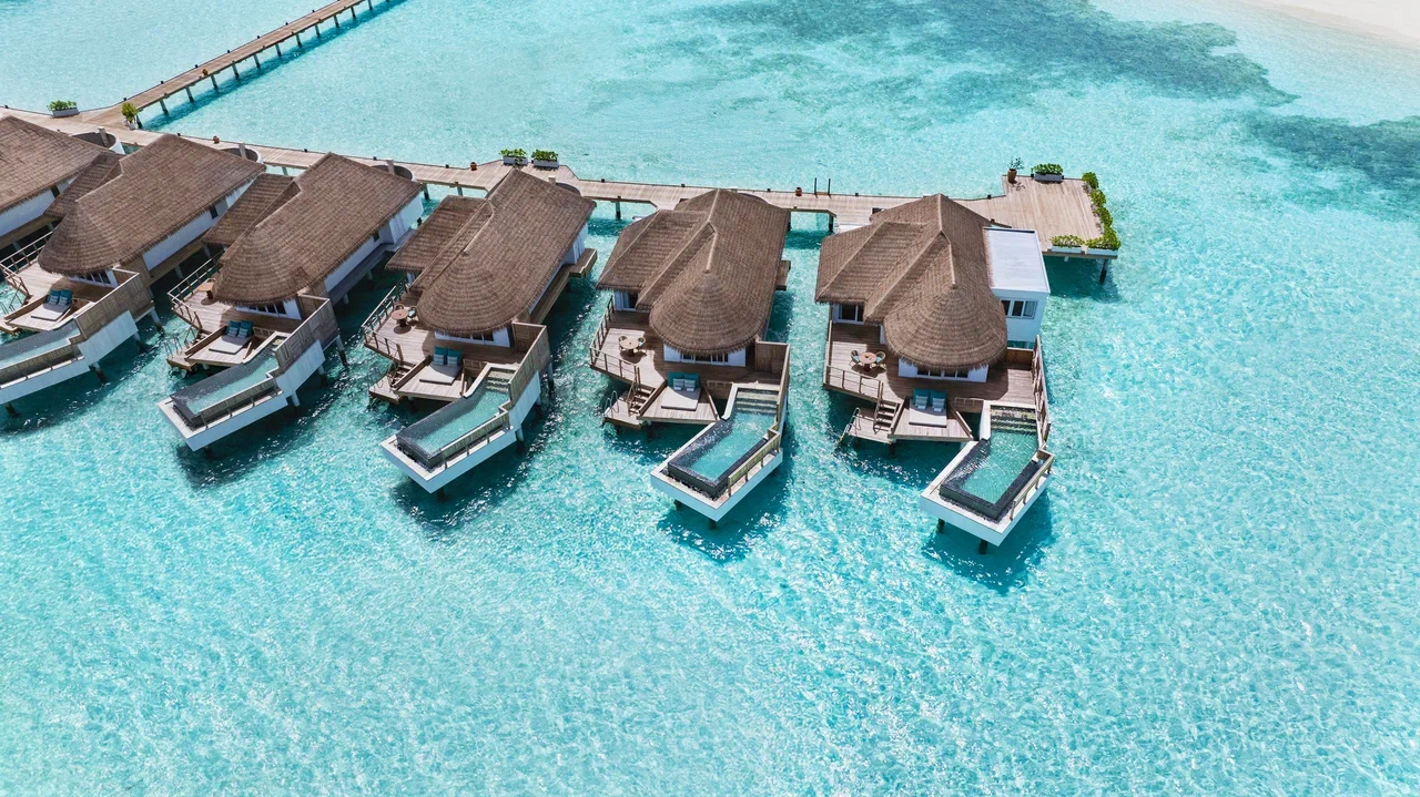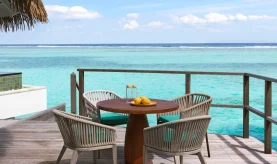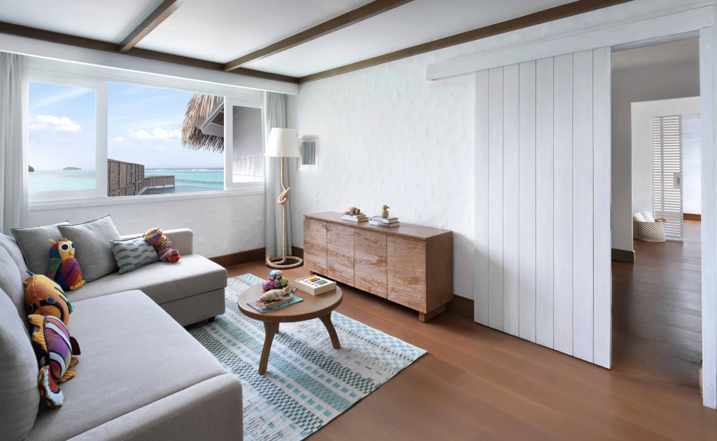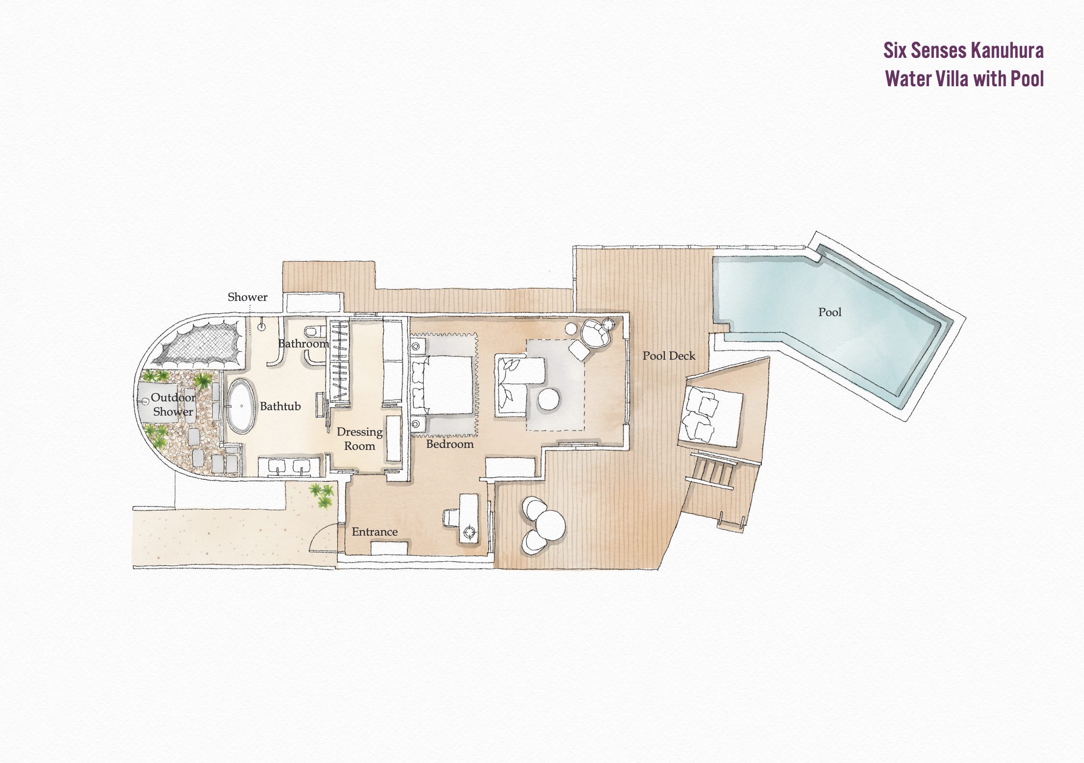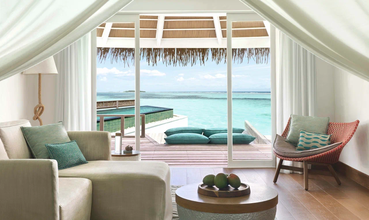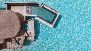 Вилла на воде. Спальня с кроватью king-size или кроватями twin и гостиной зоной, гостиная, гардеробная, 2 ванные комнаты (одна – с ванной и душевой кабиной, другая – с душевой кабиной), душ на открытом воздухе, гамак над водой, терраса с обеденной зоной и бассейном, прямой спуск к воде. Гостиная и спальня разделены дверью.