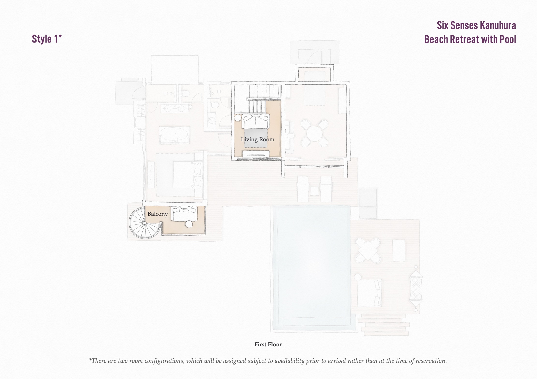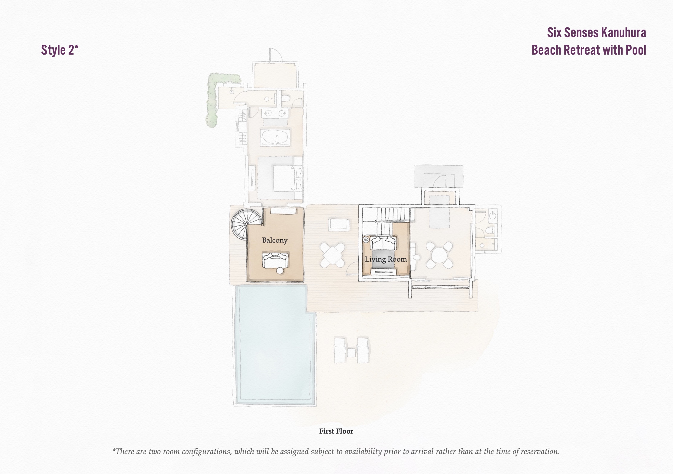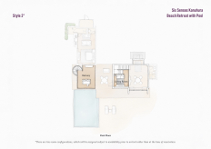 На 1-м этаже: спальня с кроватью king-size или кроватями twin, гостиная с обеденной зоной, 2 ванные комнаты (одна – с ванной и душевой кабиной, другая – с душевой кабиной), душ на открытом воздухе (на некоторых виллах), терраса с бассейном и беседкой с обеденной зоной, гамак (на некоторых виллах). Гостиная и спальня разделены дверью.
