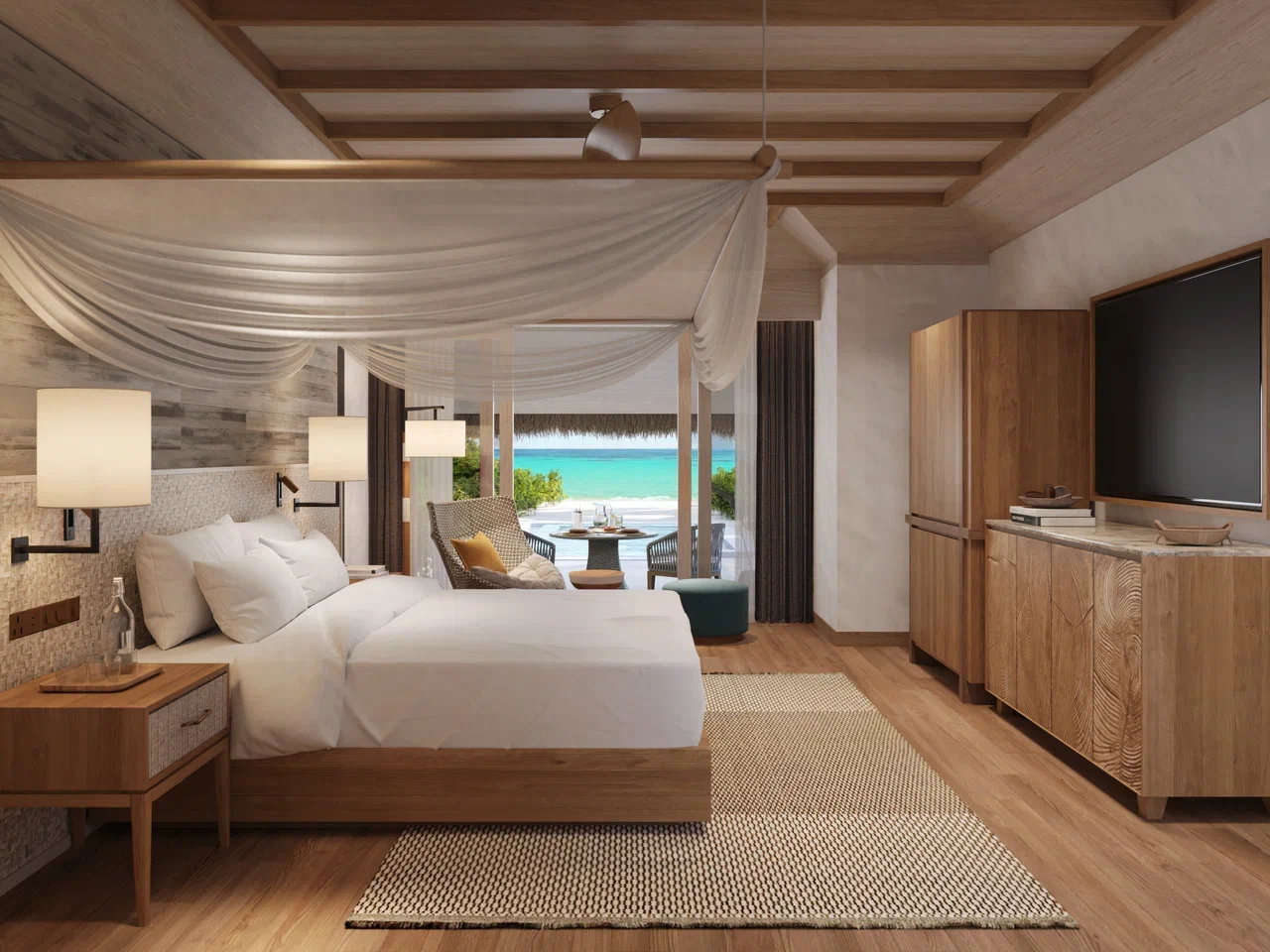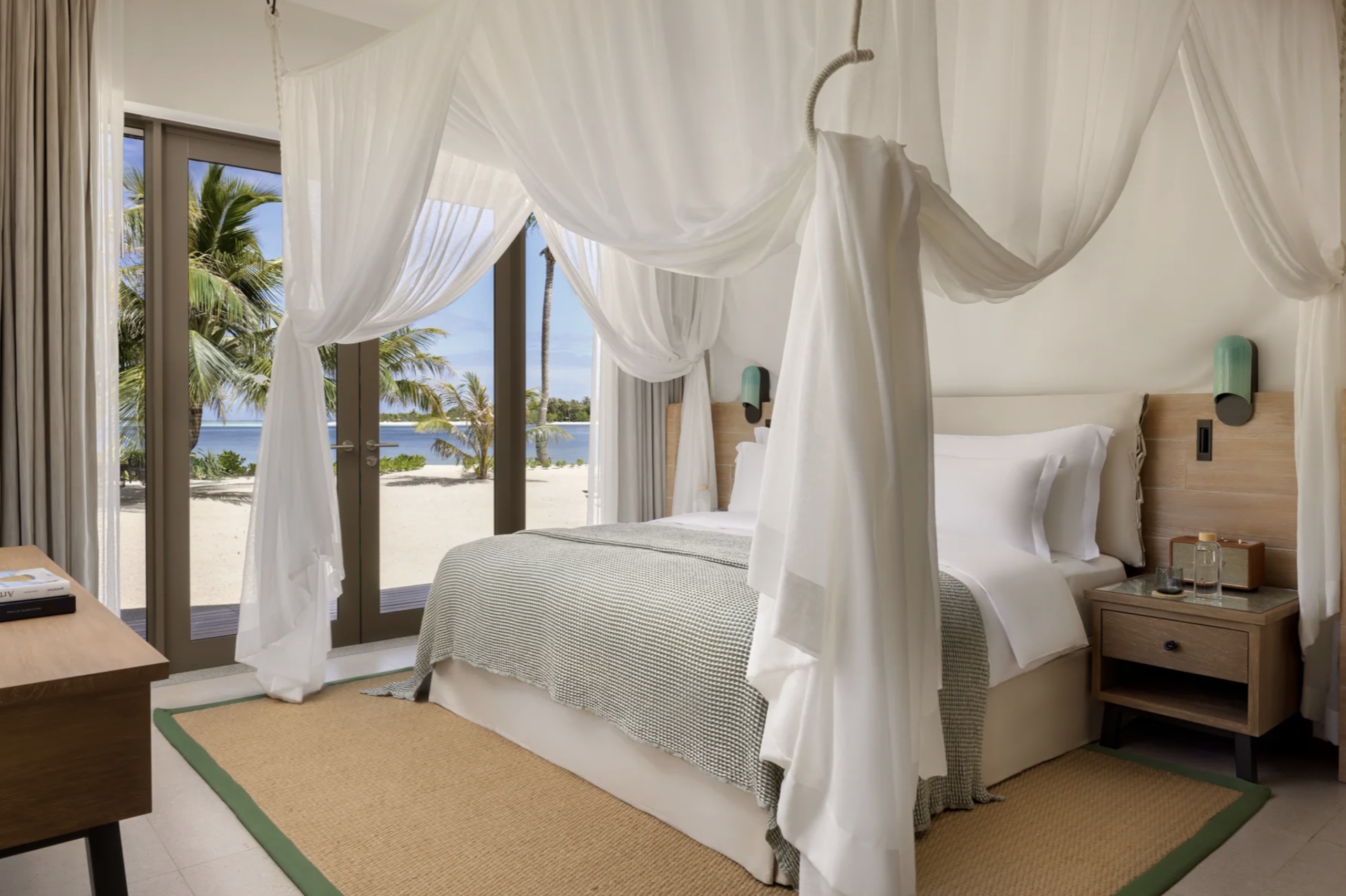 Вилла на берегу. Спальня с кроватью king-size или кроватями twin, гардеробная, ванная комната с ванной и душевой кабиной, душ на открытом воздухе, терраса с бассейном.