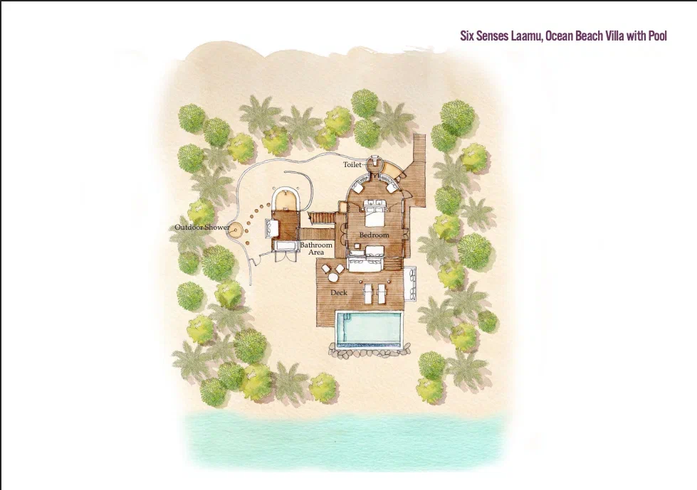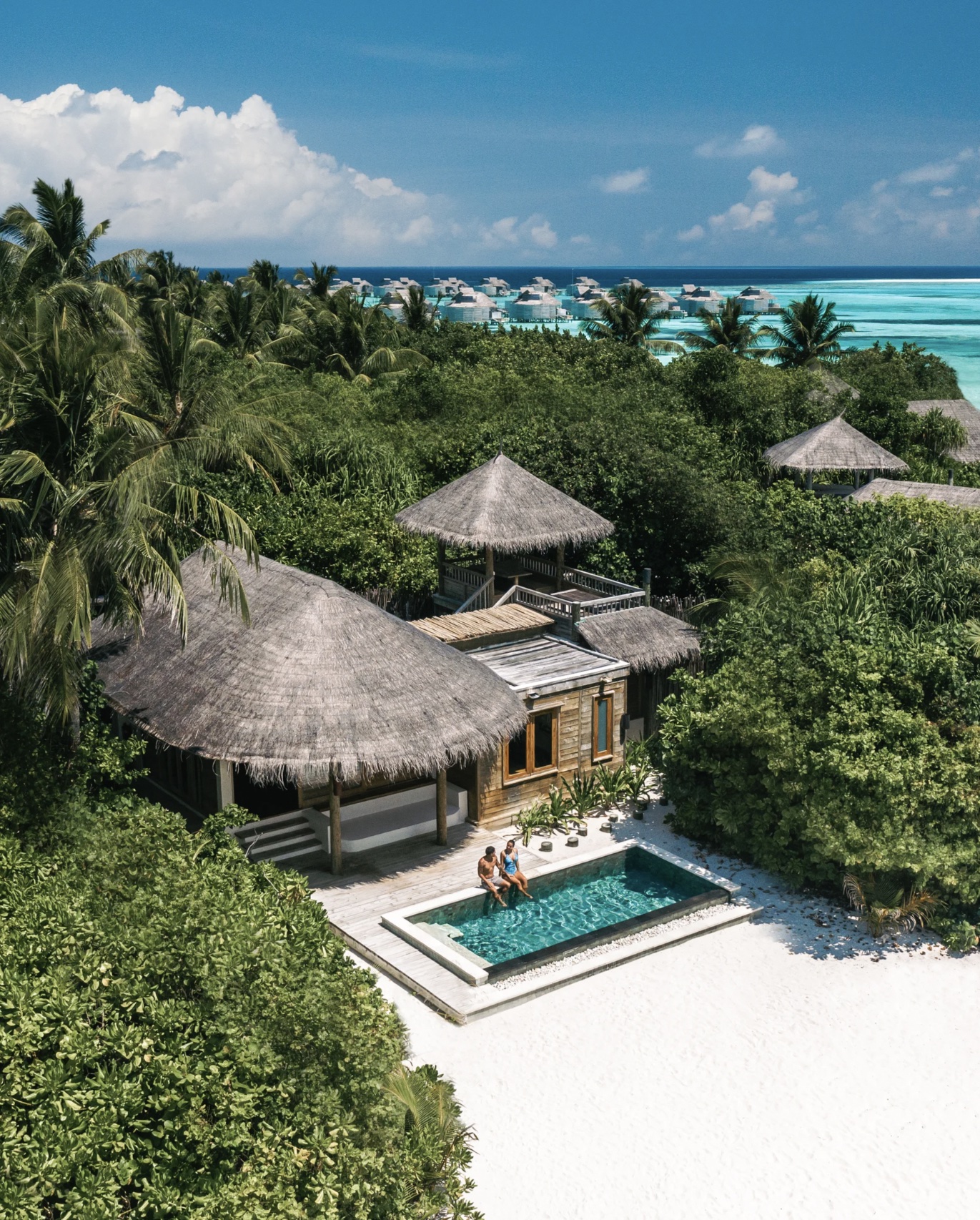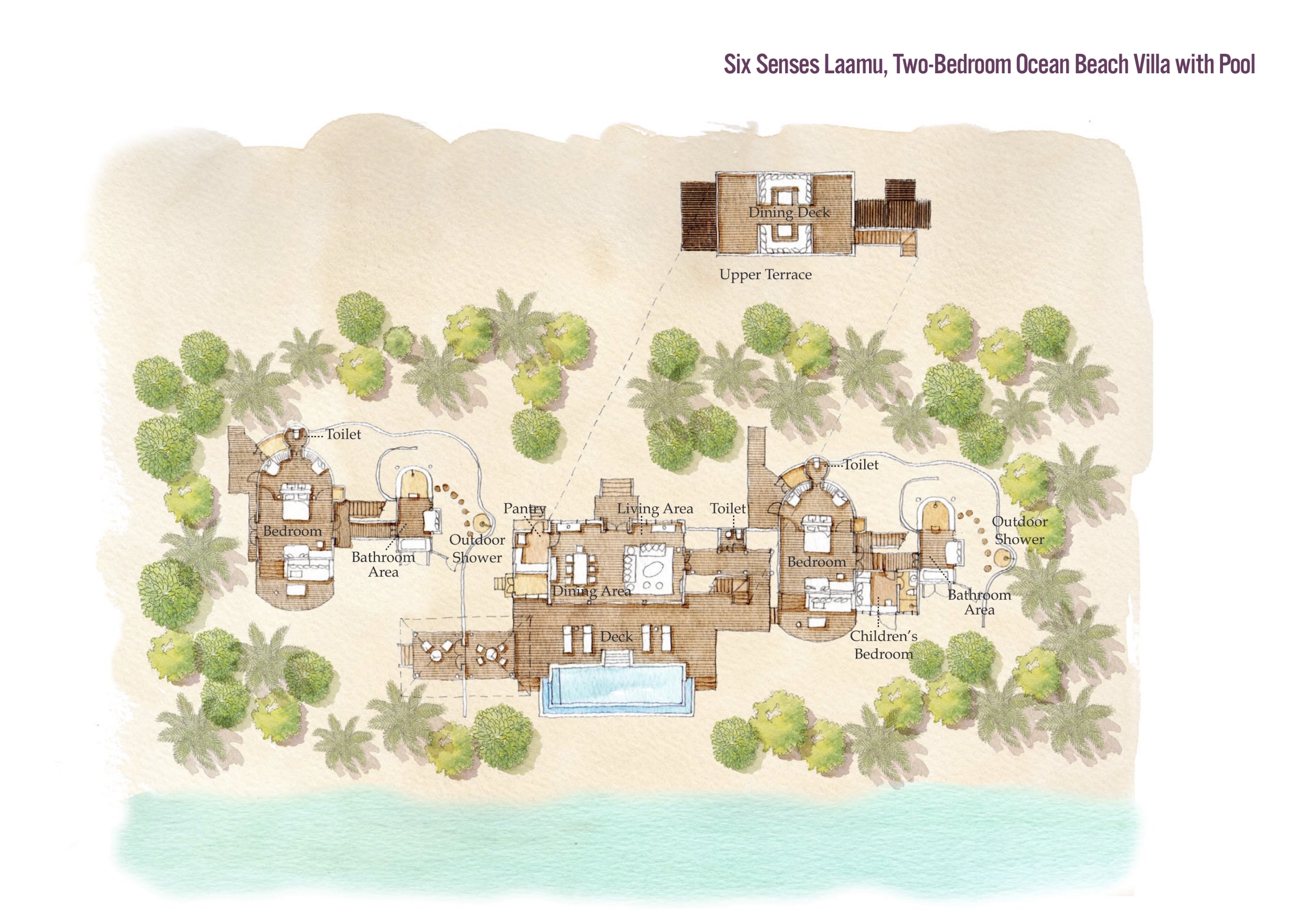 2 соединённые виллы на берегу. 2 спальни с кроватями king-size или кроватями twin, гостиная с обеденной зоной, гардеробная, 2 ванные комнаты (одна – с ванной и душем, другая – с душевой кабиной), гостевой туалет, 2 душа на открытом воздухе, частный сад, терраса с бассейном, терраса на крыше. Гостиная и спальни разделены дверями.