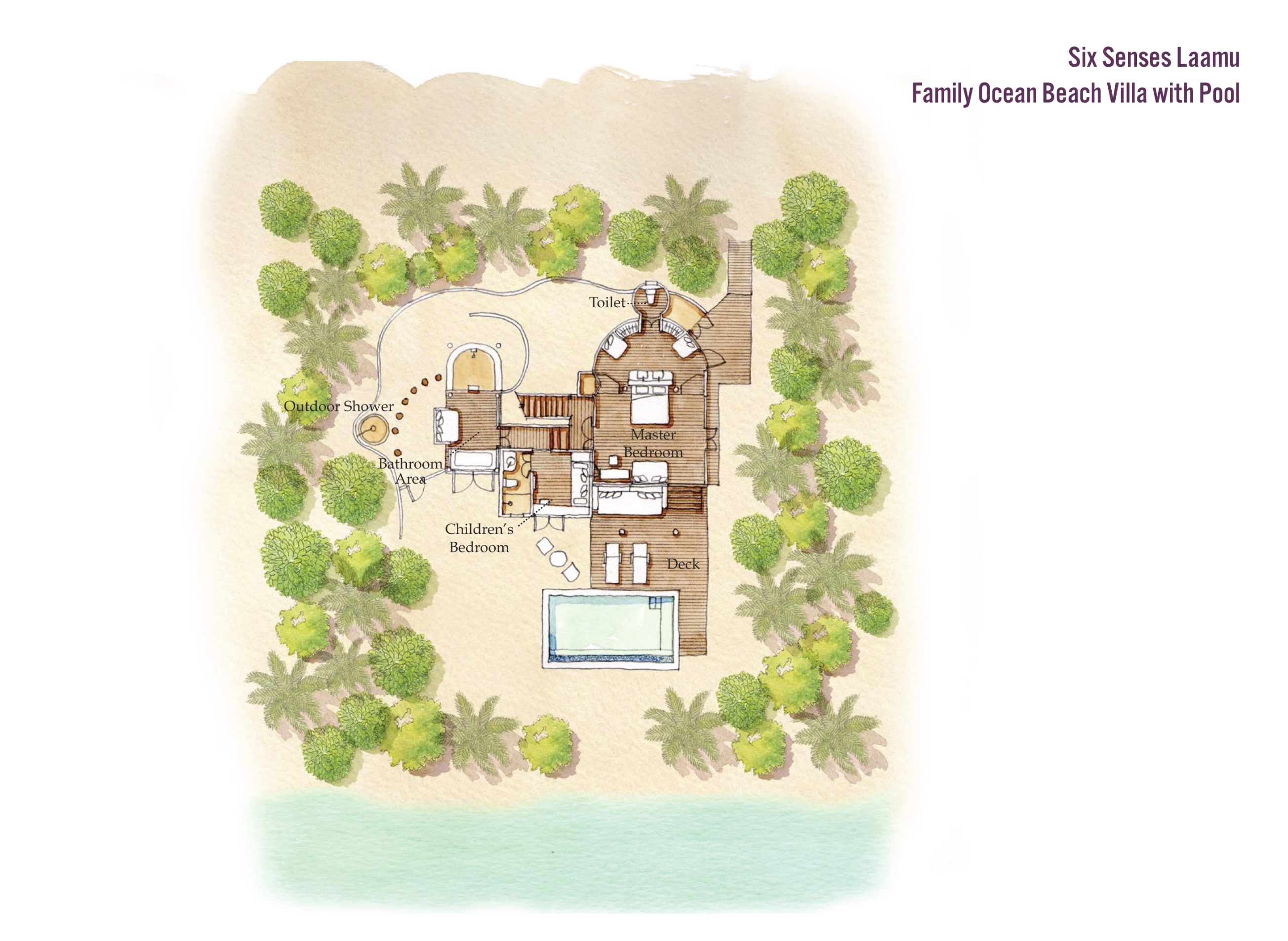 2 соединённые виллы на берегу. 2 спальни с кроватями king-size или кроватями twin, детская спальня, гостиная с обеденной зоной, кухня, 2 гардеробные, 3 ванные комнаты (две – с ванной и душем, одна – с душевой кабиной), 3 гостевых туалета, 2 душа на открытом воздухе, терраса с бассейном и беседкой, терраса на крыше с обеденной зоной. Гостиная и спальни разделены дверями.