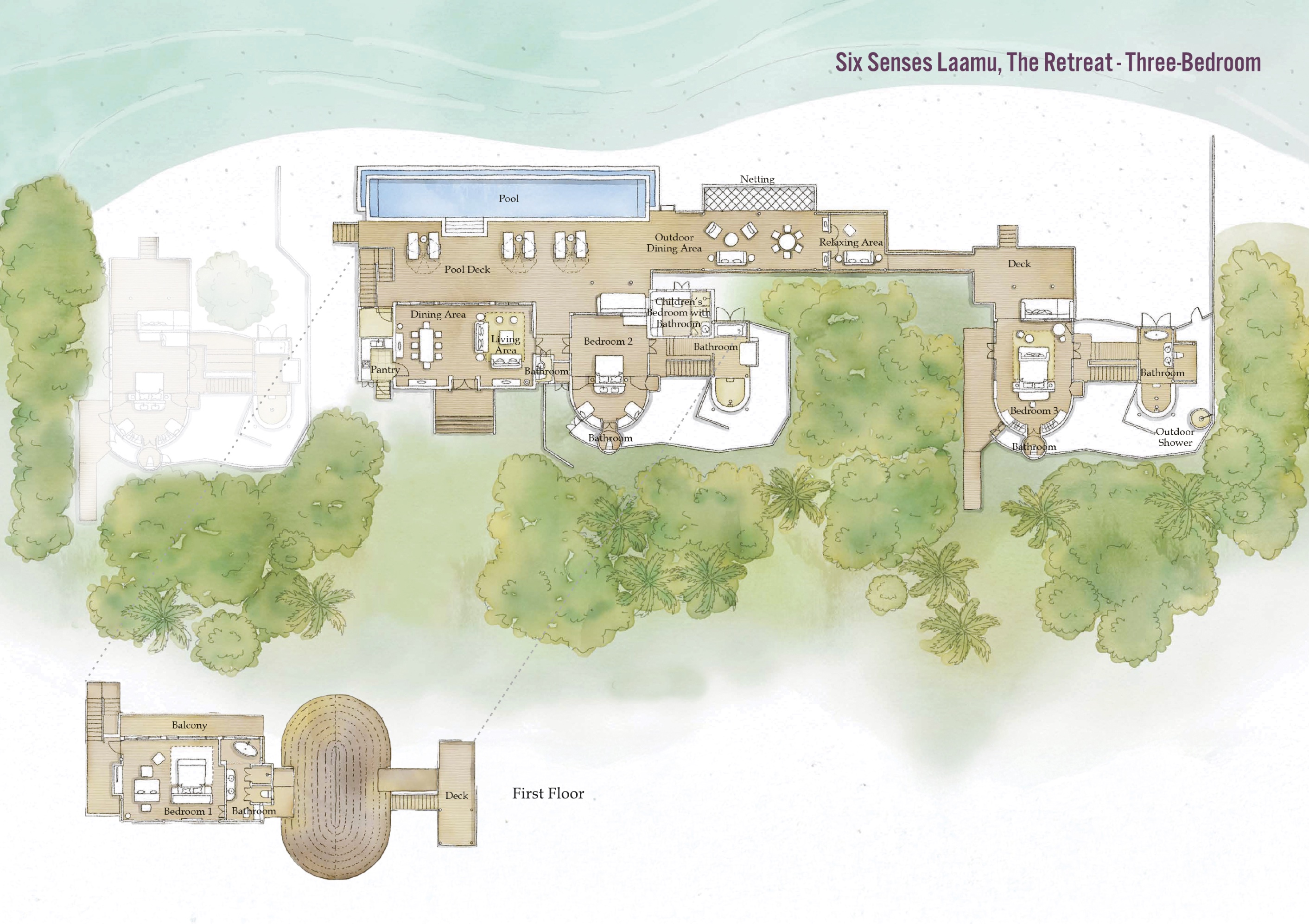 На 1-м этаже двухэтажной виллы: 2 спальни с кроватями king-size или кроватями twin, детская спальня, гостиная с обеденной зоной, кухня, 2 гардеробные, 3 ванные комнаты (одна – с ванной и душем, две – с душевой кабиной), 3 гостевых туалета, душ на открытом воздухе, терраса с бассейном, обеденной зоной на открытом воздухе и гамаком над водой. Гостиная и спальни разделены дверями.