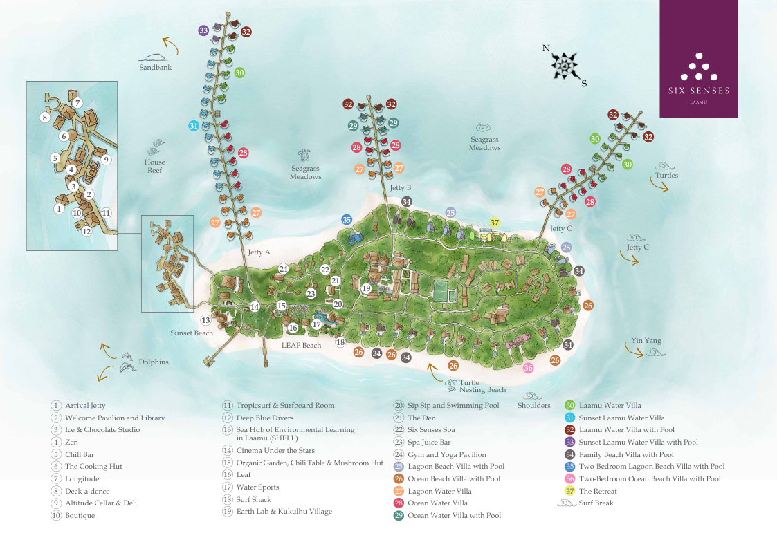 Входит в сеть Six Senses. В 2025 году получил награду Indian Ocean’s Responsible Tourism Award премии World Travel Awards. В оформлении использованы исключительно натуральные материалы: дерево, кожа, камень, лён. Большинство вилл находятся на воде. Их отличительная особенность – собственный «водный сад». Это участок лагуны, который просматривается с террасы и из углублённой стеклянной ванны. На пляже, в тропической зелени скрыты виллы с частными бассейнами и террасами на крыше. Выделяются две резиденции площадью 1,3 тыс. и 1,5 тыс. кв. м. Обе размещены на пляже, но имеют прямой выход в лагуну. У каждой – частный 20-метровый бассейн.