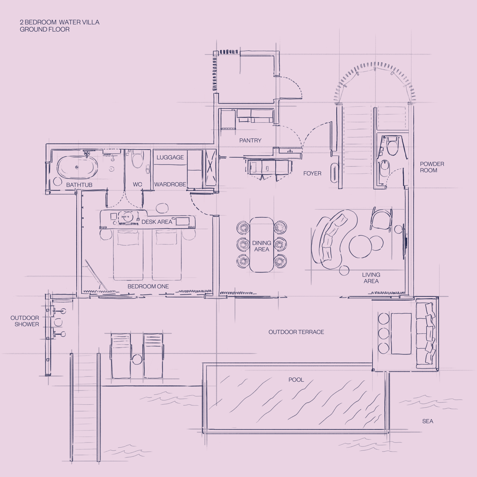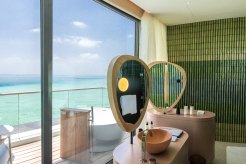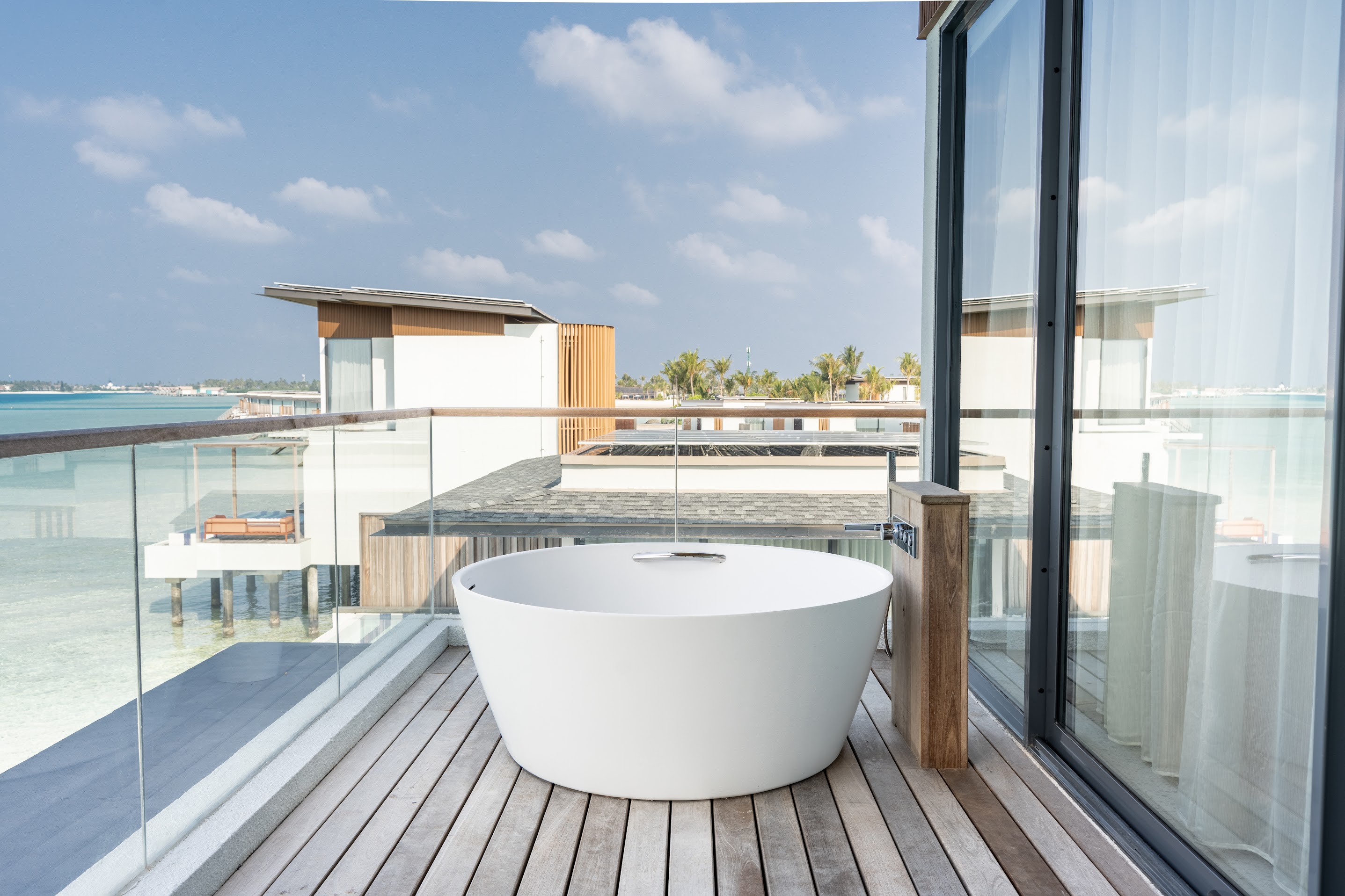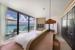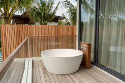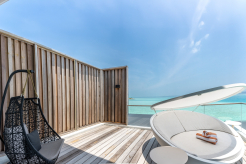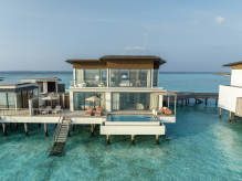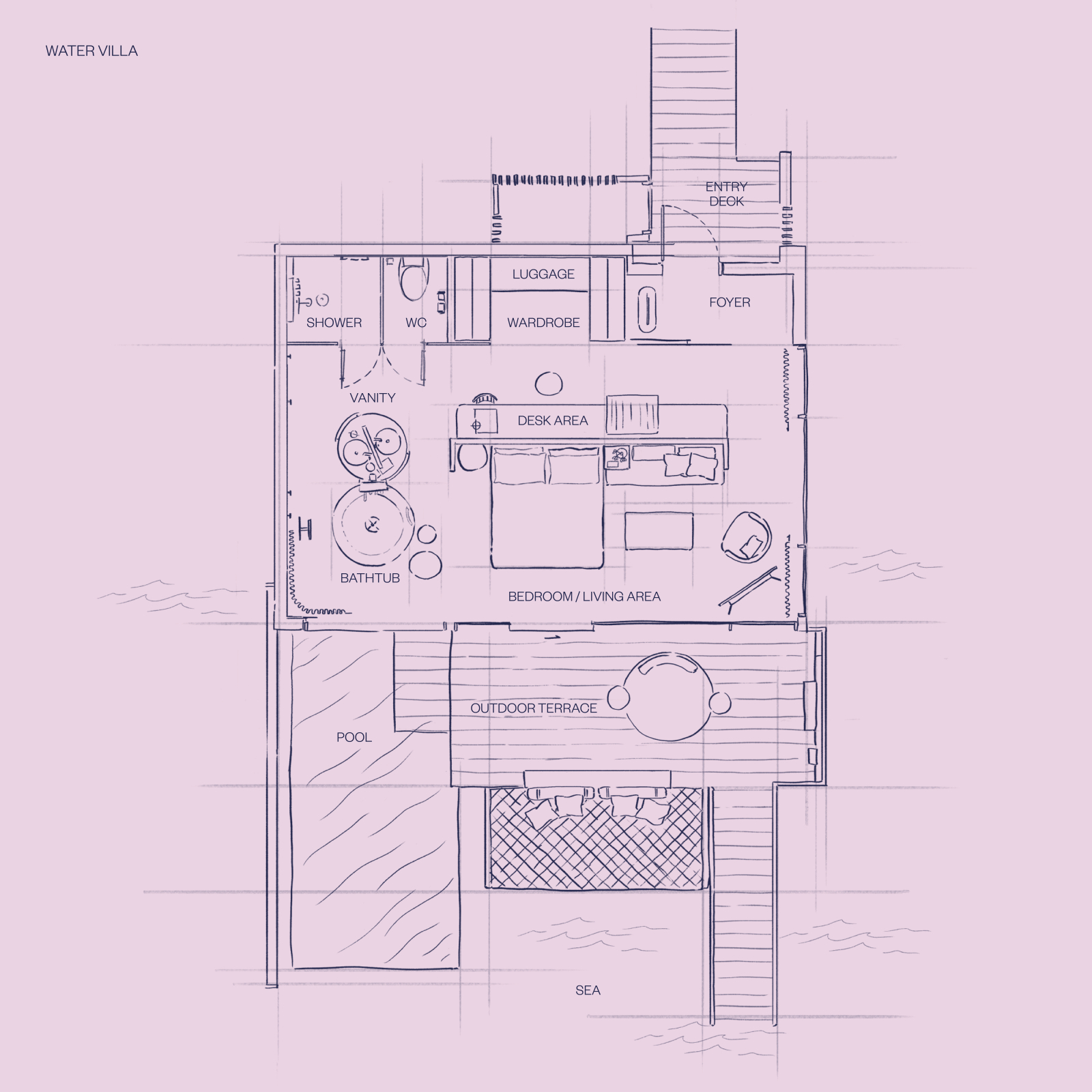 Вилла на воде. Спальня с кроватью king-size или кроватями twin, гостиная зона, гардеробная, ванная комната открытой планировки с ванной и душевой кабиной, терраса с бассейном, гамаком над водой и прямым спуском к воде.