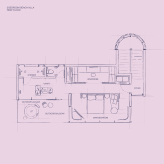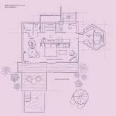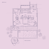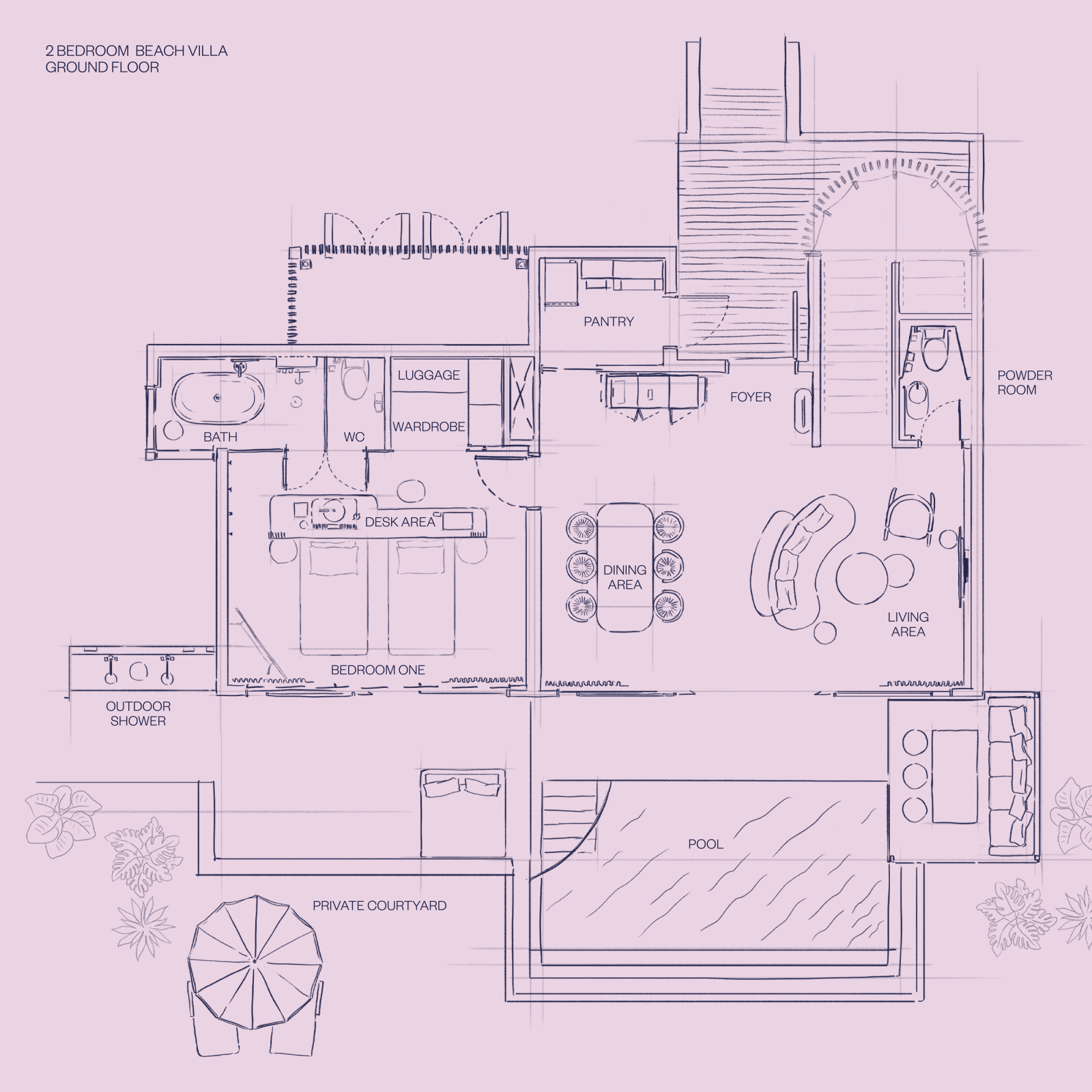 На 1-м этаже: спальня с кроватями twin, гостиная с обеденной зоной, кухня, гардеробная, ванная комната с ванной и душевой кабиной, гостевой туалет, 2 душа на открытом воздухе, терраса с бассейном и беседкой. Гостиная и спальня разделены дверью.