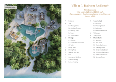 6 вилл на берегу (две – двухэтажные, три – одноэтажные, одна – на сваях, расположенная на уровне 2-го этажа) и двухэтажный спа-павильон. 5 спален, 1 детская спальня, 1 спальня для обслуживающего персонала, 7 ванных комнат, 1 туалет, 2 гостевых туалета.