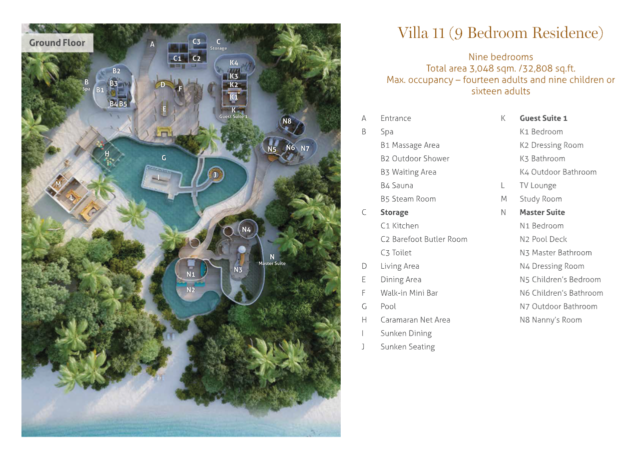 7 вилл на берегу (две – одноэтажные, две – двухэтажные, одна трёхэтажная и две виллы на сваях (одна – на уровне 2-го этажа, другая – на уровне 3-го этажа) и павильон для обслуживающего персонала. 7 спален, 1 детская спальня, 1 спальня для обслуживающего персонала, 8 ванных комнат.