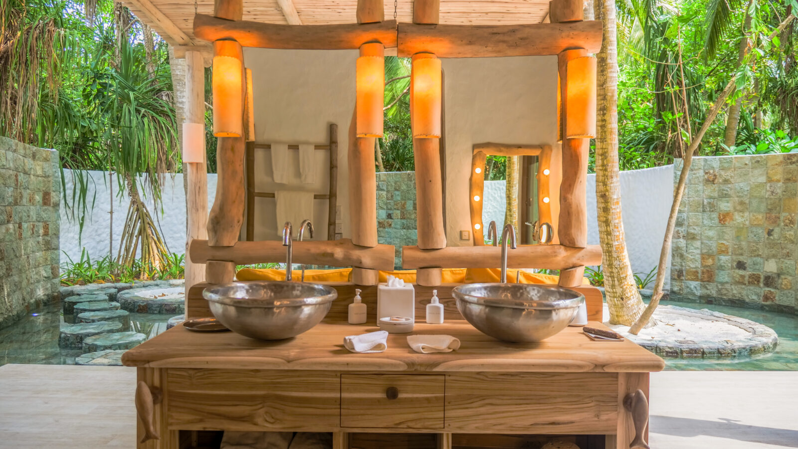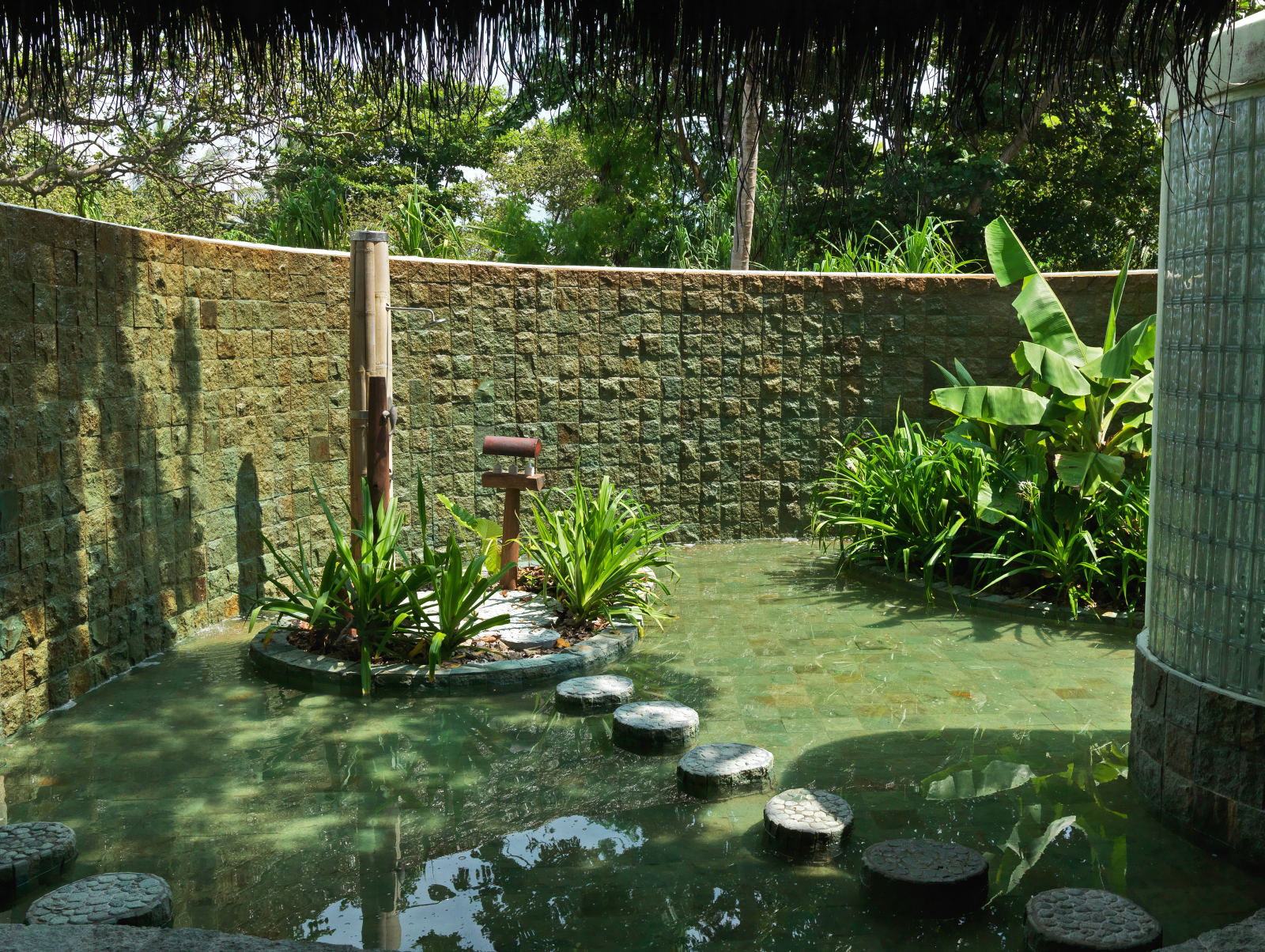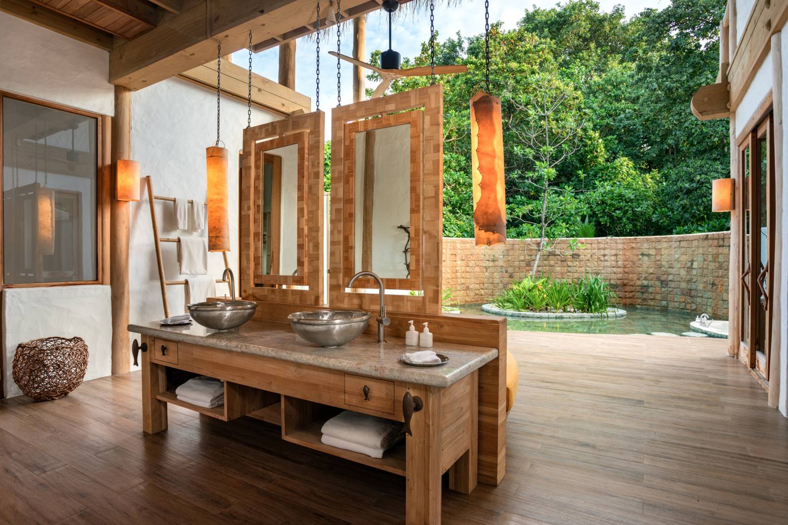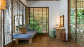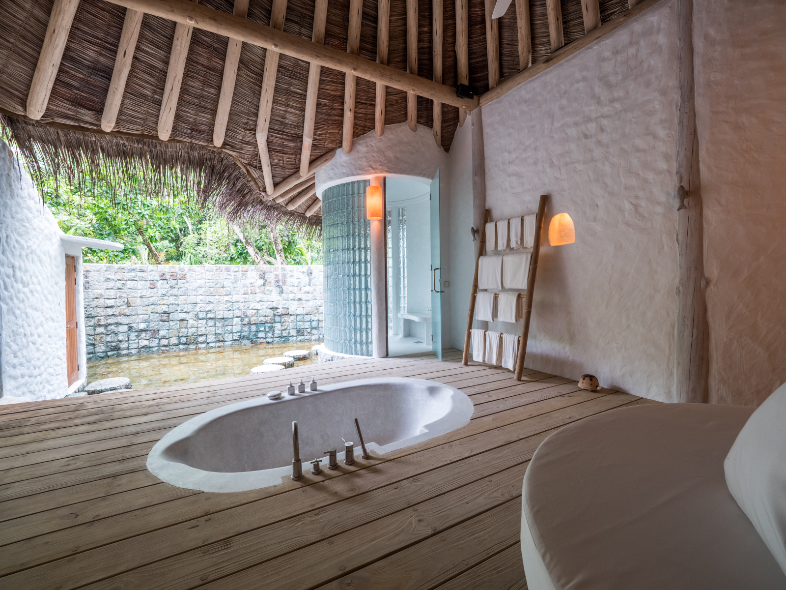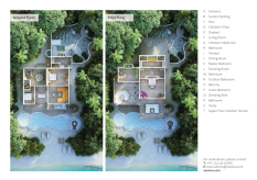 На 1-м этаже: спальня с кроватью king-size или кроватями twin, гостиная, ванная комната на открытом воздухе с ванной и душем, душевая кабина, терраса с бассейном. Гостиная и спальня разделены дверью.